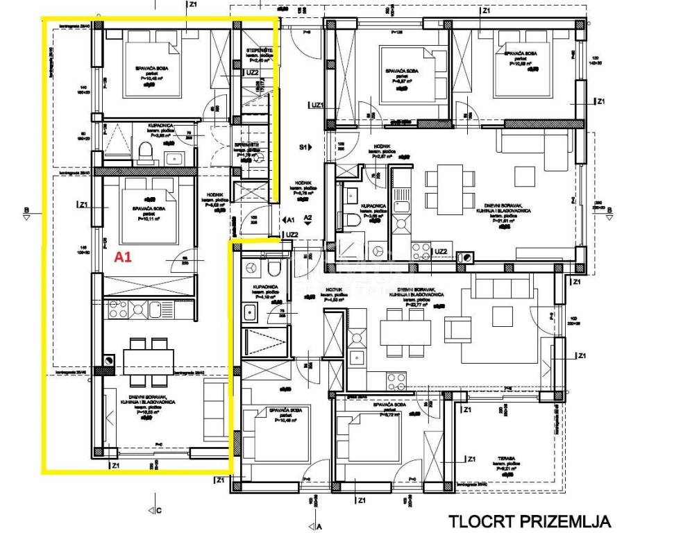 Residential unit "A1" is located on the ground floor of the building and has a usable area of 72.33 m². The apartment consists of an entrance hall, bathroom, storage room, two bedrooms and a kitchen with dining area and living room with access to a 10.50 m2 terrace. The apartment has garden of 50 m2 and one parking space. The building is located 800 m from the beach and 900 m from the city center and all-important amenities.