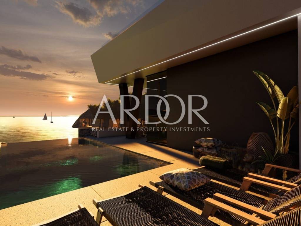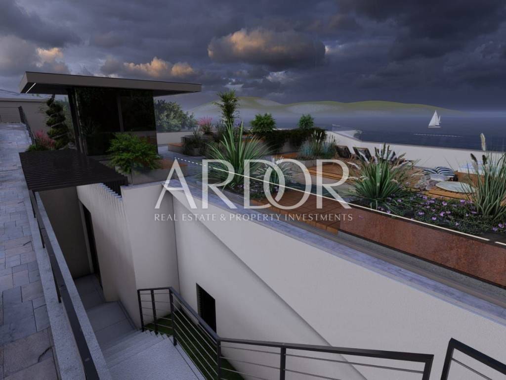 Kostrena – for sale is an attractive plot with a completed project and paid utilities, ideal for building a modern house or two separate apartments. The land is located only 10 meters from the beach and the sea, in an exceptional location above the future new marina, making it a perfect choice for exclusive living or a premium investment.