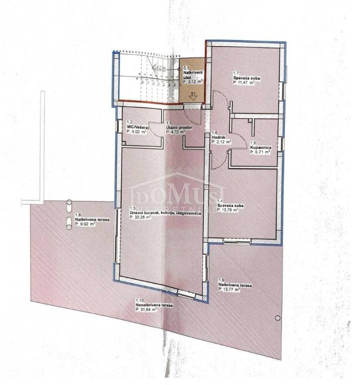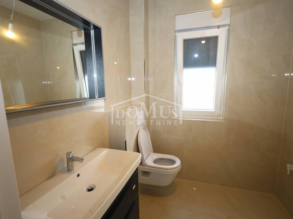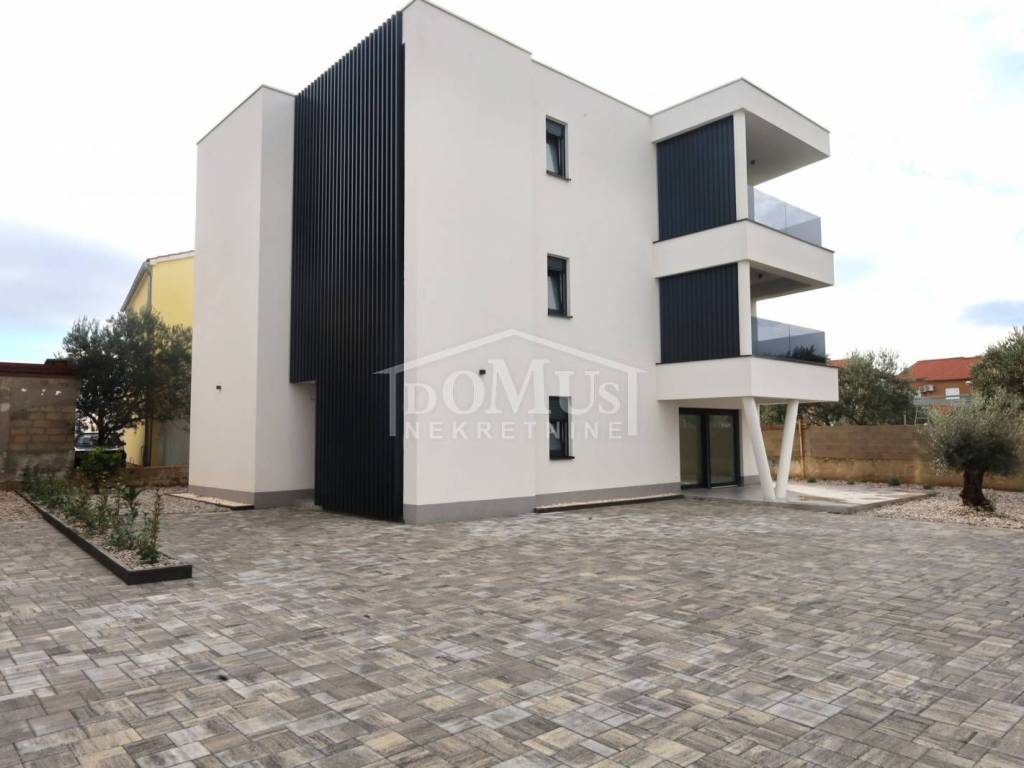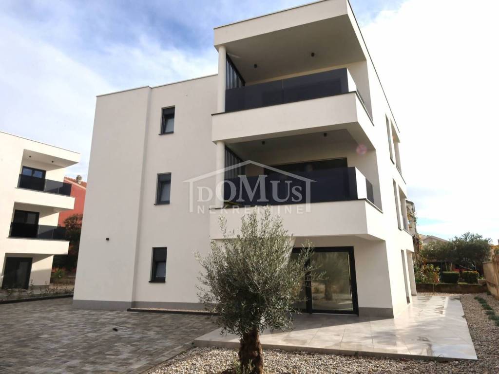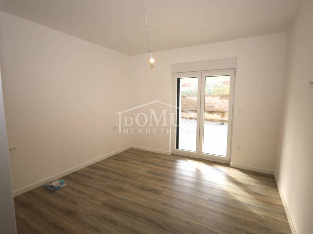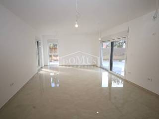 Vodice, new construction, attractive location, spacious two-bedroom apartment on the ground floor. Apartment S1 is located in a small residential building with a total of 3 apartments. It features a modern design and a functional layout, with a total of 112.18 m² of usable space. The apartment consists of a spacious kitchen with dining area and living room in an open layout, a laundry room, two bedrooms – one of which has its own bathroom – a hallway, an uncovered terrace of 31.64 m², and two covered terraces with a total area of 23.59 m². It is equipped with high-quality materials: modern ceramics and sanitary fittings, underfloor heating in the bathrooms, living room and kitchen, electric roller shutters, and air-conditioning units in the living room and all bedrooms. The apartment includes a garden of 128.08 m² and two parking spaces. It is located 600 m from the beach and 800 m from the center of Vodice.