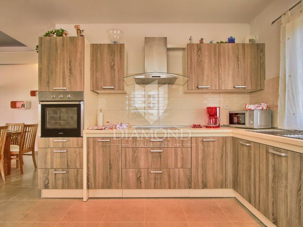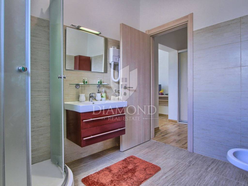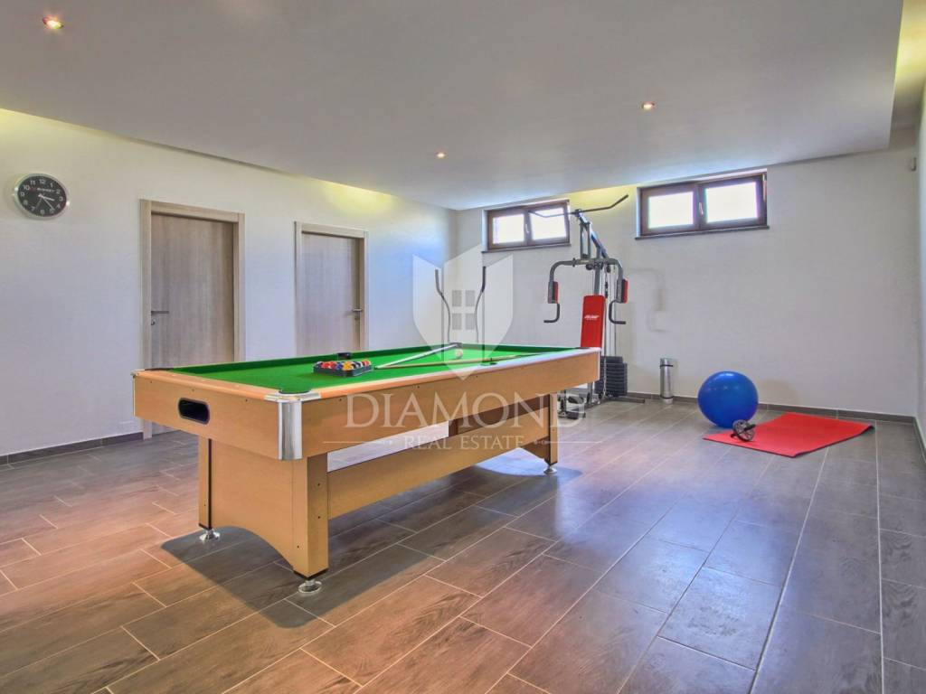 Svetvinčenat, surroundings, beautiful Villa with heated pool and jacuzzi. Beautiful Villa for sale near Svetvinčent. The medieval town of Svetvinčenat, located in the south of central Istria, is one of the jewels of Istria, where the tourist offer has been revived in recent years, especially through various events that take place in the extraordinarily attractive historical spaces of this town. This Villa with a total area of 294 square meters extends over three floors. In the basement there is an entertainment area, gym, bathroom, table football, table tennis, billiards and darts. Internal stairs lead to the first floor, where there is a living room with a kitchen and dining room, a bedroom with its own entrance hall and bathroom, and another guest bathroom. The living room leads to a covered terrace with a view of the swimming pool and garden. On the second floor, there are three more rooms, each with its own bathroom, and one room has access to a balcony with a view of the pool and the sea in the distance. All rooms have air conditioners and SAT/TV. A central heating system is provided throughout the building. The villa is fully furnished and equipped with modern furniture, and is being sold as such. On the spacious garden of 1996 square meters, there is a large heated swimming pool, a sun deck, a covered grill fireplace with a sitting table, a jacuzzi, covered parking for two cars, and additional parking for two more vehicles, a children's playground with swings, a slide and a climbing frame. There are also additional facilities such as mini-golf, multifunctional field (16x8m) with mini football, basketball, volleyball. The yard is surrounded by a 1.2m to 2m dry stone wall, so peace and privacy are guaranteed here. The villa has an alarm system and video surveillance. It is categorized for 8+2 people, and is rented during the season and has excellent occupancy. The property is located in a very attractive location in the very center of the Istrian peninsula, surrounded by villas and holiday homes, and in addition to the location, the quality and facilities offered by the property make it an excellent opportunity for investment in the tourist rental business, which ensures the new owners a return on the invested money through rent.