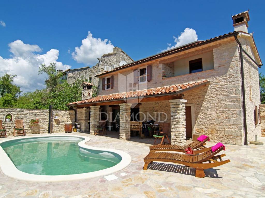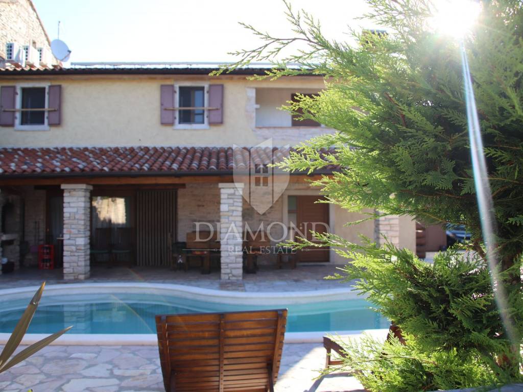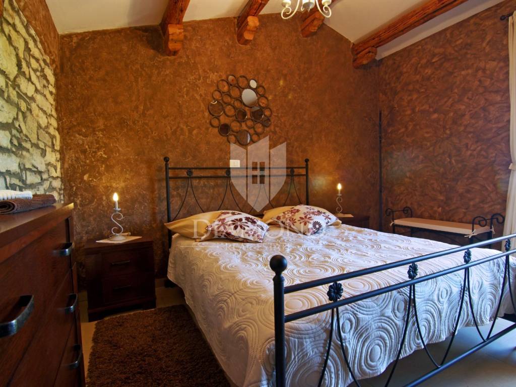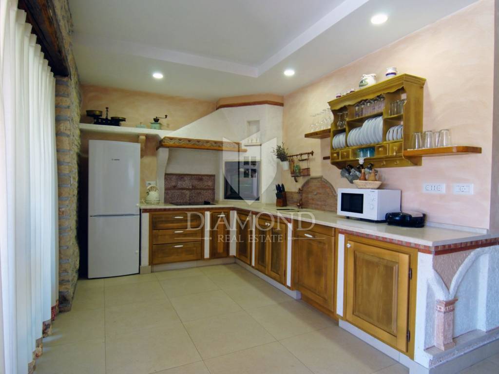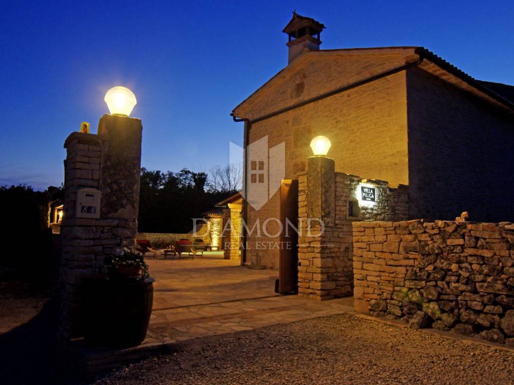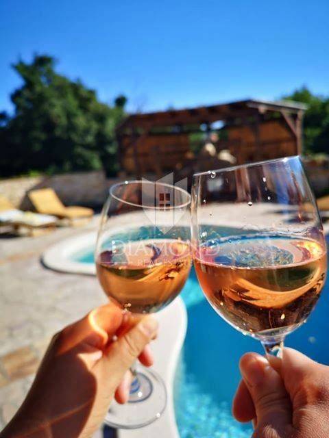 Near Barban, this holiday villa with pool is for sale. Barban is a small historical place located halfway between Labin and Pula. It is known for the knight's game "Race to the Ring", which in recent years has become a trademark of the place, and is one of the most famous summer events in Istria. This traditional stone villa is located near Barban, in a small quiet village, overlooking the greenery of nature. The villa was completely restored in 2014. The stone used to build the Villa was brought from around the village, restored with quality materials, and many original elements have been preserved, such as old tiles in the living room. Traditional construction, especially natural stone and wood, is largely respected. The villa has two floors. The ground floor has a living room with fireplace, kitchen with dining area and bathroom. Upstairs are three more bedrooms and a bathroom. One room opens onto a terrace with a beautiful view of the surrounding hills. The villa has underfloor heating and all rooms are air conditioned. It is furnished and equipped with quality furniture, and as such is sold. This Villa is one of the first holiday homes in Istria to be awarded the Eco Domus certificate, namely in 2018 it was named the best Eco house in Europe. It is special and certainly for the photovoltaic system of electricity production with legalized return to the grid. Both the interior of the Villa and the exterior have been immaculately maintained. In the yard there is a modern pool of German quality, sun deck, and a covered terrace with barbecue, where you can enjoy the warm summer months. The yard is surrounded by stone walls, and peace and privacy is guaranteed here. Beautiful traditional Istrian Villa, ideal for a quiet family life, or for rent, where the owner already has a well-established business.