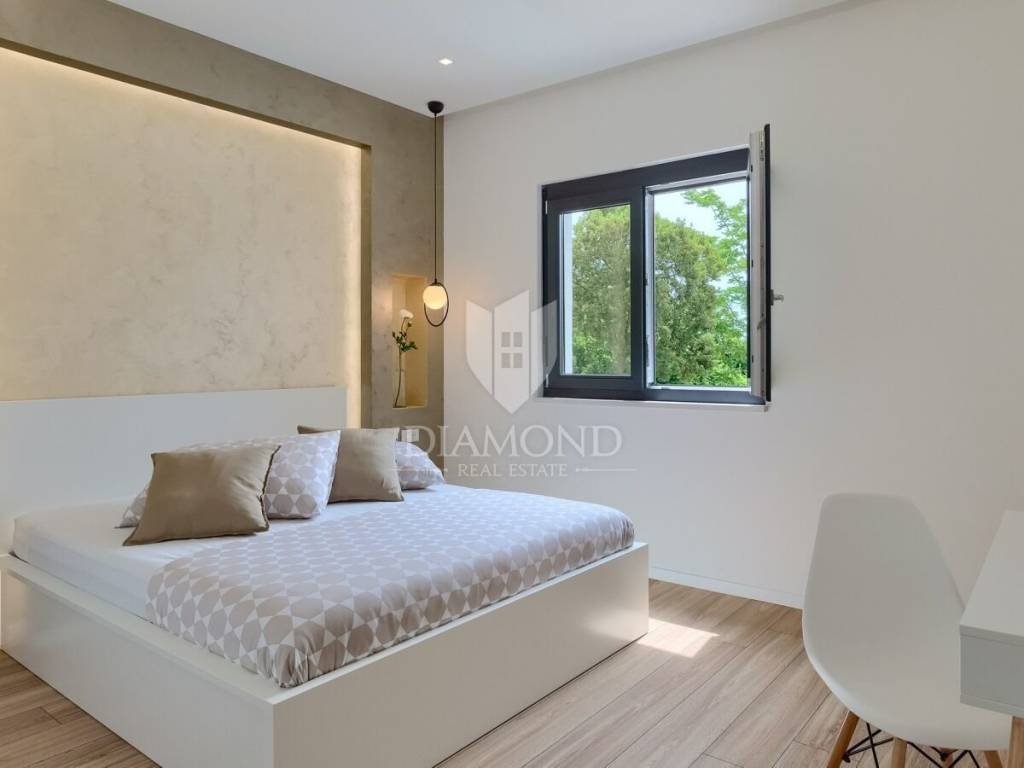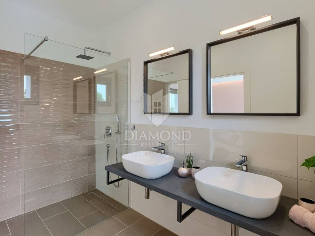 Barban, surroundings, we are selling a newly built modern holiday house. Only 7 kilometers from the small town of Barban, famous for its knightly game - Race to the Ring, is located this beautiful holiday home of modern design. The house consists of ground floor and first floor and has a total living area of 160 m2. The ground floor consists of a spacious living room with access to the pool terrace, dining room and fully equipped kitchen, there is also a guest toilet and storage. The first floor is a night part with three bedrooms, each with its own bathroom. Two bedrooms have access to a balcony with a beautiful view of the surrounding greenery and nature and in each bedroom as well as in the living room there are air conditioners. In addition to the air conditioning, in the living room there is a beautiful indoor wood burning fireplace. The garden with a total area of 600 m2 is fully fenced and arranged. There is parking for two cars, a beautiful covered summer kitchen overlooking the pool and garden, and a pool of 32 m2. The house is a good opportunity for business investment as it has a well-established tourist rental business and generates excellent income during the summer season. The first shop and restaurant are 1 km away, while the first beaches and the sea are 17 km away. Pula Airport is only 25 km away.