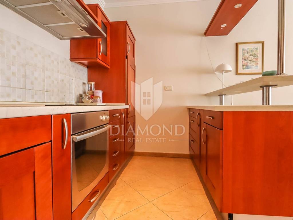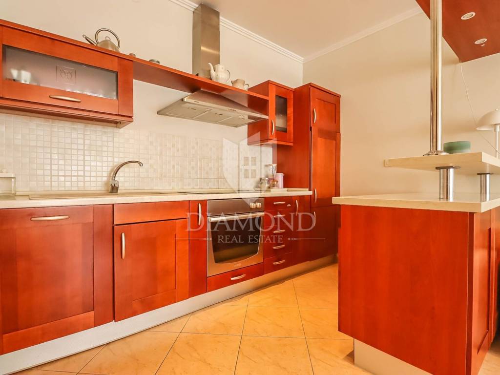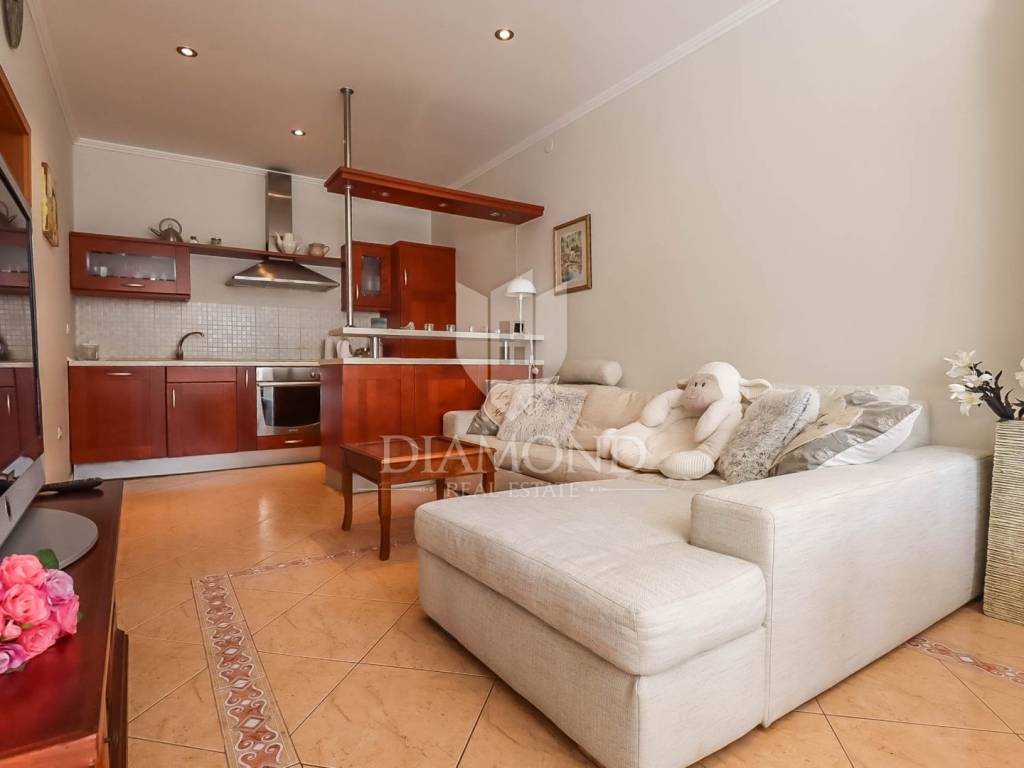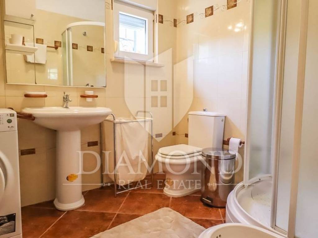 This apartment is located on the ground floor of a residential building with a total area of about 110m2 and consists of open space with living room, kitchen and dining room. One spacious bedroom and bathroom and a smaller pantry. The advantage of this apartment is that a larger room in the basement is designed as a tavern with an additional kitchen, large fireplace and another bathroom and is ideal for various gatherings with friends and family. As part of the common garden, there is a part that can be used with a loggia as well as an additional terrace.