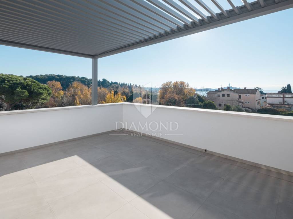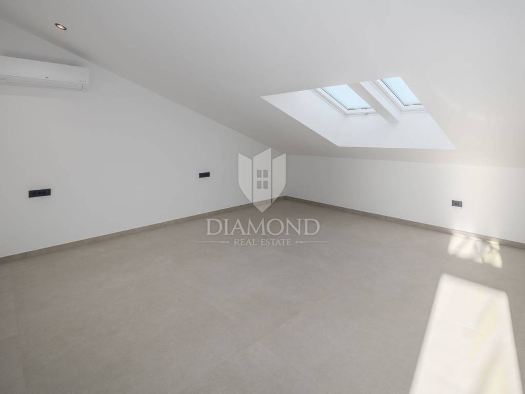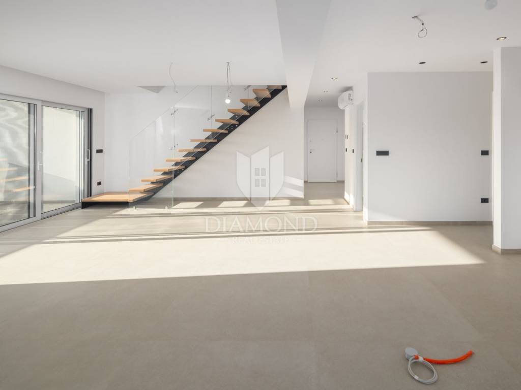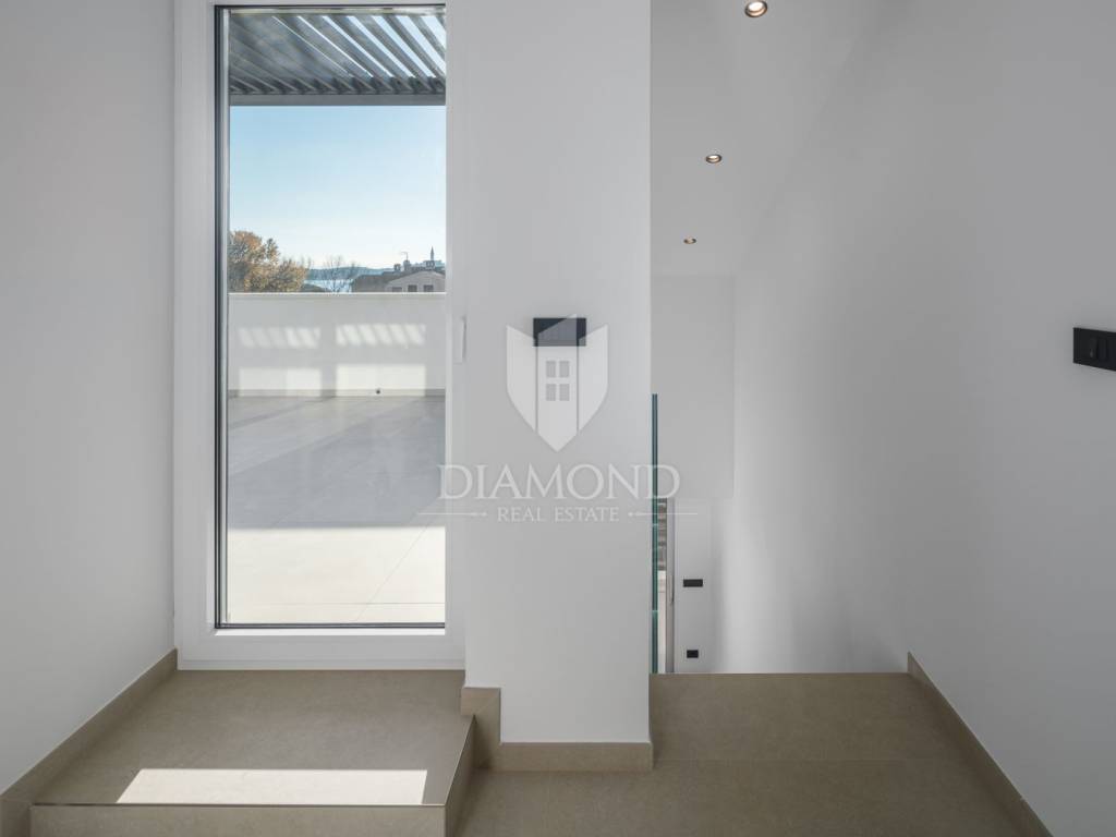 The apartment is situated on the first floor of a modern building and spans two levels, connected by internal stairs. It comes with two parking spaces in the underground garage and a storage room in the basement. On the first level, you enter a hallway that leads to a spacious living room with a kitchen and dining area. There are also two bedrooms, one of which has its own bathroom, an additional toilet, and another bathroom. The living room opens onto a balcony. On the second level, there are two larger bedrooms, another bathroom, and an uncovered terrace offering spectacular views of the sea and Rovinj's old town. The apartment is equipped with flooring and underfloor heating powered by city gas, air conditioning, security doors, and electric shutters. The building features stairs and an elevator, ensuring convenience and comfort. Special attention has been paid to every detail and the quality of construction, making this apartment perfect for family living or as an investment with high potential for tourist rental.