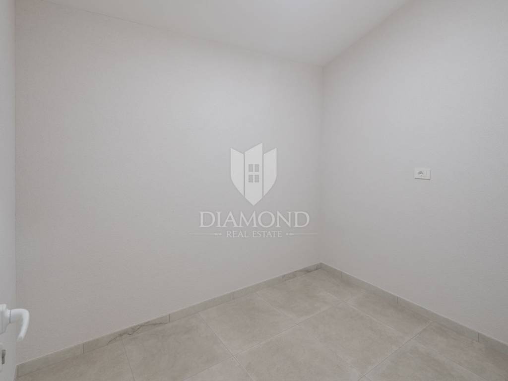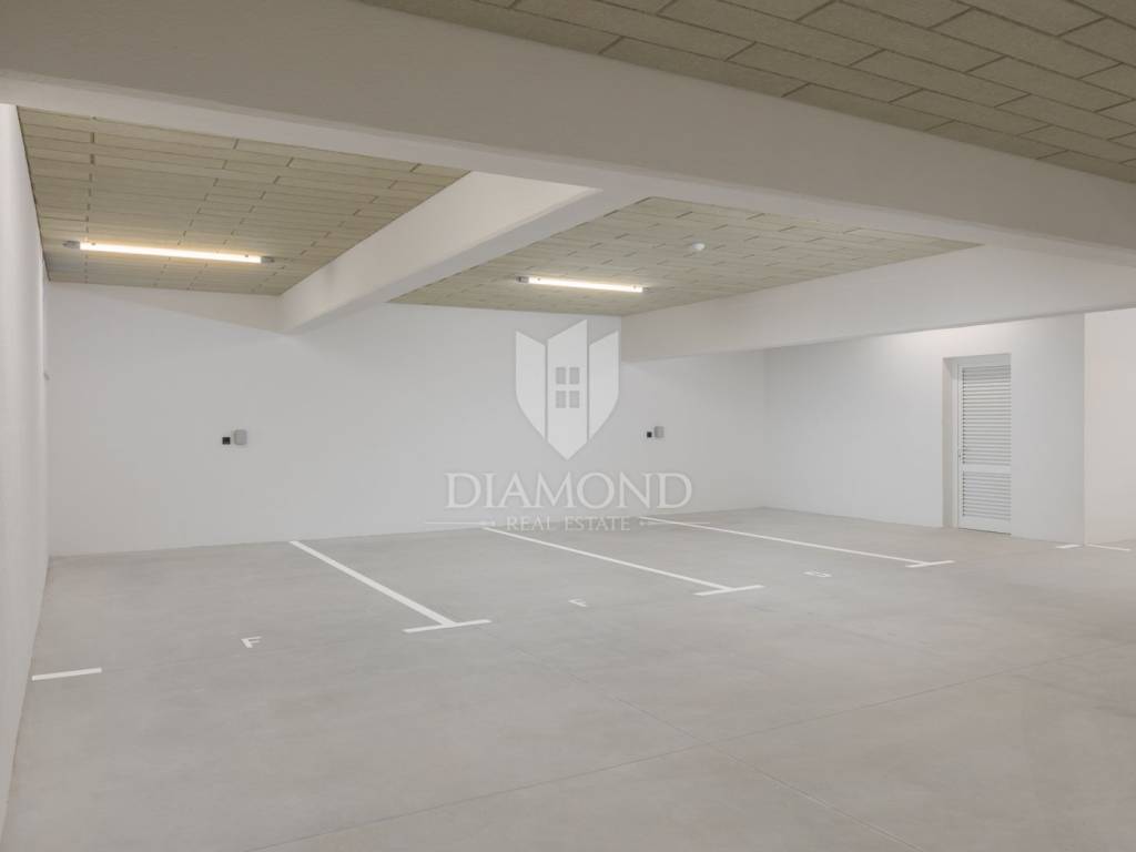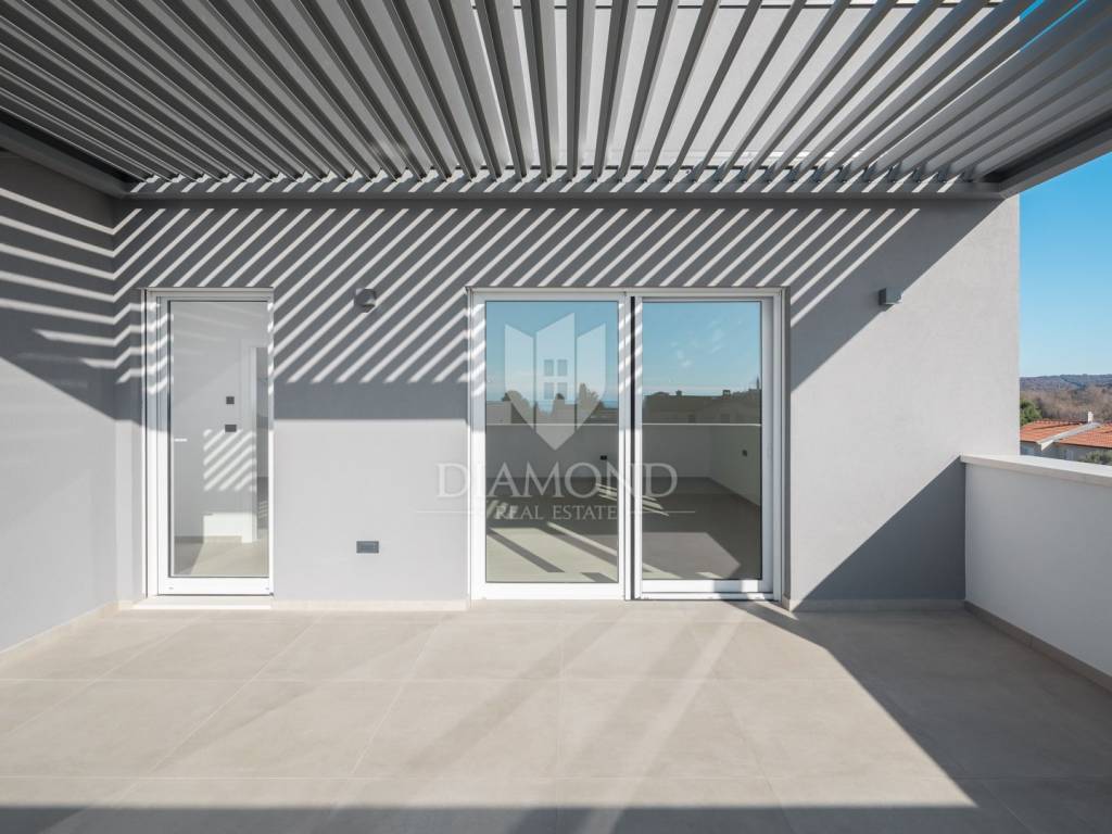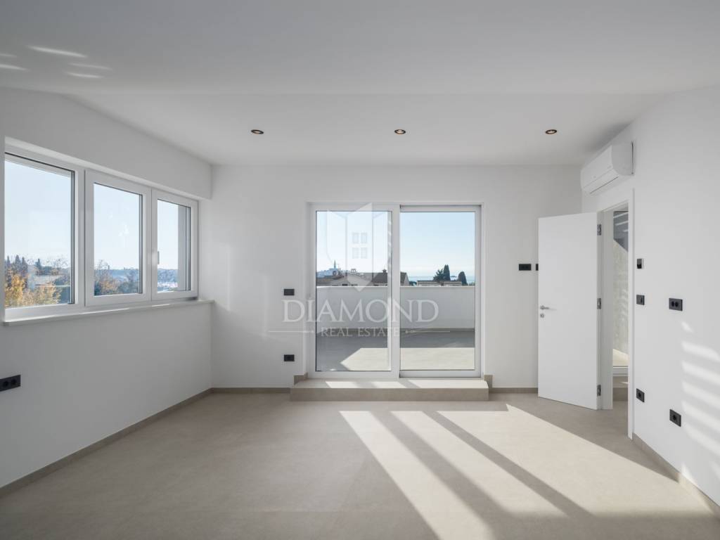 The apartment is situated on the first floor of a modern building and spans two levels, connected by internal stairs. It comes with two parking spaces in the underground garage and a storage room in the basement. On the first level, you enter a hallway that leads to a spacious living room with a kitchen and dining area. There are also two bedrooms, one of which has its own bathroom, an additional toilet, and another bathroom. The living room opens onto a balcony. On the second level, there are two larger bedrooms, another bathroom, and an uncovered terrace offering spectacular views of the sea and Rovinj's old town. The apartment is equipped with flooring and underfloor heating powered by city gas, air conditioning, security doors, and electric shutters. The building features stairs and an elevator, ensuring convenience and comfort. Special attention has been paid to every detail and the quality of construction, making this apartment perfect for family living or as an investment with high potential for tourist rental.