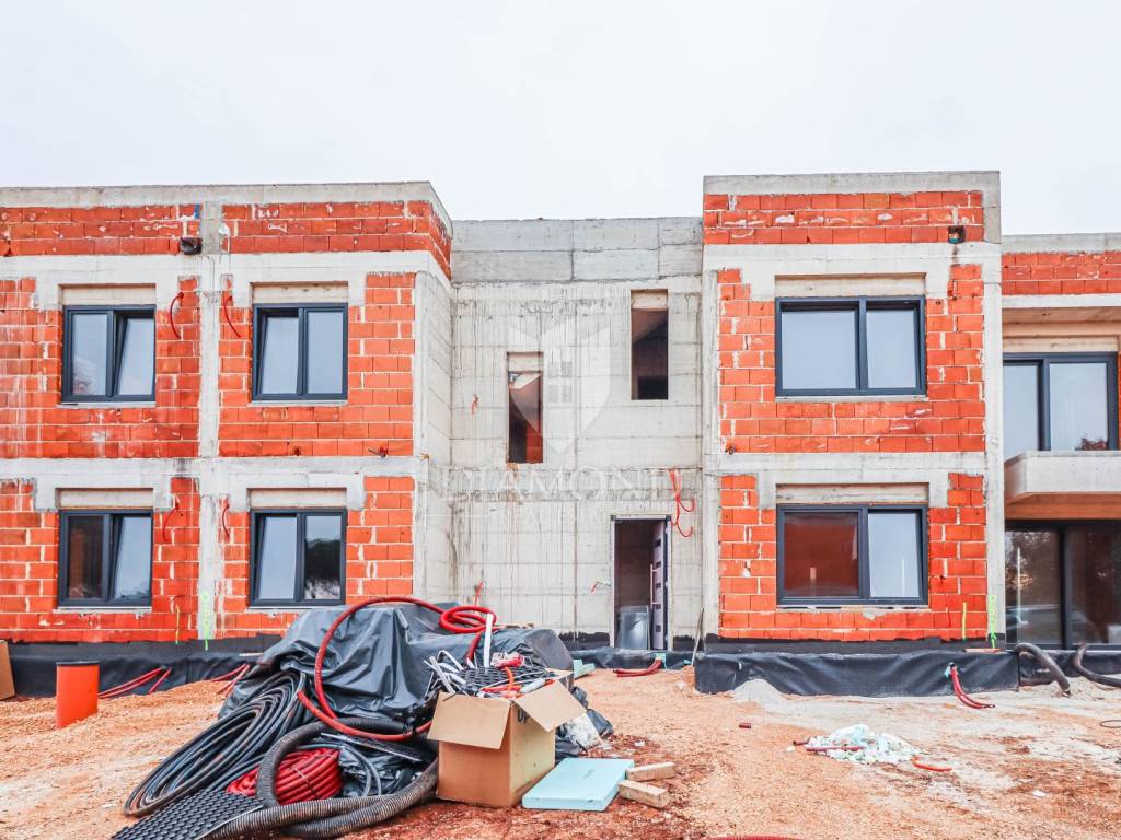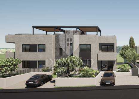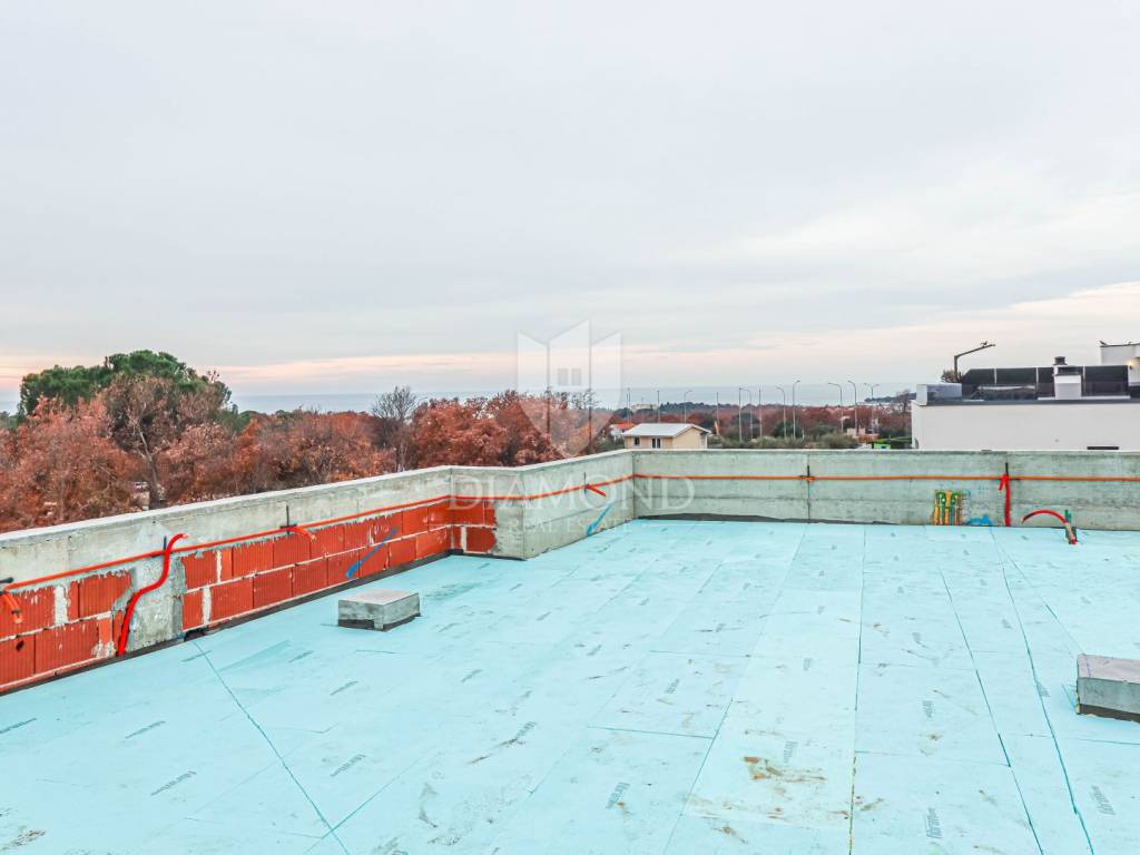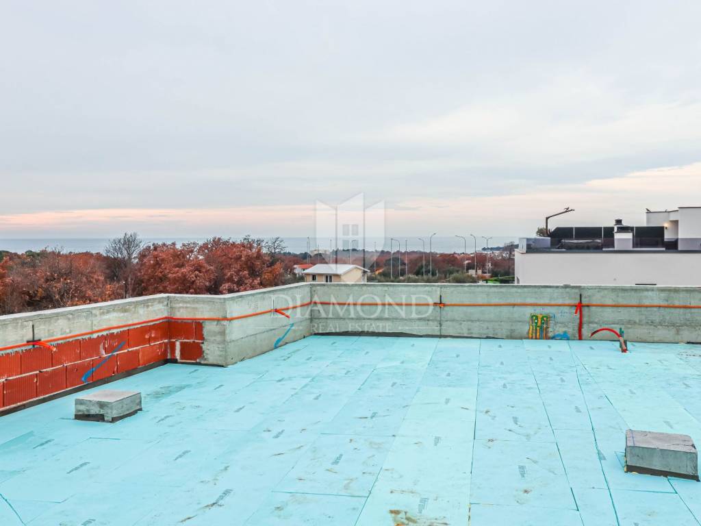 Its surface is 137.57 m2. Upon entering the apartment, we come to a hallway with a wardrobe that leads to a spacious living room where there is a kitchen with a dining area and an open living room. Glass walls have been installed throughout the living area, which allow a large flow of light into the space. From the living room there is access to a covered terrace of 7.65 m2. There are also three spacious bedrooms, one of which has its own bathroom, and another additional bathroom. An elegant staircase leads to the spacious roof terrace of 87.21 m2, of which 21.28 m2 is a green roof, from the terrace there is a panoramic view of the sea that will enchant the future owners. The apartment comes with two parking spaces as well as a storage room in the basement of 15.20 m2. Floor heating will be installed throughout the apartment on a heat pump and the first phase for air conditioners. All floors in the apartment will be covered with high-quality parquet, except for the bathroom and kitchen. The apartments will be built from high-quality materials.