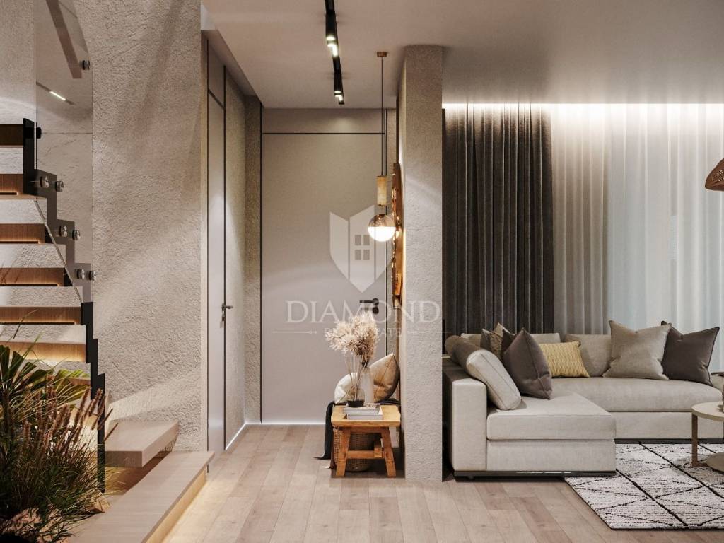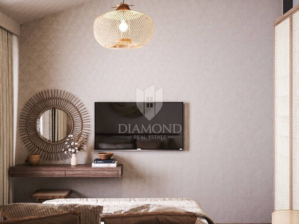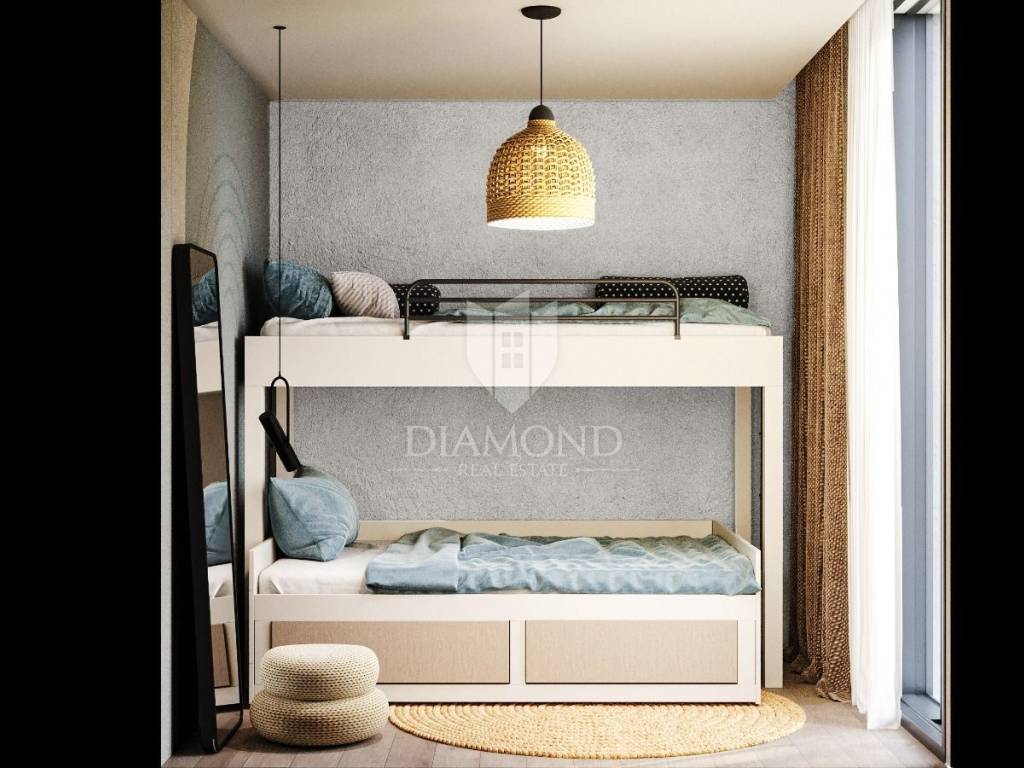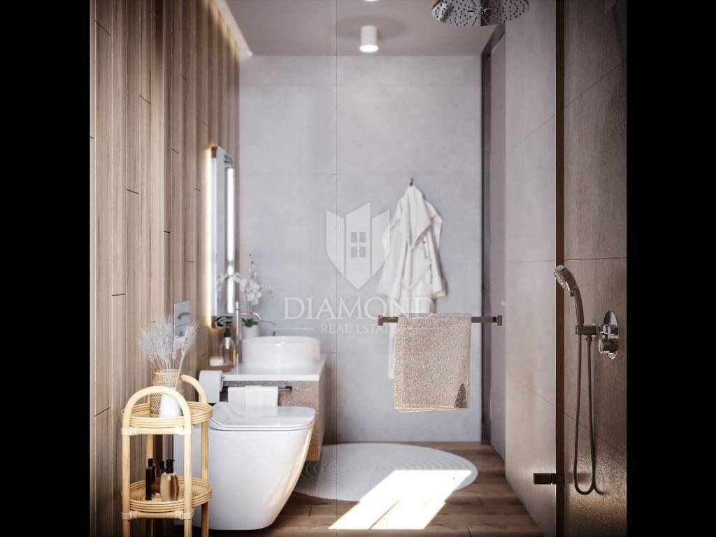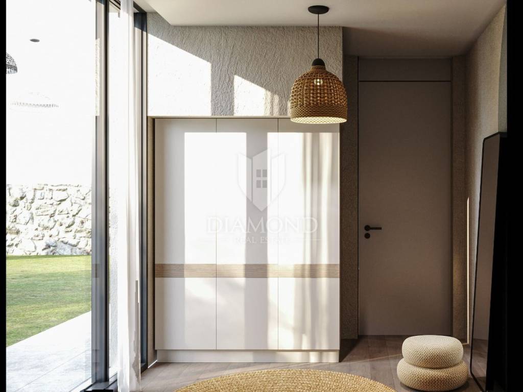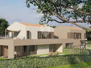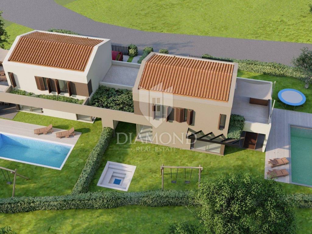This fantastic house, fully equipped with high-quality furniture, will be located in a quiet place not far from the city of Poreč, only 6 km away. Its total size will be 165 m2 and spread over two floors. On the ground floor of the house there is a spacious living room with a dining room and an open space kitchen, one toilet, a children's bedroom and a sauna. The living room, dining room and bedroom lead directly to the terrace where there is a sun deck with a swimming pool. Large glass walls will be installed throughout the living room and dining room, which will allow a large influx of sunlight and a large source of light. An elegant internal staircase leads to the first floor, where there are three more bedrooms, two bathrooms, a storage room, a laundry room and a spacious terrace with a jacuzzi and a view of the sea. Thanks to its high-quality insulation, the house will be heated and cooled by air conditioning. The yard of the house will be landscaped and fenced. Parking is located in the yard of the house. All amenities for life, such as a school, kindergarten, post office, shop, restaurants and nature walks are located near the village.