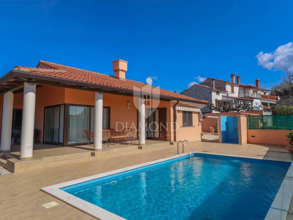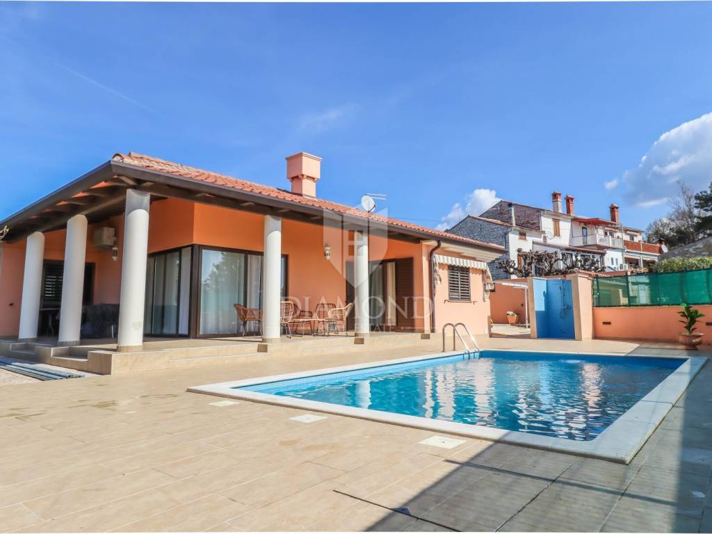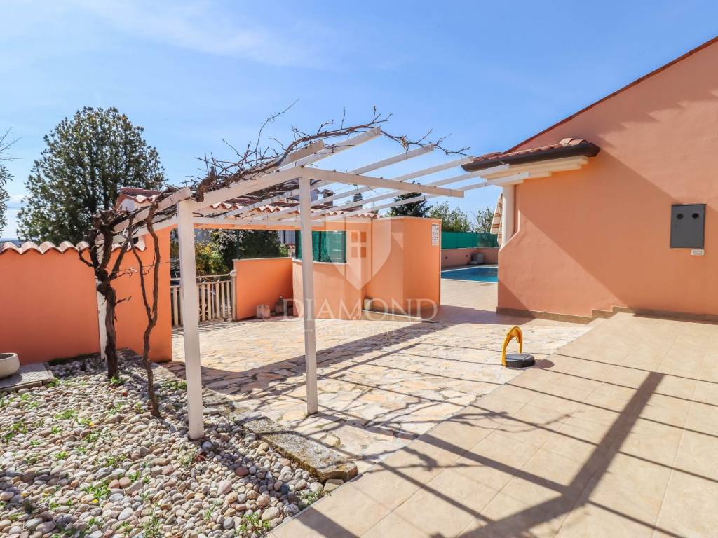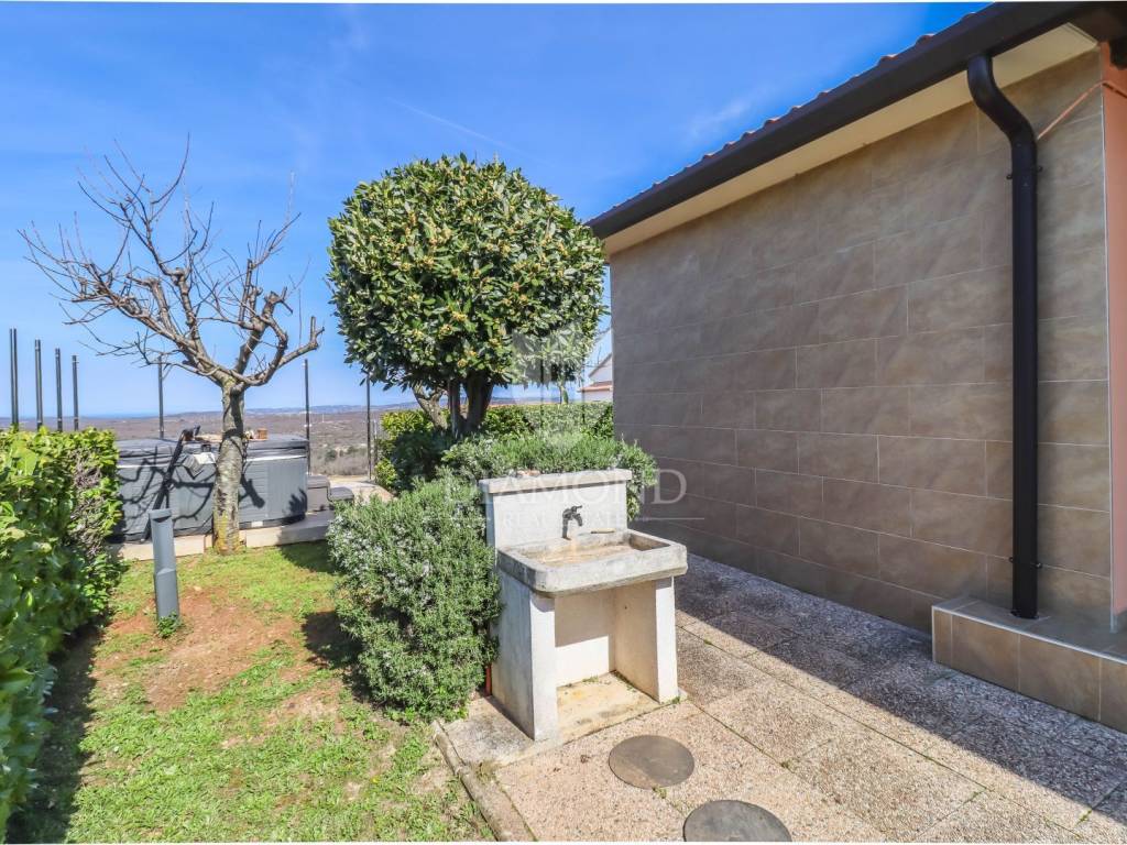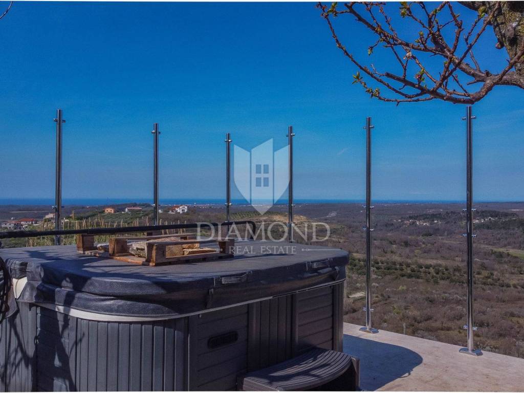Detached house with a pool and a view of the sea and the Alps! At the very entrance to Buje, this detached house with a swimming pool awaits you. It is spread over a completely fenced plot of over 700m2 and consists of a heated swimming pool, sunbathing area, outdoor shower, covered barbecue area, auxiliary building, jacuzzi facing north with a spectacular view of the sea and the Alps. It was built with exceptional quality in the 90s and has been well maintained. Heating is regulated by central floor heating, and cooling by air conditioning. The central place in the living room is occupied by a romantic fireplace for pleasant winter evenings. It consists of 3 bedrooms, a kitchen, a central sunny living room with access to a covered terrace and 2 bathrooms.