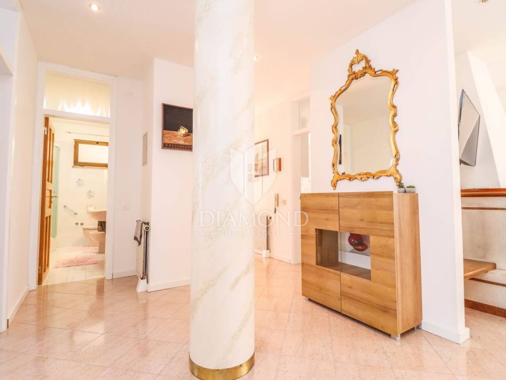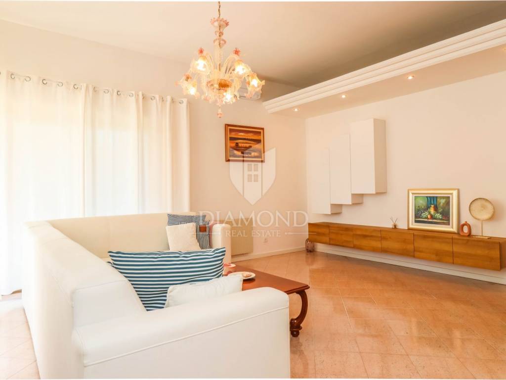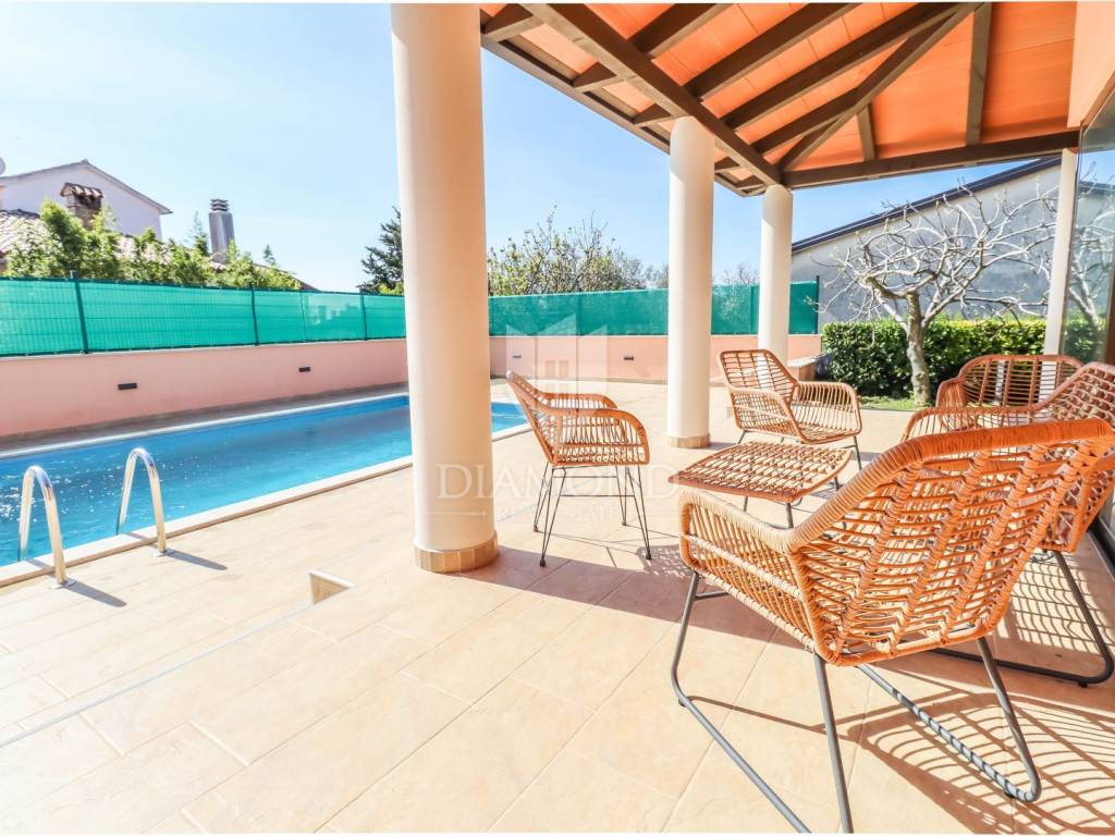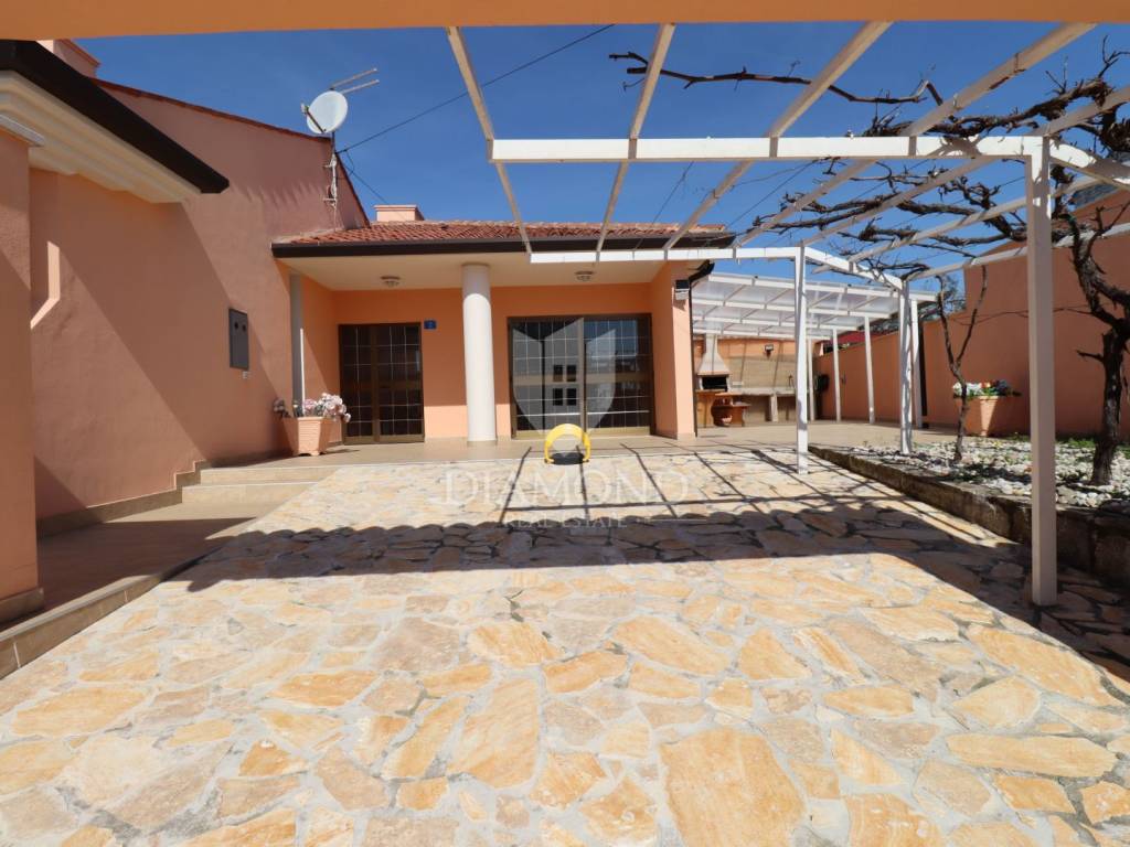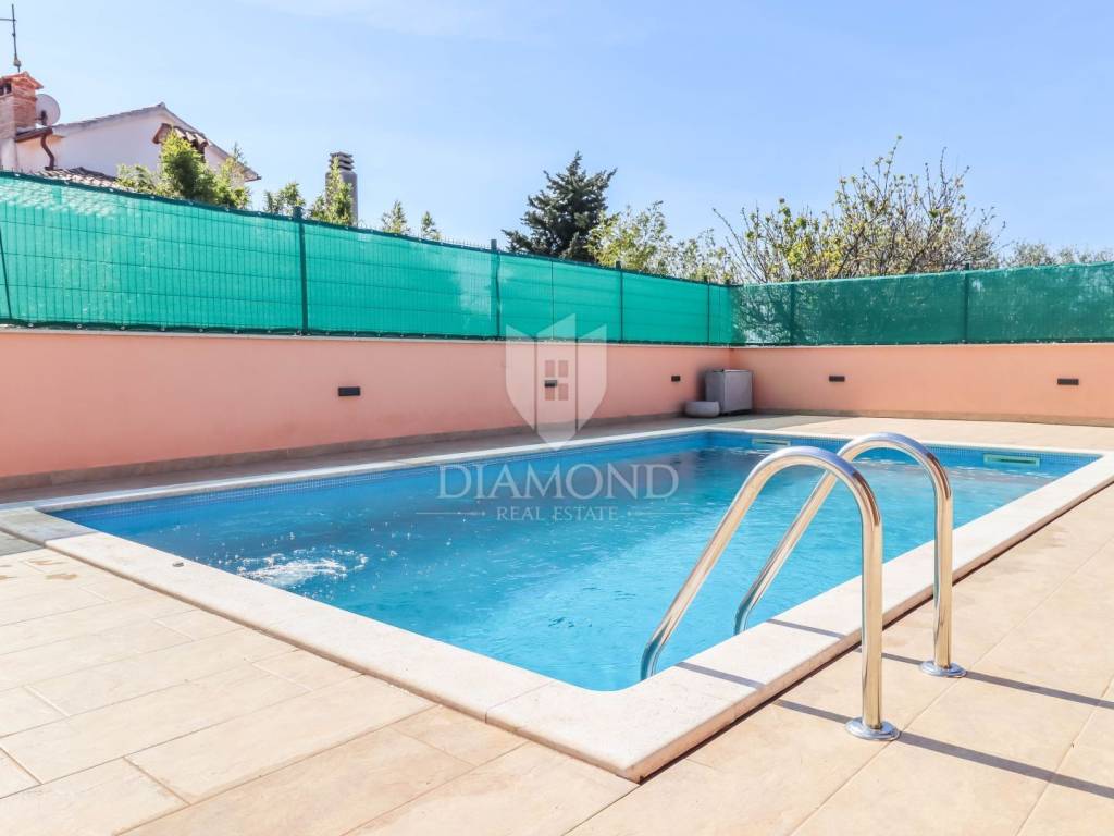 Detached house with a pool and a view of the sea and the Alps! At the very entrance to Buje, this detached house with a swimming pool awaits you. It is spread over a completely fenced plot of over 700m2 and consists of a heated swimming pool, sunbathing area, outdoor shower, covered barbecue area, auxiliary building, jacuzzi facing north with a spectacular view of the sea and the Alps. It was built with exceptional quality in the 90s and has been well maintained. Heating is regulated by central floor heating, and cooling by air conditioning. The central place in the living room is occupied by a romantic fireplace for pleasant winter evenings. It consists of 3 bedrooms, a kitchen, a central sunny living room with access to a covered terrace and 2 bathrooms.