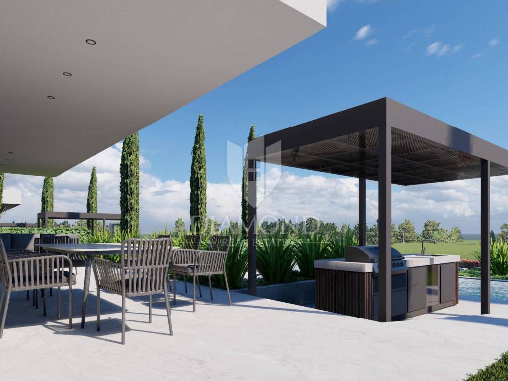 Through the living room you can access a spacious terrace that includes a sundeck with a view of nature and the sea. On the terrace there is a swimming pool that further enriches the experience of relaxation and enjoyment outdoors. A canopy with a summer kitchen and an uncovered terrace provides the perfect space for outdoor meals, entertainment and socializing with family and friends by the pool. In the lower part of the courtyard there is a fire-pit, creating a romantic atmosphere for evening gatherings.