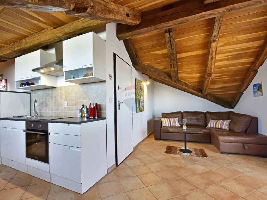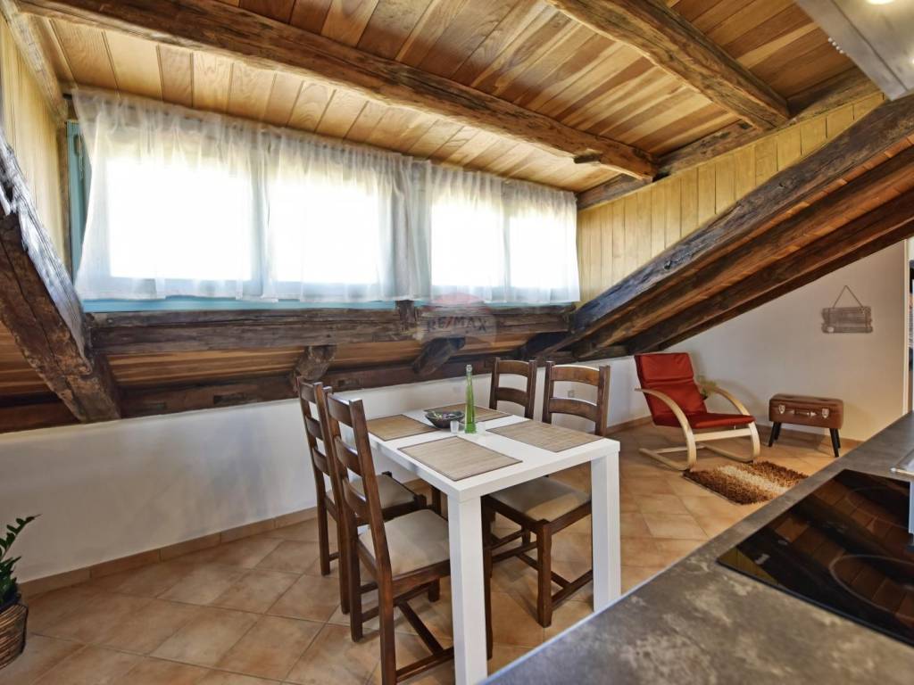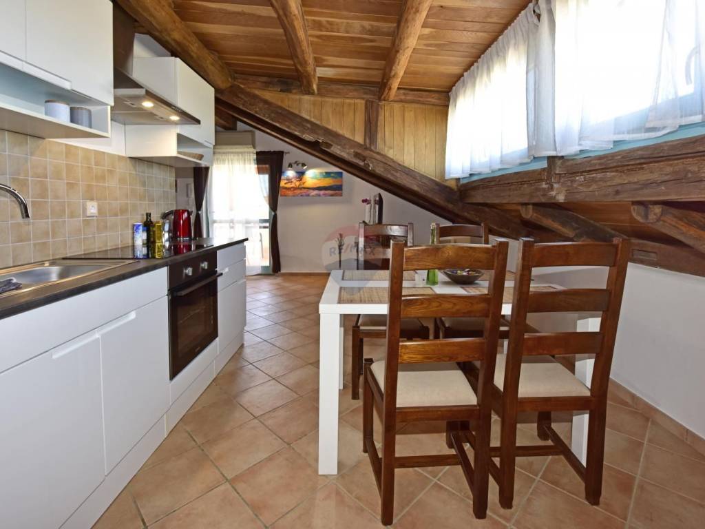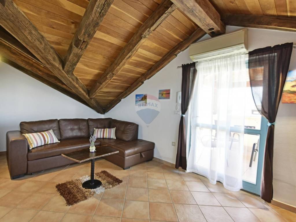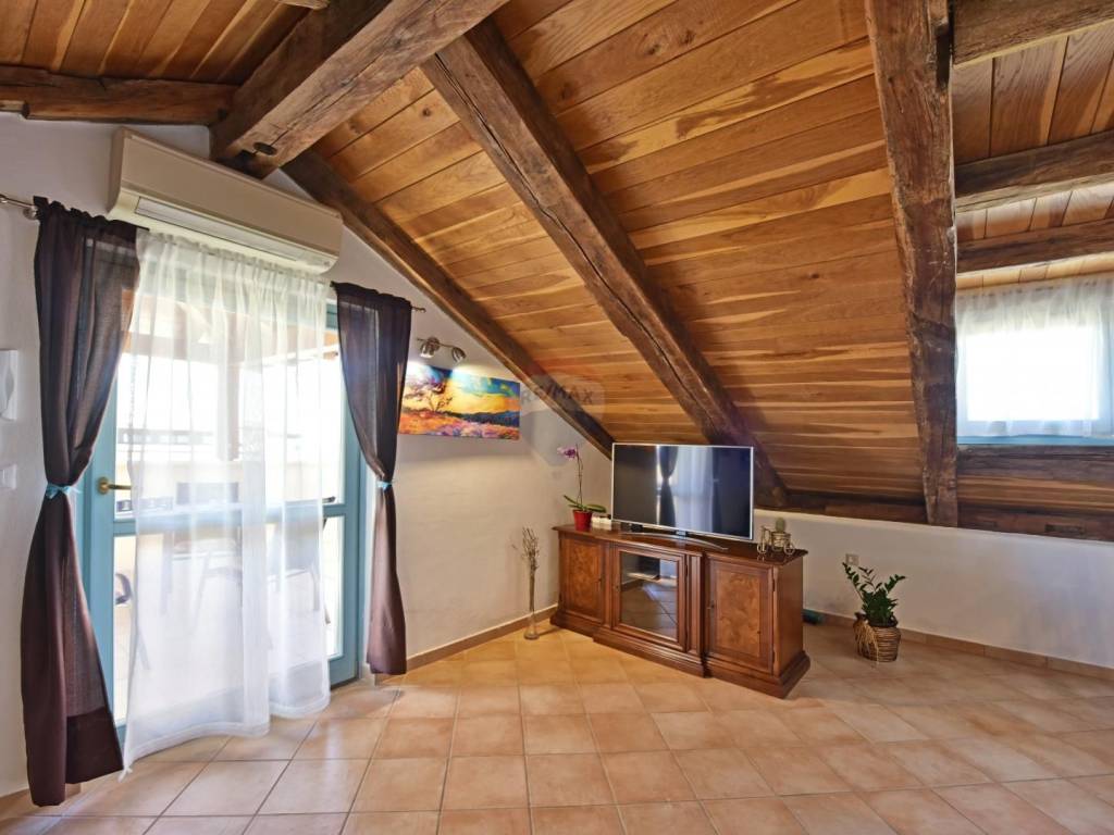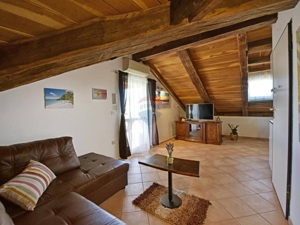 In a quiet location in the vicinity of Poreč, 5 km away from the first beaches, we are selling an apartment on the second floor, in the attic of the building. The apartment is located in a smaller building and consists of a living room, a kitchen with a dining room, two bedrooms and a bathroom. The terrace, which can be enjoyed in the summer months, is over 20 m2 and offers a view of the greenery and the sea. The parking lot is in front of the building.