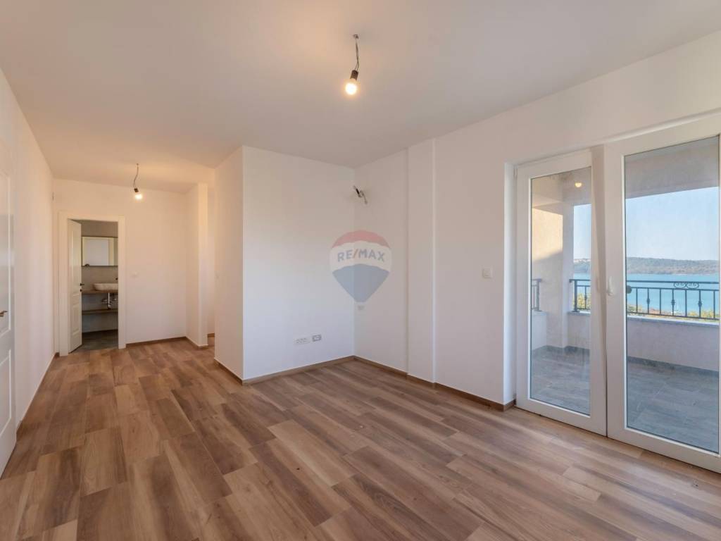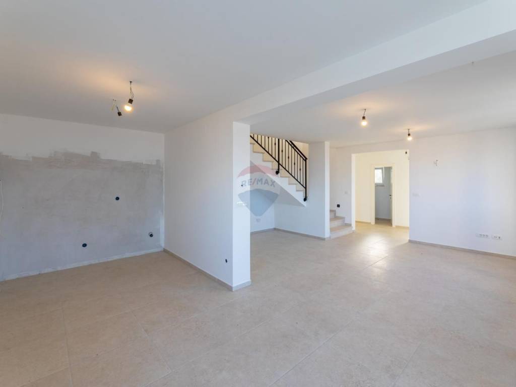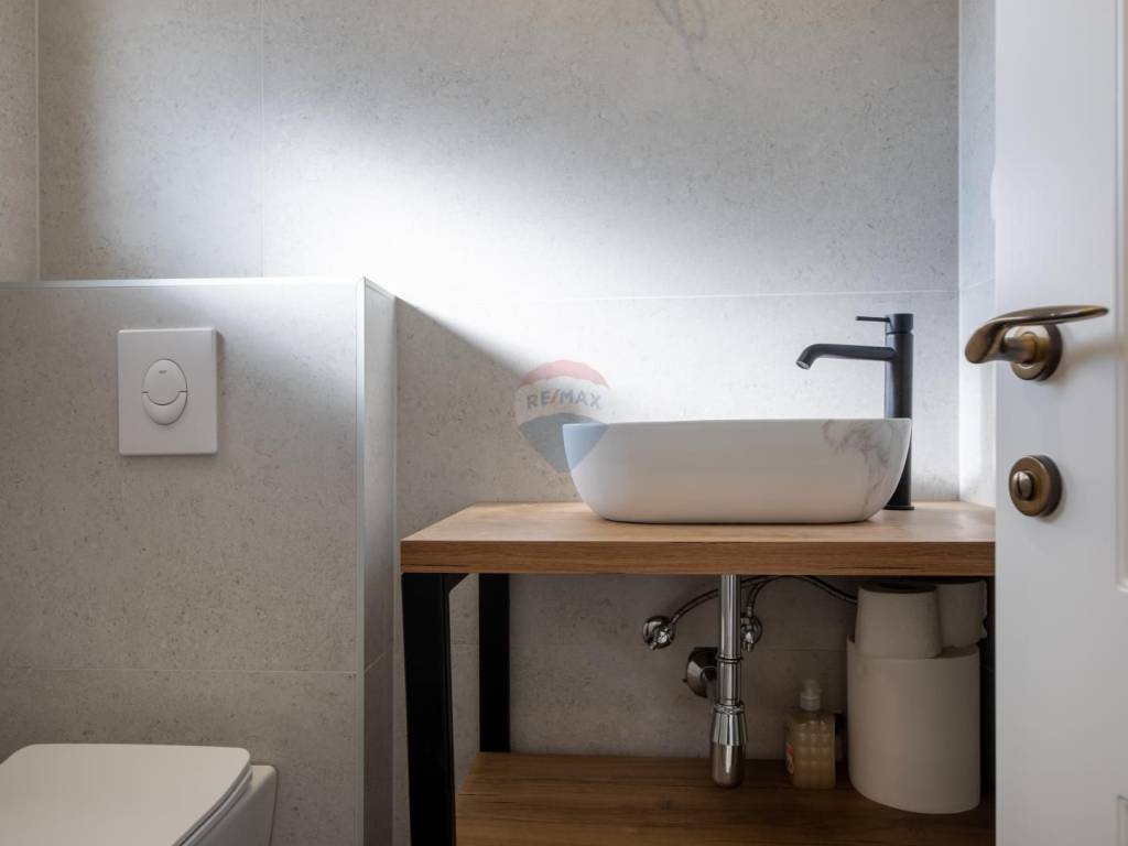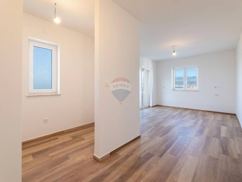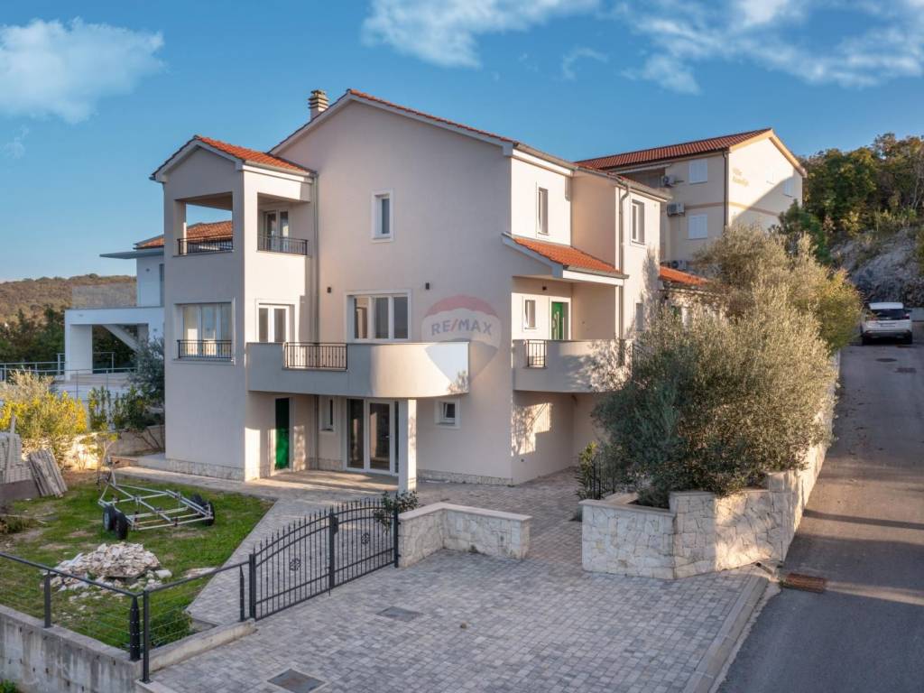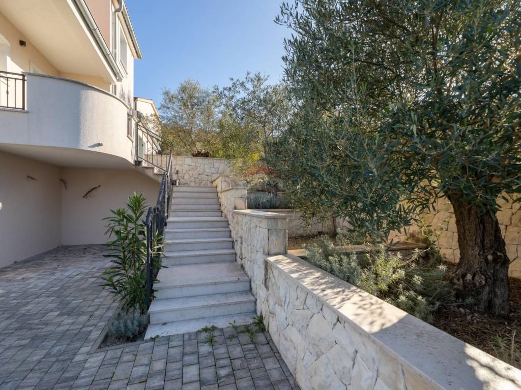 The main living unit of 159 m² is spread over two floors. On the first floor there is a spacious living room with access to a terrace with a stunning sea view, an open kitchen with dining area, a pantry, a toilet and an office with a separate external entrance. In the courtyard in front of the house there is a small terrace surrounded by old olive trees and two parking spaces. An open staircase lined with Kanfanar stone leads to the second floor where there are three bedrooms. The largest room has its own bathroom, dressing room and balcony with an unforgettable view of the bay, Crikvenica and Rijeka, while the other two rooms share a common bathroom. There is also a laundry room on the same floor, which can be converted into an additional room if necessary.