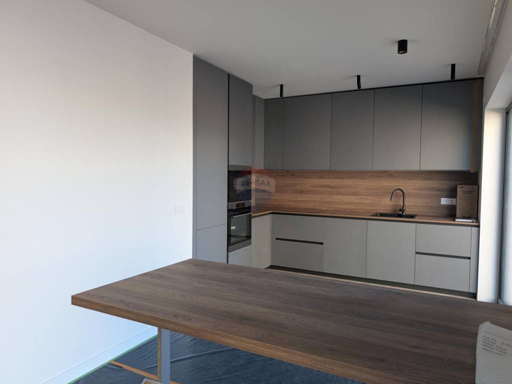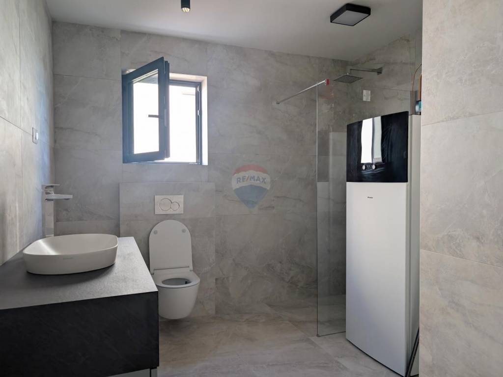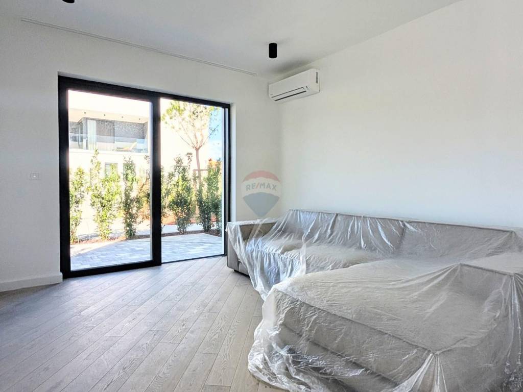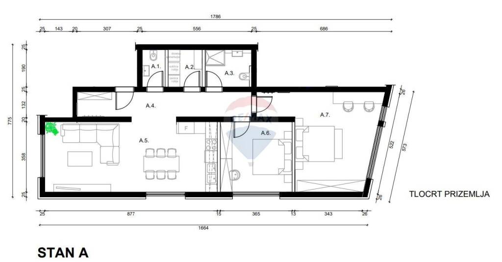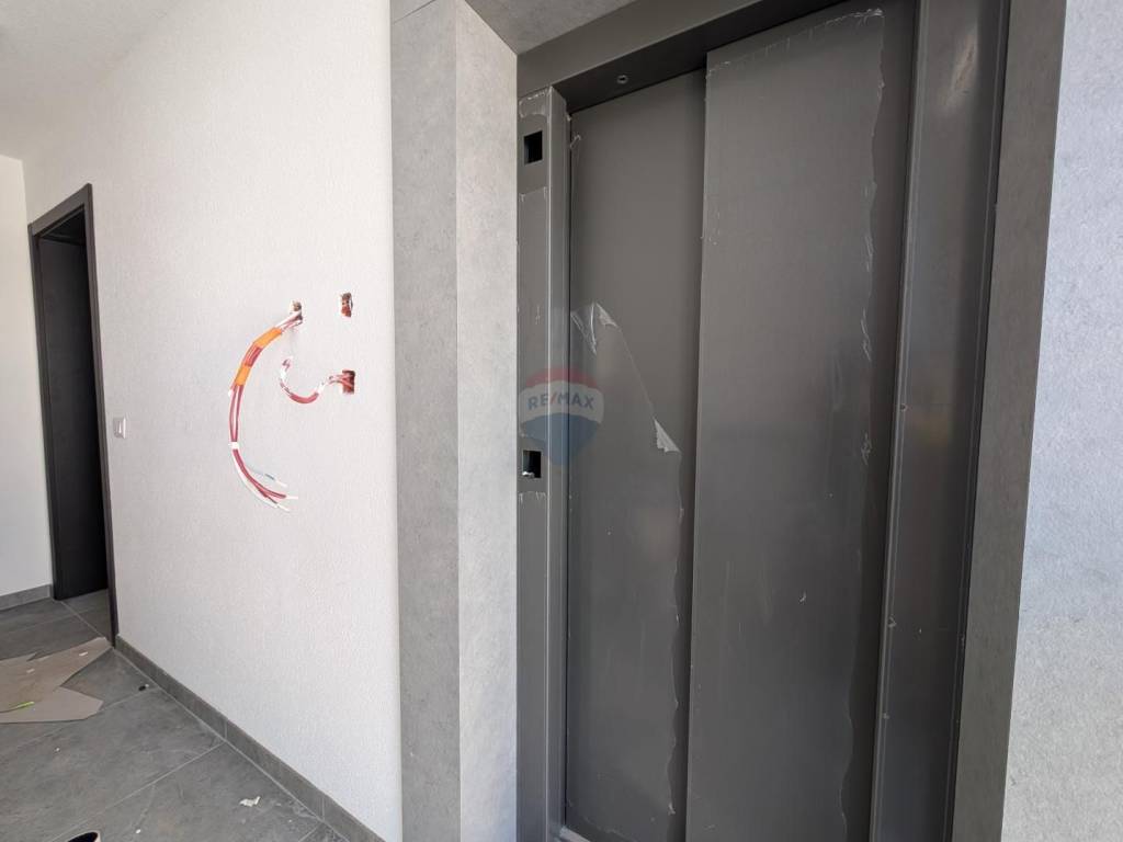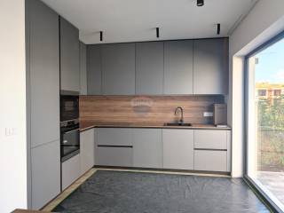The subject apartment A is located on the ground floor of this modern building and has a total of 104m2 of usable area. The elevator leads from the underground garage to the apartment, which consists of a living room, dining room and kitchen, two bedrooms, a toilet, a laundry room, a bathroom, a wardrobe and a corridor, all of which have a total area of 90 m2.