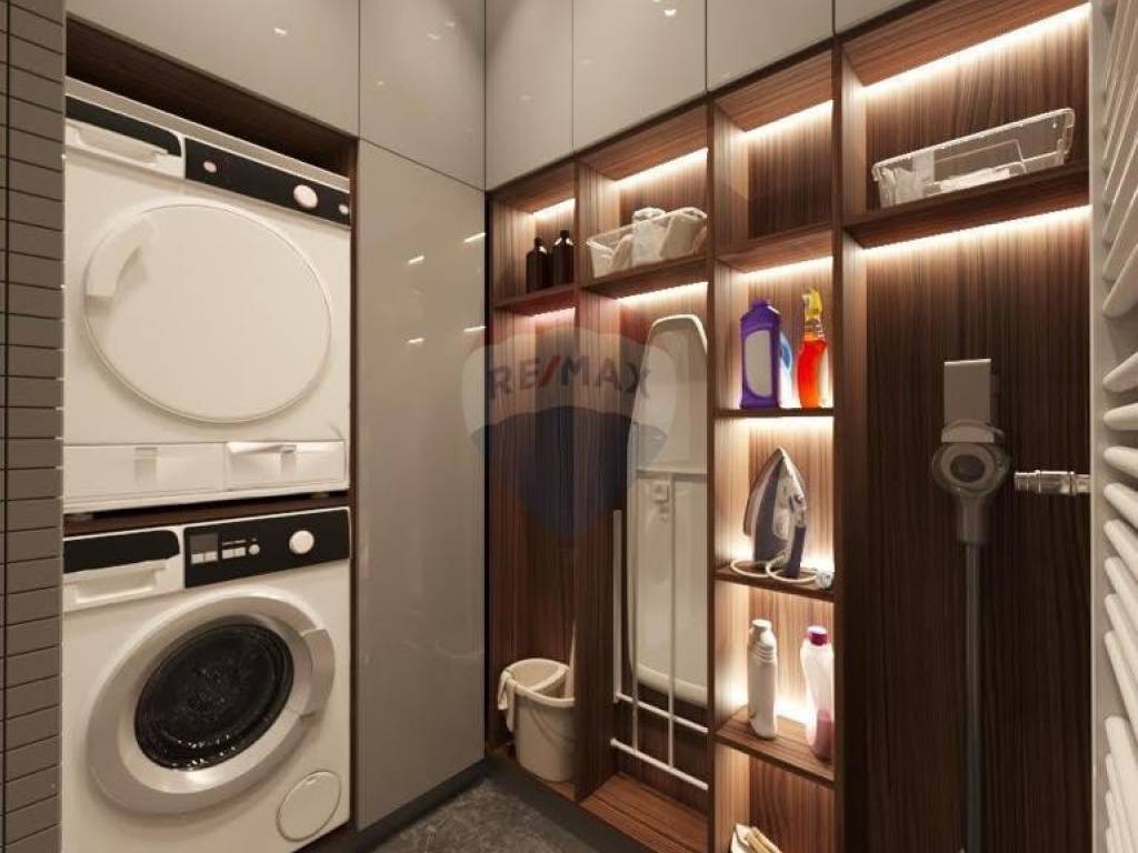 The elevator leads from the underground garage to the apartment, which consists of a living room, a dining room and a kitchen, two bedrooms, a toilet, a laundry room, a bathroom, a wardrobe and a hallway, all with a total area of 96.30 m2.