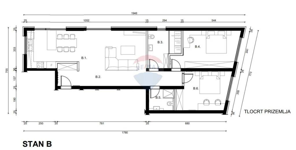 The subject apartment B is located on the ground floor of this modern building and has a total of 109 m2 of usable area.
