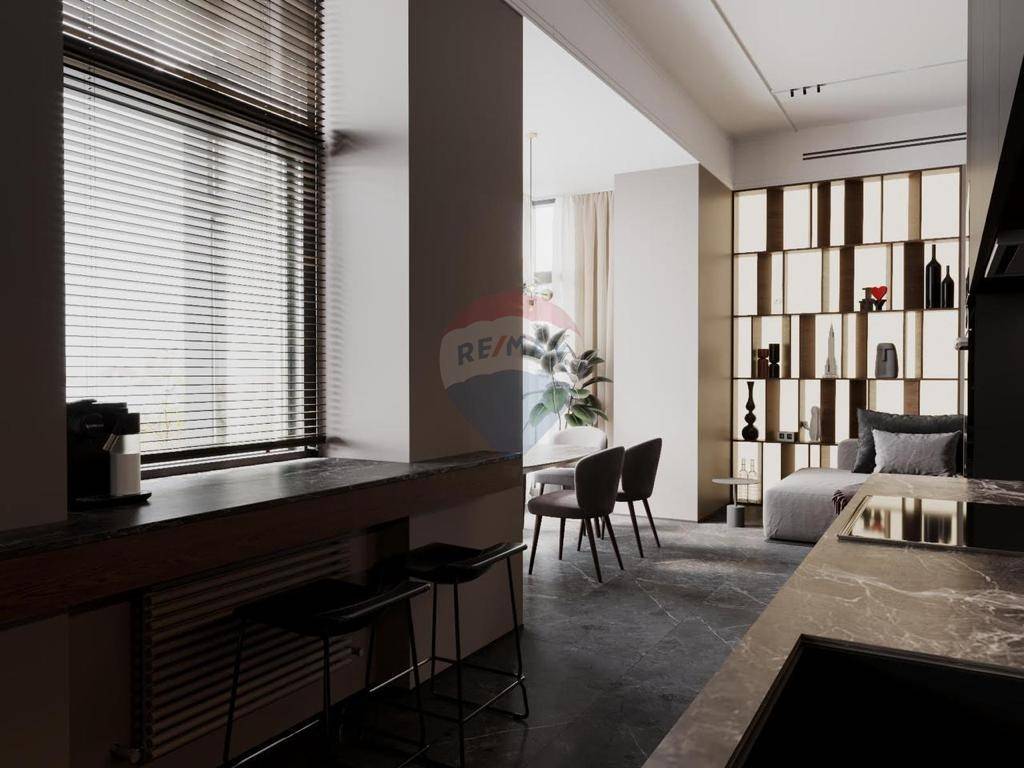 The attic consists of: living room, dining room and kitchen, bathroom and roof terrace.