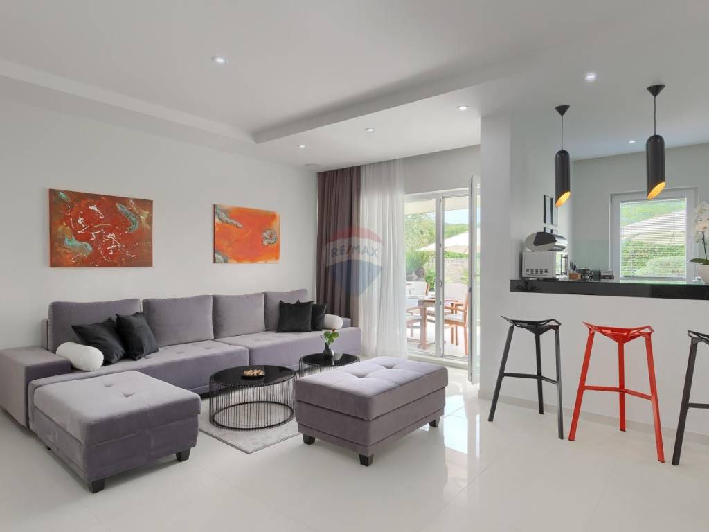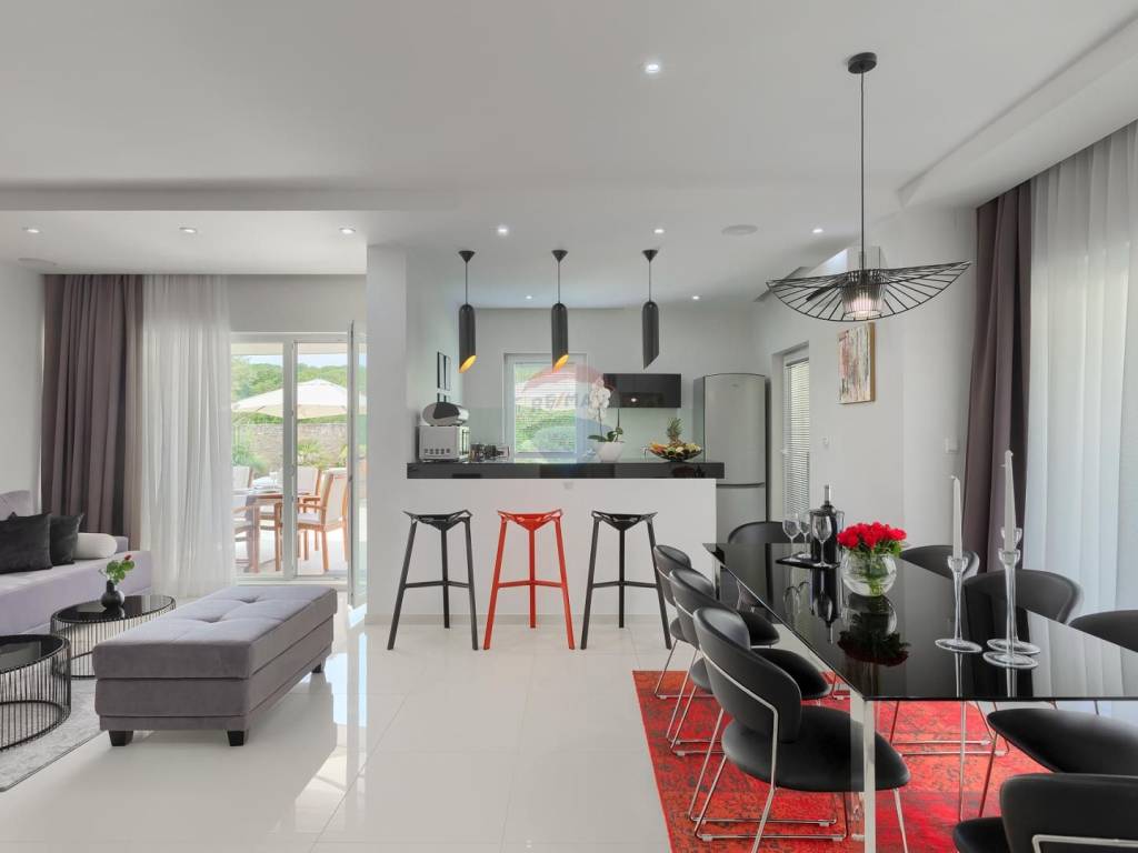 On the ground floor of the villa there is an elegant kitchen with a living room, a guest toilet and a technical room. The floor is covered with high-quality white marble ceramics that exudes luxury. The kitchen is made of high-quality materials and equipped with modern and high-quality appliances.