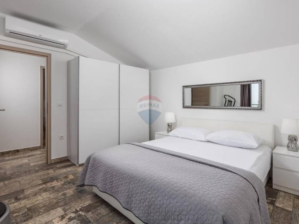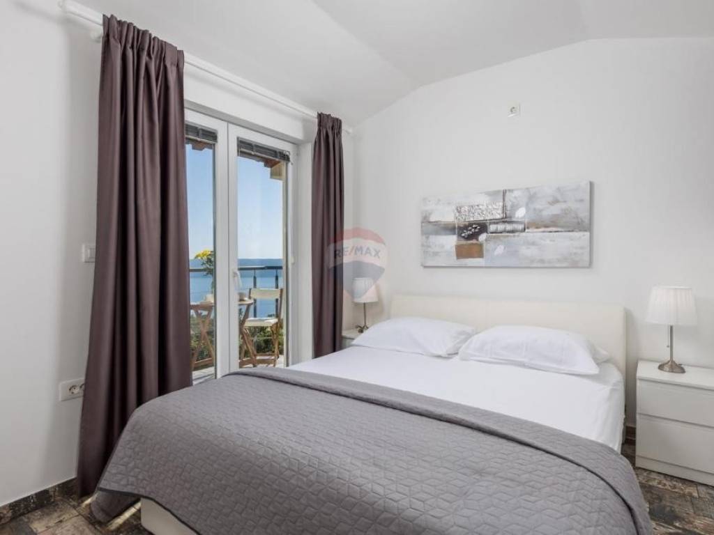 On the first floor there are 2 bedrooms, each with its own balcony and a sea view, and a bathroom.