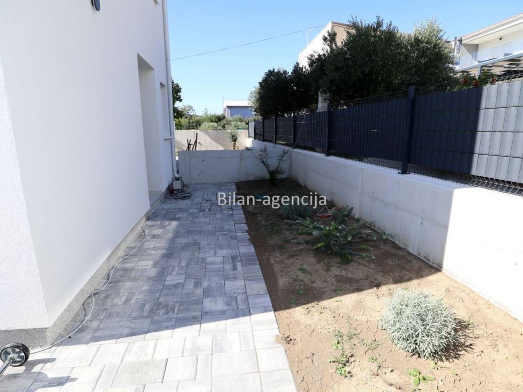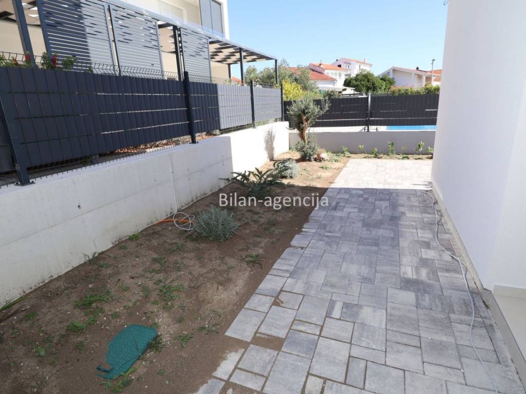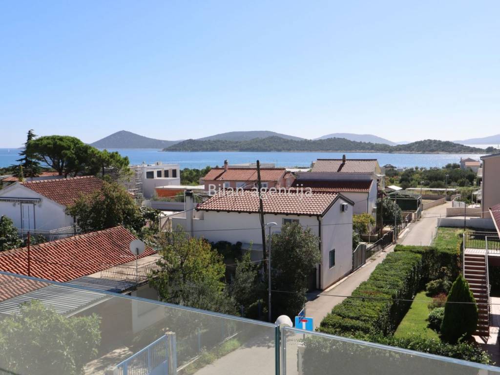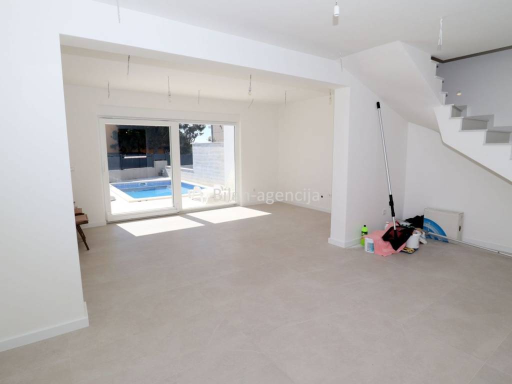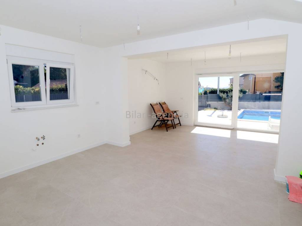 A modern house with a swimming pool is for sale. The location is in Tribunj near Vodice, in a quiet street near the sea and the center.