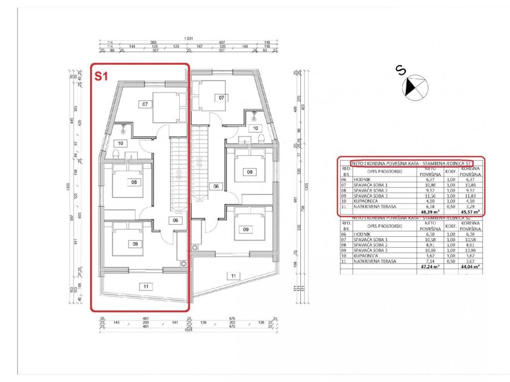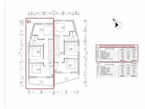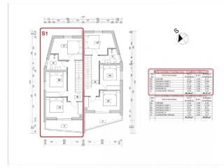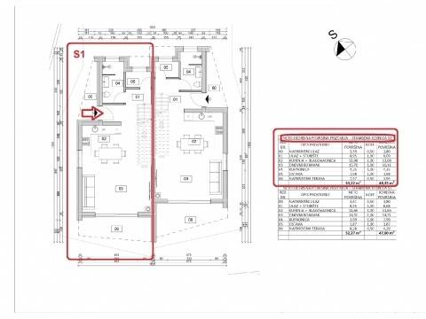 On the ground floor of the half marked S1 there is an entrance, staircase, kitchen-dining room, living room, bathroom, storage room, exit to a covered terrace.