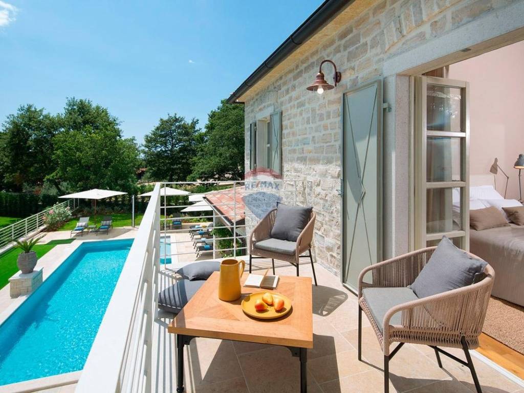 A famous Istrian designer took the lead in interior design, combining local architecture with a modern aesthetic that includes soothing colors, comfortable Italian and French furniture and luxurious details. The high functionality and equipment of each room is highlighted, from the luxurious bedrooms with beautiful wooden beams on the ceilings to the elegant garden with a swimming pool, sun loungers, fragrant plants and fruit trees.