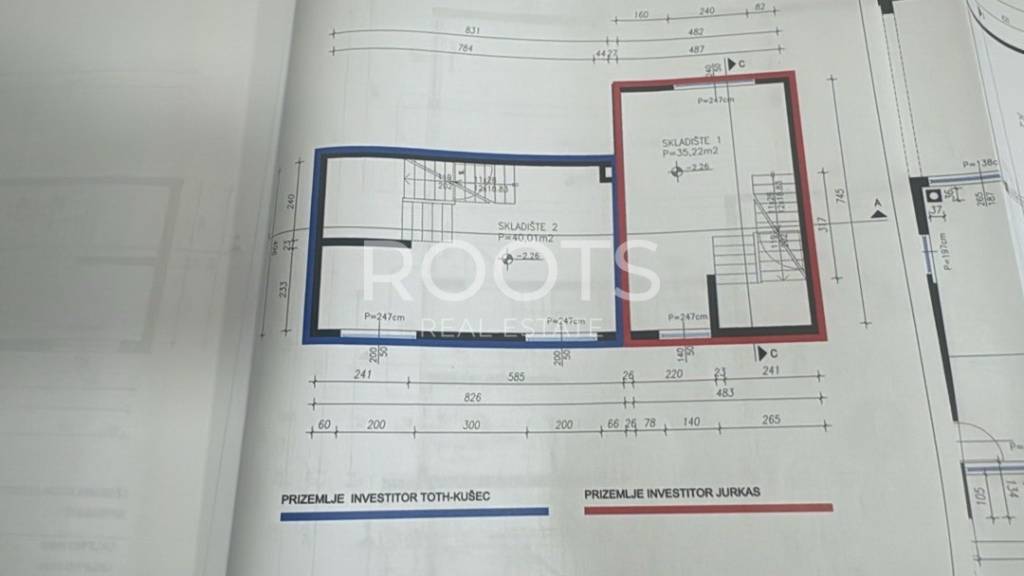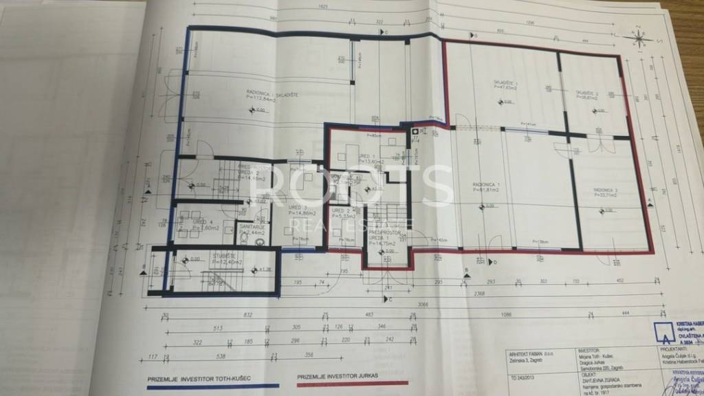 Tlocrt prizemlja sastoji se od uredskog predprostora, dva ureda, sanitarnog čvora (WC-a), radionice i skladišta te dodatna dva skladišta u podrumu, dok se tlocrt 1.kata obuhvaća stubišta, predsoblje, WC, kuhinju sa spremištem i izbom, blagovaonu, dnevni boravak, tri spavaće sobe, kupaonicu i radnu sobu.