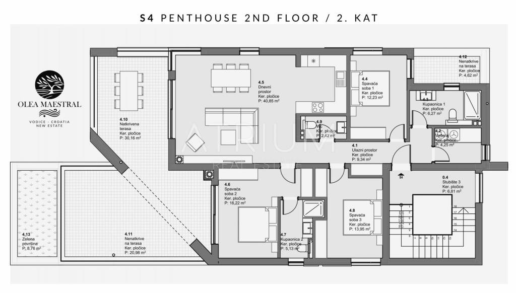 Apartment S4 is located on the second floor of a building with only four exclusive residential units. Situated in a peaceful and desirable location, the apartment offers a blend of modern design, functionality, and Mediterranean charm – ideal for family living, holiday use, or as an investment for tourist rental.