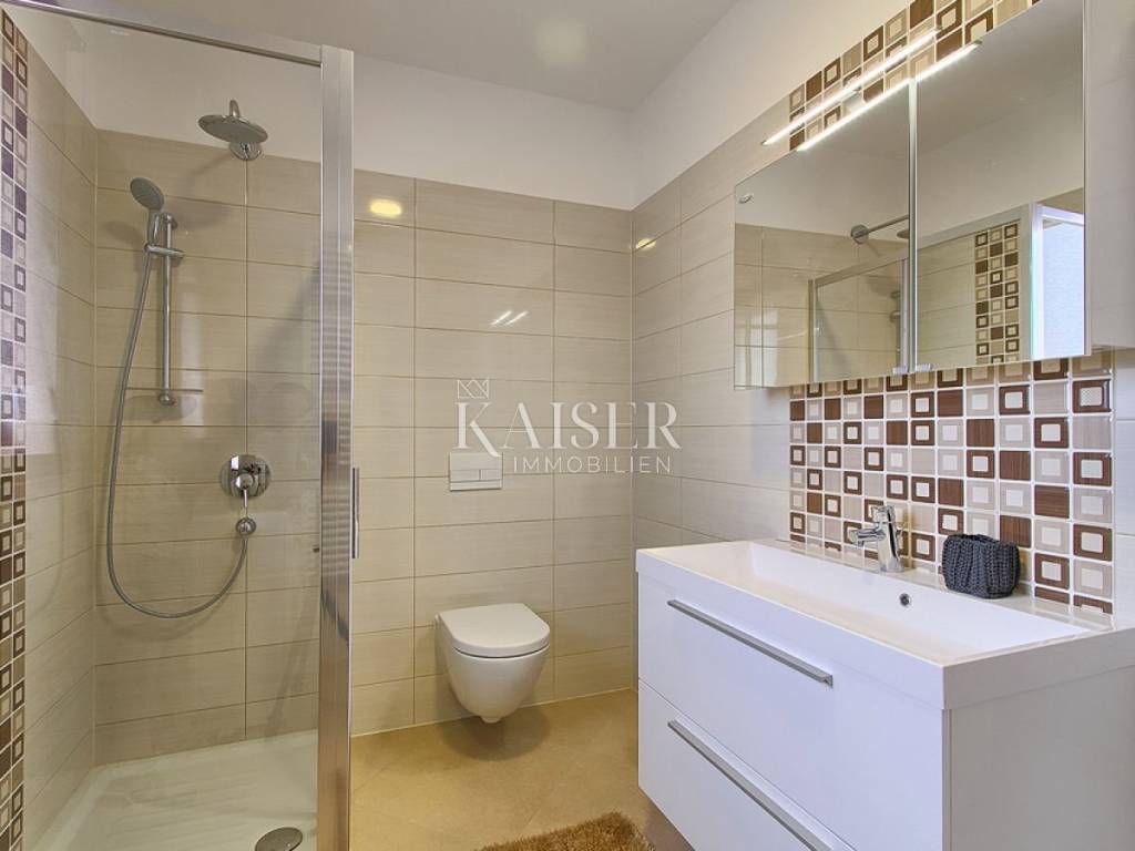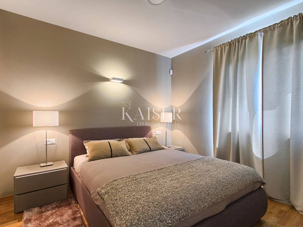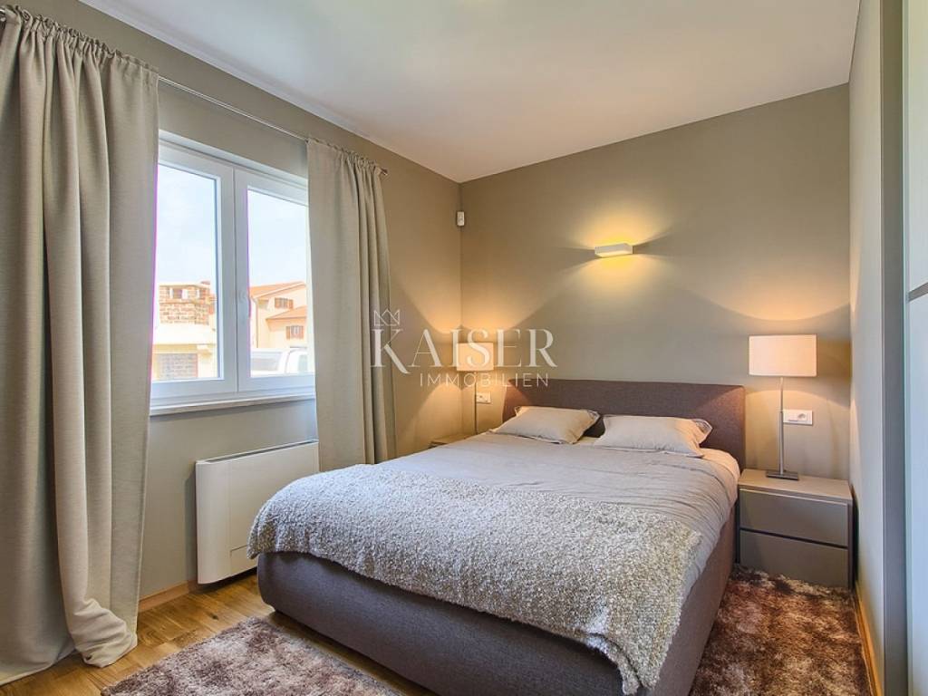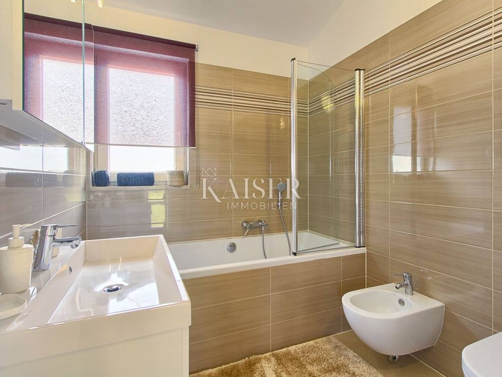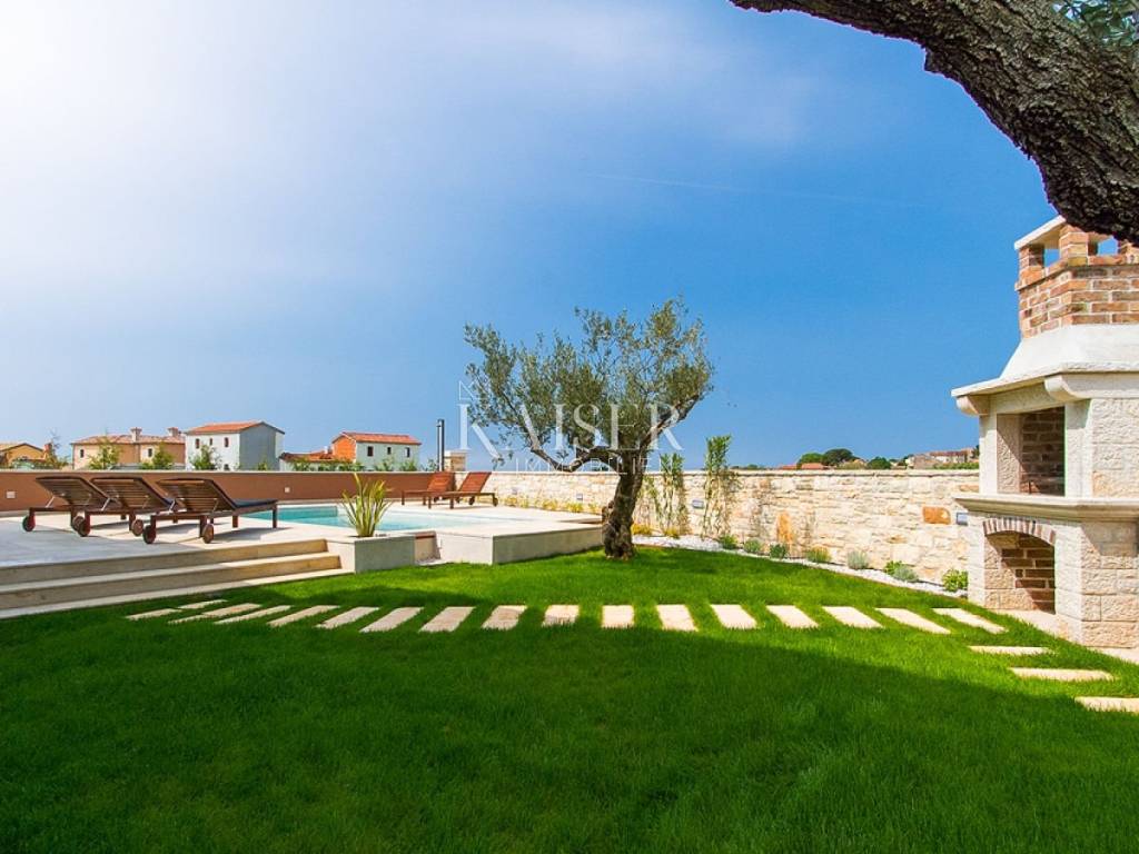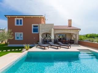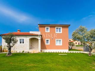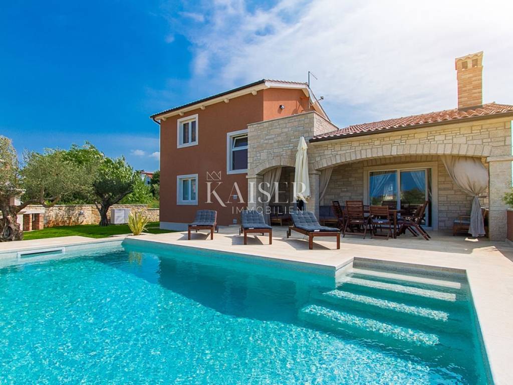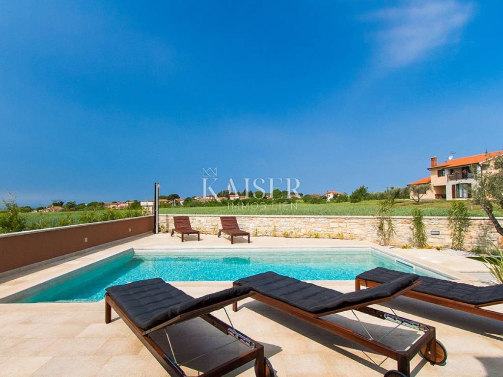 Kaiser immobilien is selling a new, modern house on the outskirts of the village, located approx. 10 kilometers from Poreč and 9 kilometers from the nearest beach. The house was built in 2015 and has its own fenced yard with an area of 600 m². The beautiful yard has a swimming pool with an area of 24 m², a children's playground and 2 parking spaces, a covered terrace and a barbecue. The house is fully air-conditioned and covers 155 m² on two floors. On the ground floor there is a spacious and modern living room with access to the terrace, an open and fully equipped kitchen, a dining room, two bedrooms with double beds and SAT-TV, and a shower/toilet. Upstairs there are two more bedrooms with double beds and each with SAT-TV, bathroom/toilet and balcony. This home rents well and is a good ROI investment.