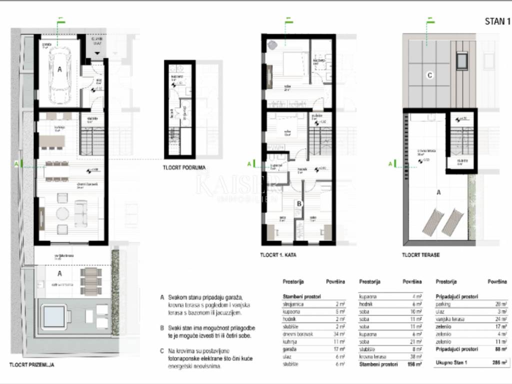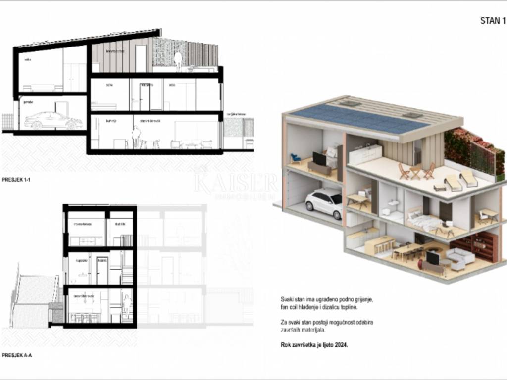 Kaiser Immobilien puts on the market a luxurious apartment of 198m2. On the ground floor there is a kitchen, a living room with access to the garden. On the first floor there are three bedrooms and a bathroom and a master bedroom with a bathroom and dressing room. One part of the roof is made in the form of a roof terrace, and the other part is closed and a photovoltaic power plant is located on it, which makes the house energy independent. Heating, cooling, all household appliances and in the garage a socket for charging an electric car, all connected to the roof heating system. There are two parking spaces in the outer part, the garage is part of the house with a direct entrance to the residential part. The apartment is located near all important amenities. Estimated occupancy is summer 2024. For additional information, feel free to contact the agent.