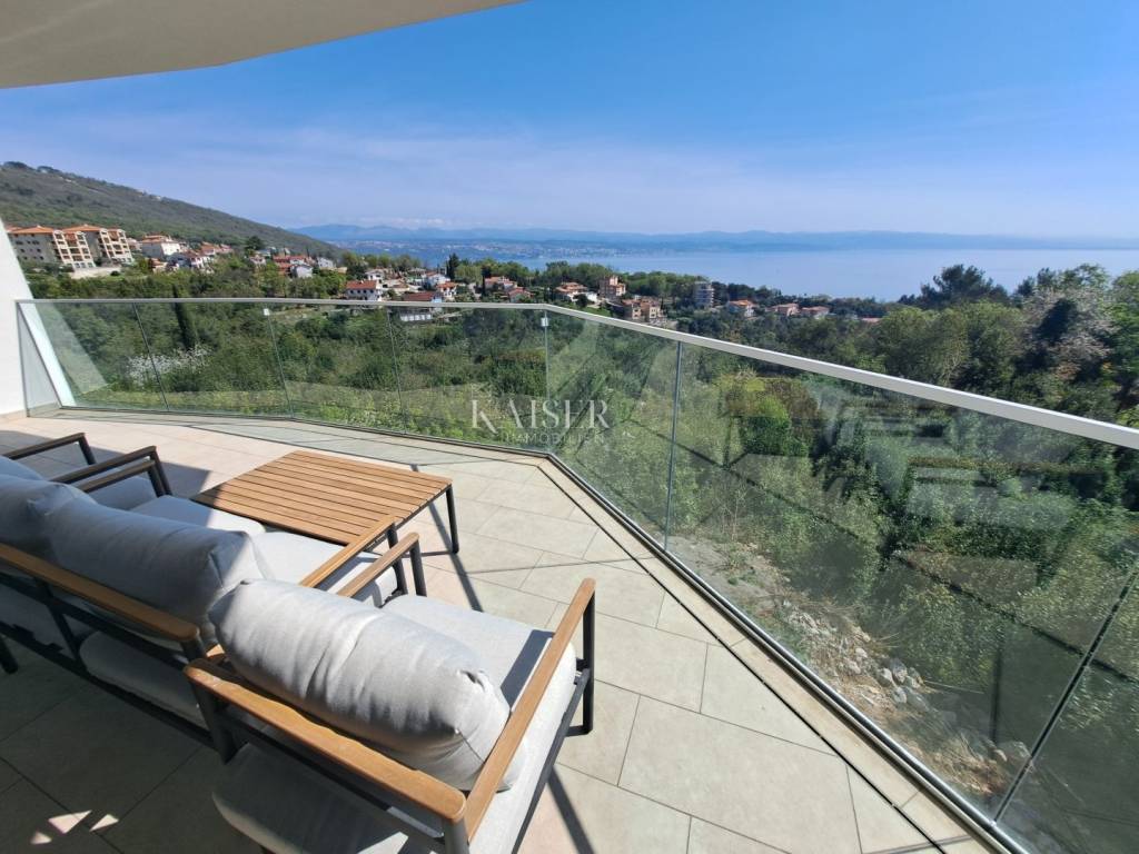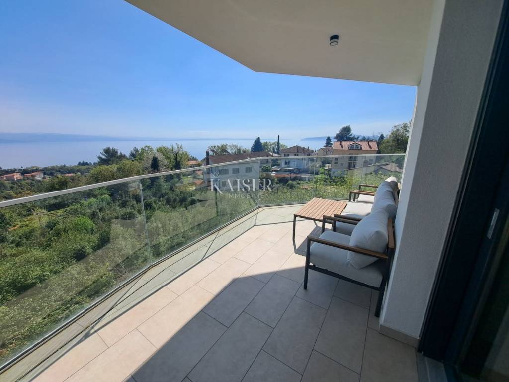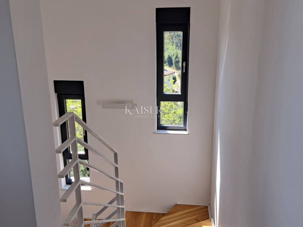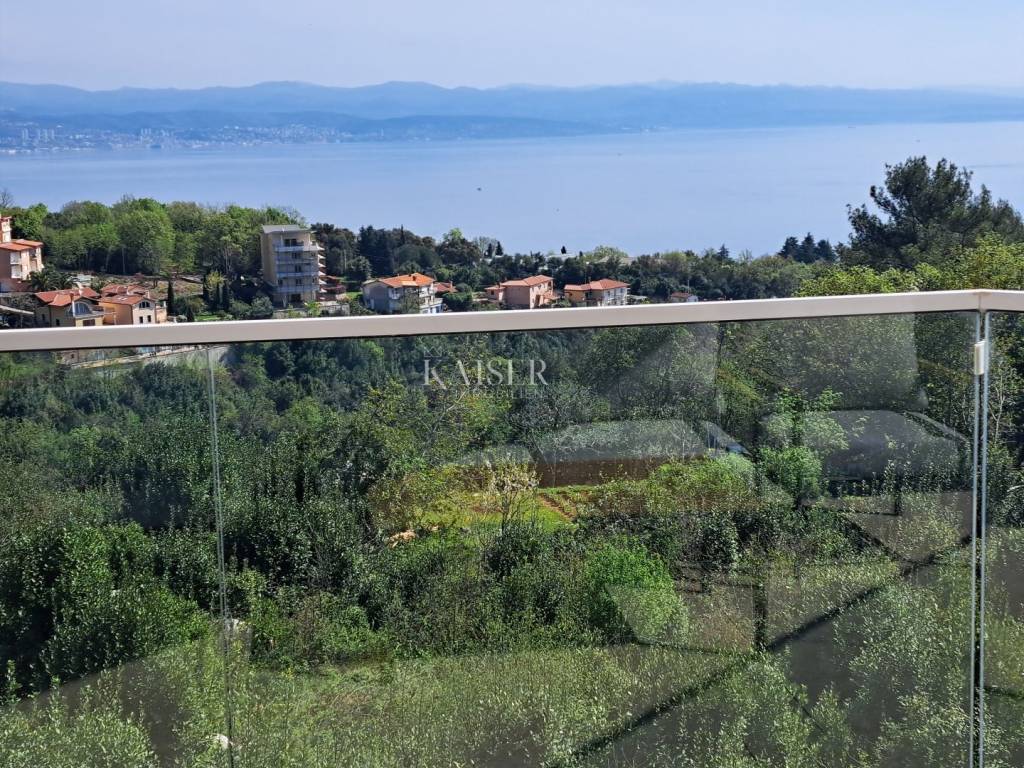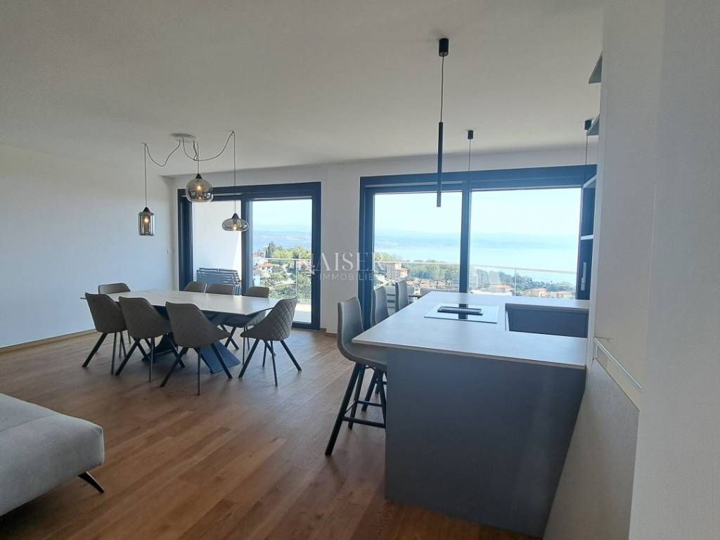 In the vicinity of Opatija, we offer a two-story apartment in a new building with a view of the sea, Rijeka and the surrounding area. A few minutes from the sea and the Lungo Mare promenade, this location near the shopping center, in a quiet street and in a landscaped garden, offers a pleasant living experience. The building has a total of 4 apartments. The offered apartment extends over 1 and 2 floors. On the first floor, there are two bedrooms that open onto a large terrace with an open view of the sea. Each has a walk-in bathroom. An internal staircase connects us to the second floor, where there is a living room, a kitchen with a dining room, a terrace and a toilet, all of which extends to 136.32 m2. The apartment is equipped with brand new furniture. The apartment has underfloor heating, if necessary it is possible to heat and cool with a heat pump, so there are two types of heating. Each room can be heated and cooled independently of the other space by means of a heat pump. The house has satellite and cable TV, a built-in alarm system, fire and burglary doors, and optical gigabit internet is used, currently the fastest version of the internet. The apartment has two parking spaces in the garden. Modern design, thoughtful interior decoration, pleasant and high-quality materials, as well as the location make this property special. The location is a 5-hour drive from destinations such as Vienna, Berlin 10 hours, Trieste 1 hour, Zagreb 1 hour 30 minutes, Krk airport 40 minutes, Pula 1 hour 20 minutes, Ljubljana 1 hour 30 minutes. For additional information and a tour, contact your agent: Eli Lovko, mob: 0916133776; eli@kaiser-immobilien.hr Agency commission is 3% + VAT