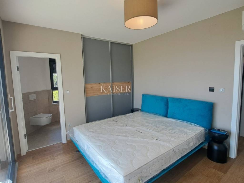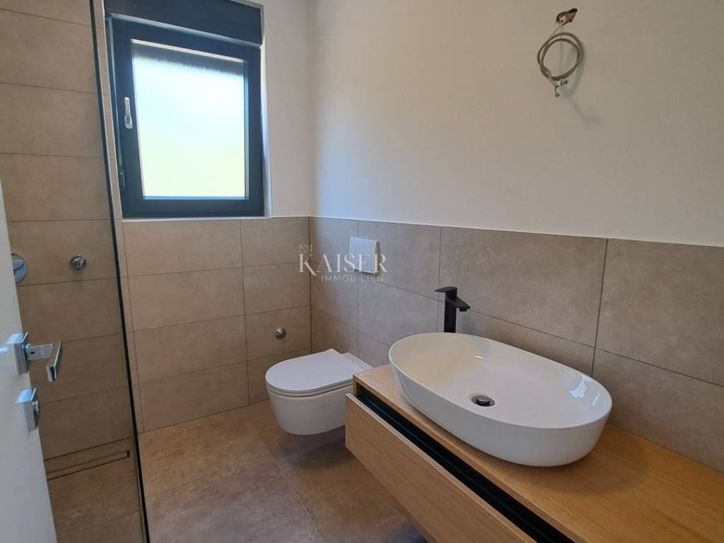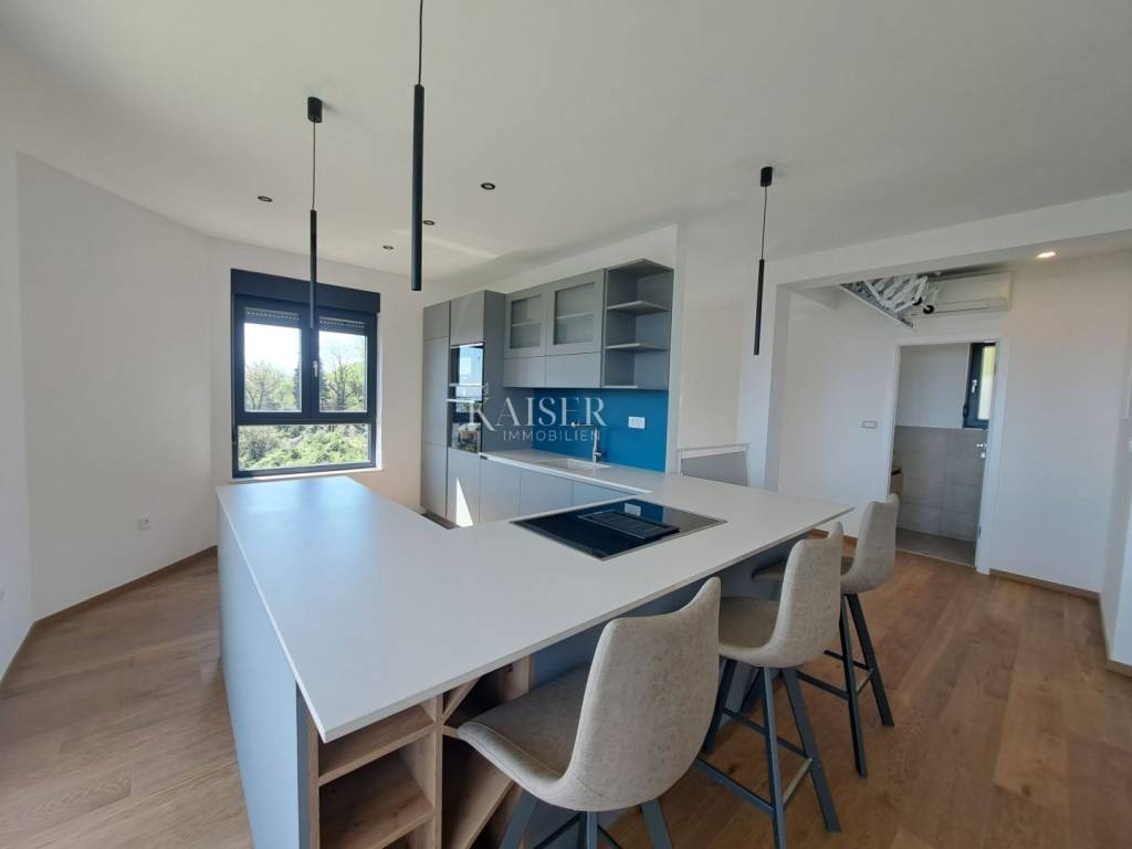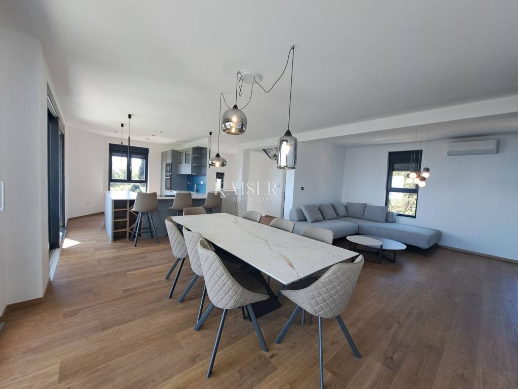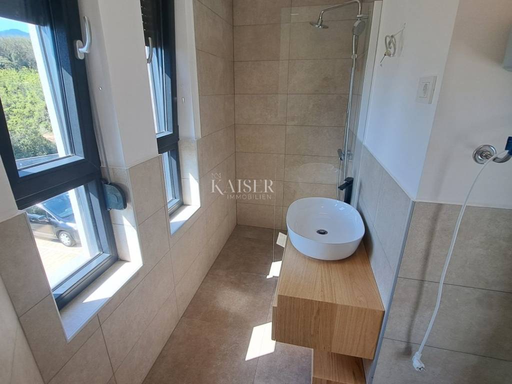 In the vicinity of Opatija, we offer a two-story apartment in a new building with a view of the sea, Rijeka and the surrounding area. A few minutes from the sea and the Lungo Mare promenade, this location near the shopping center, in a quiet street and in a landscaped garden, offers a pleasant living experience. The building has a total of 4 apartments. The offered apartment extends over 1 and 2 floors. On the first floor, there are two bedrooms that open onto a large terrace with an open view of the sea. Each has a walk-in bathroom. An internal staircase connects us to the second floor, where there is a living room, a kitchen with a dining room, a terrace and a toilet, all of which extends to 136.32 m2. The apartment is equipped with brand new furniture. The apartment has underfloor heating, if necessary it is possible to heat and cool with a heat pump, so there are two types of heating. Each room can be heated and cooled independently of the other space by means of a heat pump. The house has satellite and cable TV, a built-in alarm system, fire and burglary doors, and optical gigabit internet is used, currently the fastest version of the internet. The apartment has two parking spaces in the garden. Modern design, thoughtful interior decoration, pleasant and high-quality materials, as well as the location make this property special. The location is a 5-hour drive from destinations such as Vienna, Berlin 10 hours, Trieste 1 hour, Zagreb 1 hour 30 minutes, Krk airport 40 minutes, Pula 1 hour 20 minutes, Ljubljana 1 hour 30 minutes. For additional information and a tour, contact your agent: Eli Lovko, mob: 0916133776; eli@kaiser-immobilien.hr Agency commission is 3% + VAT