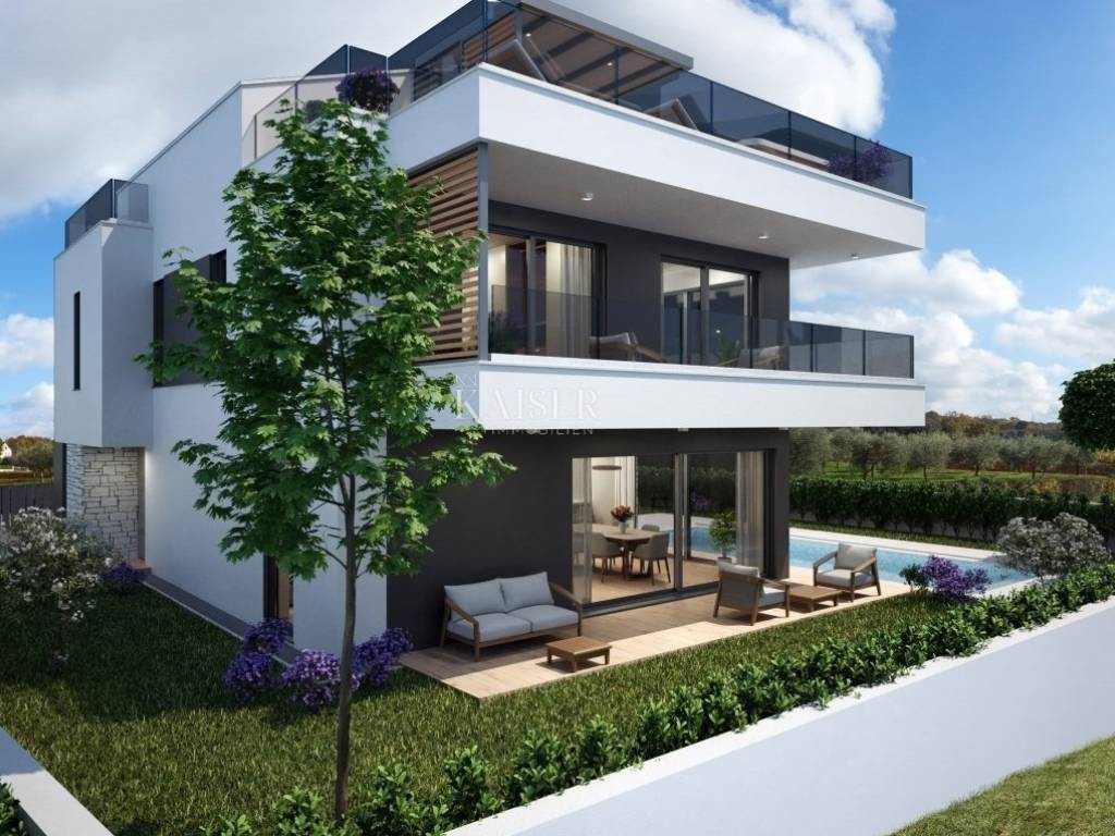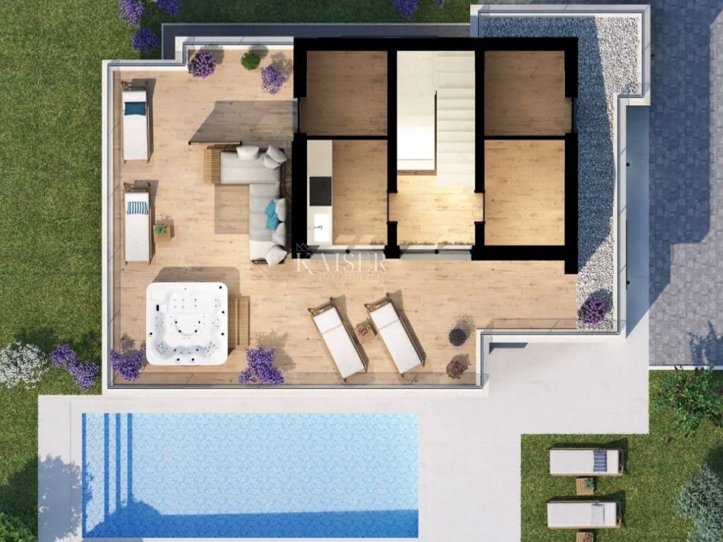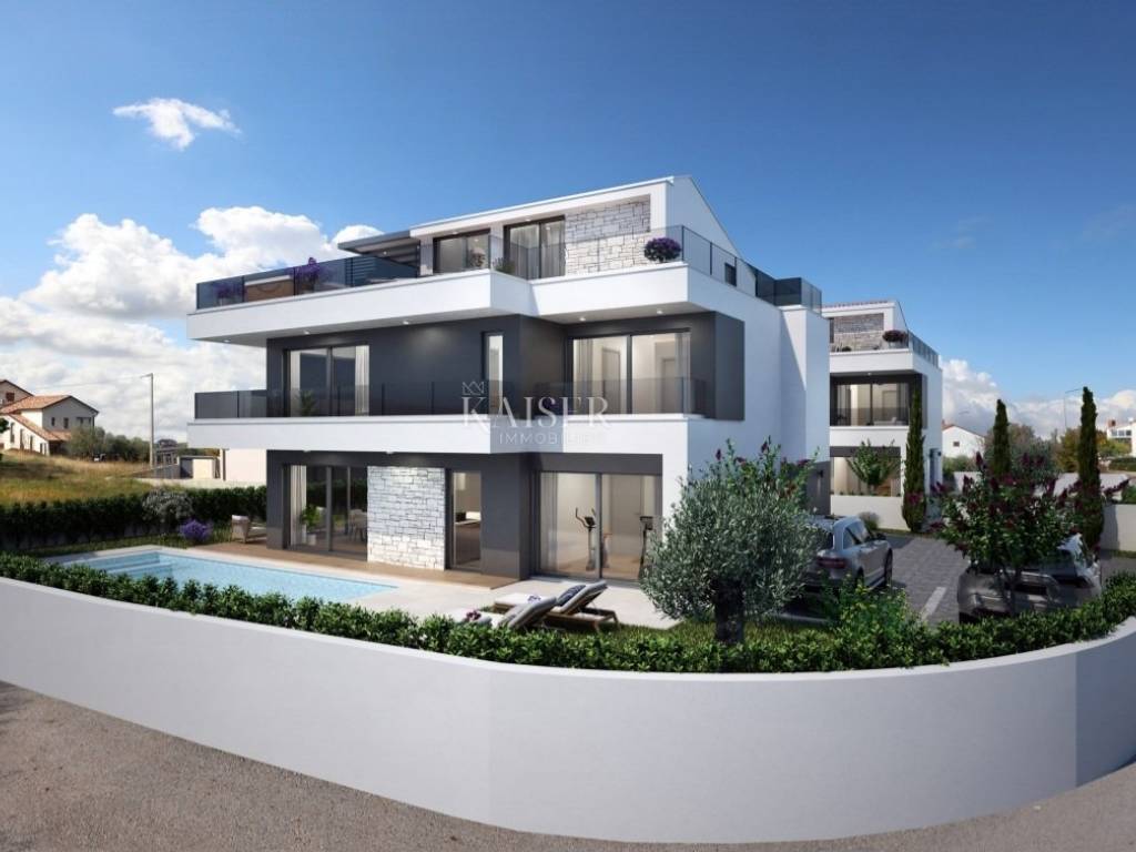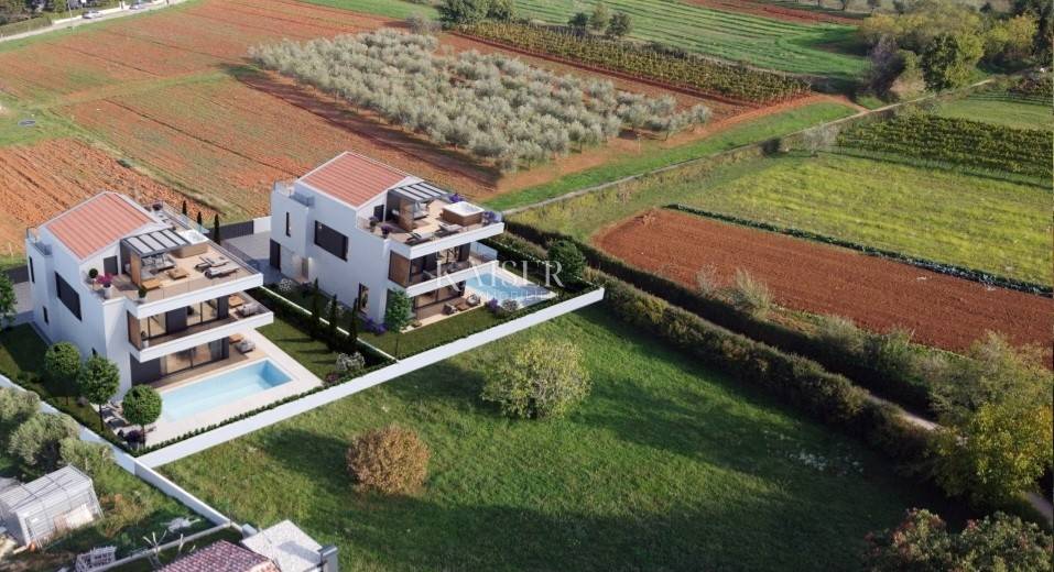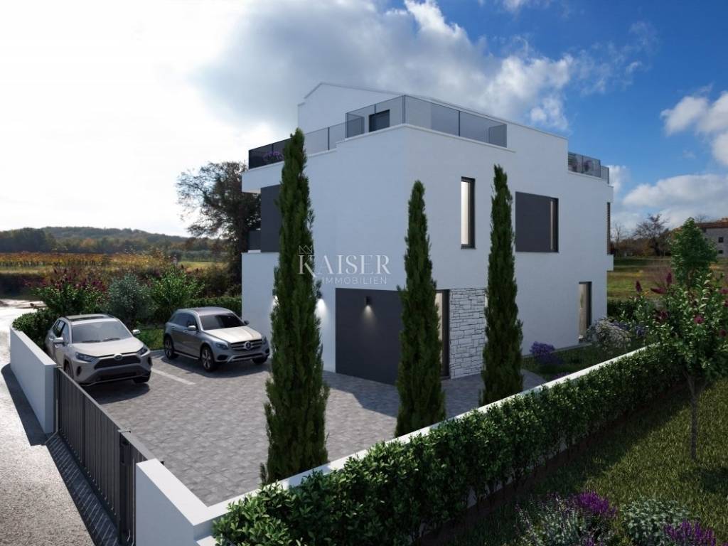 Kaiser Immobilien is selling a beautiful modern house in a new building with a swimming pool and a roof terrace. The house is located in a quiet village only 4 km from the center of Poreč and beautiful beaches. This villa consists of a living net area of 220 m2 on a plot of land measuring 500 m2. On the ground floor, there will be an entrance area, a spacious living room with a kitchen and dining room according to the open space system, a technical room, a storage room, a toilet, a wellness room, which can also be used as a bedroom, and a covered terrace. On the first floor there will be three bedrooms, each with its own bathroom, as well as two covered terraces. On the second floor there will be a bathroom, two storage rooms, a room that can be used as a kitchen or sauna and a large uncovered terrace of 70 m2. The house will be equipped with air conditioners and the heating will be underfloor throughout the house - via a heat pump or electric, as agreed. Aluminum carpentry, blinds on the windows, and the first phase for the sauna. In short, this villa offers the ultimate combination of style, luxury, comfort and proximity to all amenities offered by Poreč. The house is sold turnkey with a swimming pool, without furniture. It is also possible to buy in the Roh Bau phase. Distance: Pula Airport, 60km Restaurant 300m Beach 5km The location of this villa provides excellent connections with other European cities: Poreč-Ljubljana 161km Poreč-Vienna. 545km Poreč-Munich 561km Poreč-Prague 872km Poreč-Budapest 589km The price of this exceptional villa is EUR 795,000. Do not miss the opportunity to become the owner of this exclusive home. For additional information and a viewing, contact your agent by email: dean.cvitko@kaiser-immobilien.hr or phone number: 00385 91 5284449 Agency commission is 3% plus VAT