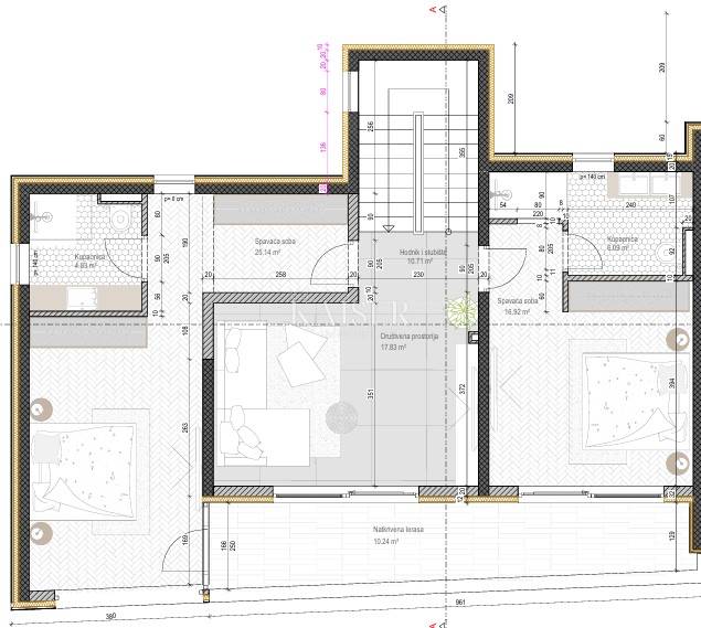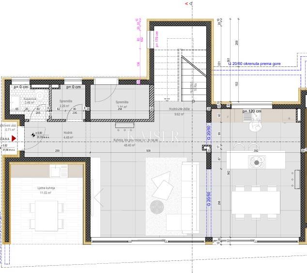 Medulin is a charming coastal town located in the south of Istria, known for its beautiful beaches, crystal clear sea and rich tourist content. The Medulin Riviera offers unique natural beauty, including the picturesque sandy beach of Bijeca and numerous coves ideal for swimming. With a rich gastronomic offer and various sports activities such as cycling, sailing, tennis, horse riding and diving, Medulin attracts both tourists and those looking for a quiet place to live or relax. Kaiser Immobilien presents a luxurious semi-detached villa with a total area of 185 m², located in an attractive location with a stunning sea view from the spacious roof terrace. This modernly designed property extends over three floors – ground floor, first floor and roof terrace – and offers the perfect combination of comfort, quality and contemporary design. The ground floor of the villa is entered via a covered terrace of 0.71 m², which leads to the entrance hall of 4.48 m². On the left side of the hallway there is a separate toilet of 2.46 m², and right next to it is a practical storage room of 2.26 m². The hallway leads into a spacious open space of the living room, dining room and kitchen, which occupies 48.40 m² and has direct access to the outdoor terrace and swimming pool, creating an ideal space for relaxation and socializing. The ground floor additionally contains another storage room of 3.94 m², as well as a hallway and a staircase of 9.62 m² leading to the first floor. On the upper floor, directly opposite the staircase, there is a multipurpose room of 17.83 m² that can be used as a social room or an additional bedroom, and from which there is access to a covered terrace of 10.24 m². The master bedroom extends to 25.14 m² and has its own modern bathroom of 4.83 m². The second bedroom measuring 16.92 m² also has its own spacious bathroom measuring 6.09 m², equipped with a shower, toilet and double sink. Heating throughout the house is provided by electric underfloor heating, and additional comfort is provided by air conditioning units in all rooms, which serve both heating and cooling. A hallway and staircase measuring 18.82 m² lead to the last floor - the roof terrace. There is a 6.08 m² indoor kitchen that opens onto a 21.03 m² terrace, which offers panoramic sea views. Jacuzzi connections are already prepared on this floor, which allows for an additional luxurious stay experience. In the courtyard there is an 18 m² swimming pool and a covered summer kitchen with a barbecue measuring 11.03 m², which further contributes to the functionality and attractiveness of this property. The entire house was built with an emphasis on quality: the joinery is made of high-quality PVC materials, and the facade system consists of multi-layer materials – 0.5 cm thick lime-cement plaster, 20 cm thick reinforced concrete, 10 cm thick EPS F polystyrene layer, 0.5 cm thick polymer plaster, 4 cm thick ventilated air cavity and final HPL cladding. The same high standard of construction was applied to the roof terrace, which was built with an emphasis on durability and resistance – it is finished with 1.0 cm thick ceramic tiles, under which there is a polymer-cement waterproofing coating, a cement screed with a minimum slope of 4.0 cm, a polyethylene layer, a 10.0 cm thick extruded polystyrene (XPS) layer, a bitumen strip with an aluminum foil insert, a 20.0 cm thick reinforced concrete slab and a 0.5 cm final gypsum plaster – all to ensure maximum comfort, protection from weather conditions and longevity. The villa is being built on a turnkey basis, without furniture, but there is a possibility of an agreement with the investor on the production of high-quality custom-made furniture, in accordance with the wishes of the future owner, for an additional fee. The building is currently in the unfinished phase, and the completion of all works is planned by the end of 2025, giving the future owner the opportunity to become part of this luxurious project already in the final phase. Proximity to amenities: Medulin, center - 400 m Restaurant - 300 m Sea/beach - 800 m Cafe - 400 m Bakery - 500 m Shop - 800 m Pharmacy - 500 m Post office - 400 m Bus station - 500 m Ližnjan - 1.5 km Pula - 10 km Airport - 13 km Distance to larger cities: Medulin - Ljubljana: 200 km Medulin - Vienna: 580 km Medulin - Budapest: 600 km Medulin - Prague: 900 km Medulin - Munich: 600 km Medulin - Zagreb: 264 km The agency commission for the buyer is 3% + VAT and is paid in the case of purchasing a property, upon conclusion of the first legal act. Interested buyers can view only with the prior signing of a real estate brokerage contract. ID-CODE: 127-095 If you would like to visit the property in person, please contact: Jennifer Hofmann E-mail: jennifer@kaiser-immobilien.hr Tel: +385-91-515-0887 http://kaiser-immobilien.hr/