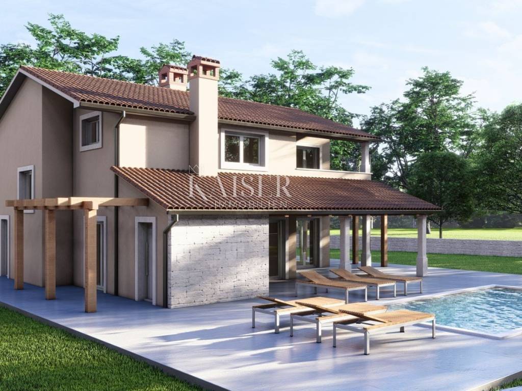Kaiser Immobilien offers for sale a new, detached stone villa in the heart of Istria. The villa is located on its own plot, surrounded by a beautiful garden. It is located on the edge of a small autochthonous village, with only a few neighboring houses nearby. Right next to the villa, another very similar detached villa of slightly larger square footage is being built. The villa has a ground floor and a first floor, within the villa there are 3 bedrooms with 3 bathrooms, a living room. kitchen and dining room. The view from the villa is provided through large glass windows of very high quality. The entire villa is built with high-quality materials. The heating of the villa will be on the floor. Some of the exterior walls of the villa are covered with stone, which gives it a special autochthonous look and beauty. The courtyard of the villa is planned to be landscaped with a landscaped lawn and beautiful plants specific to this part of Istria. The villa has its own separate entrance and access road. The completion of the construction of the villa is planned for the beginning of 2024. If you want this new villa to be your new home in Istria, contact your agent.