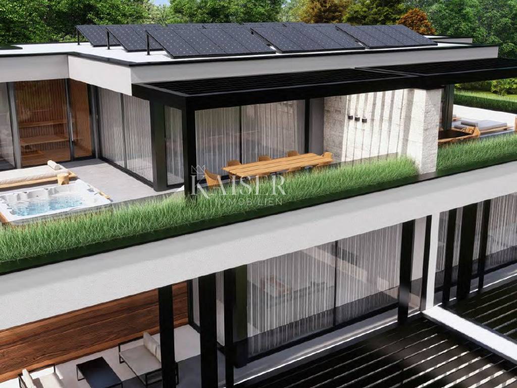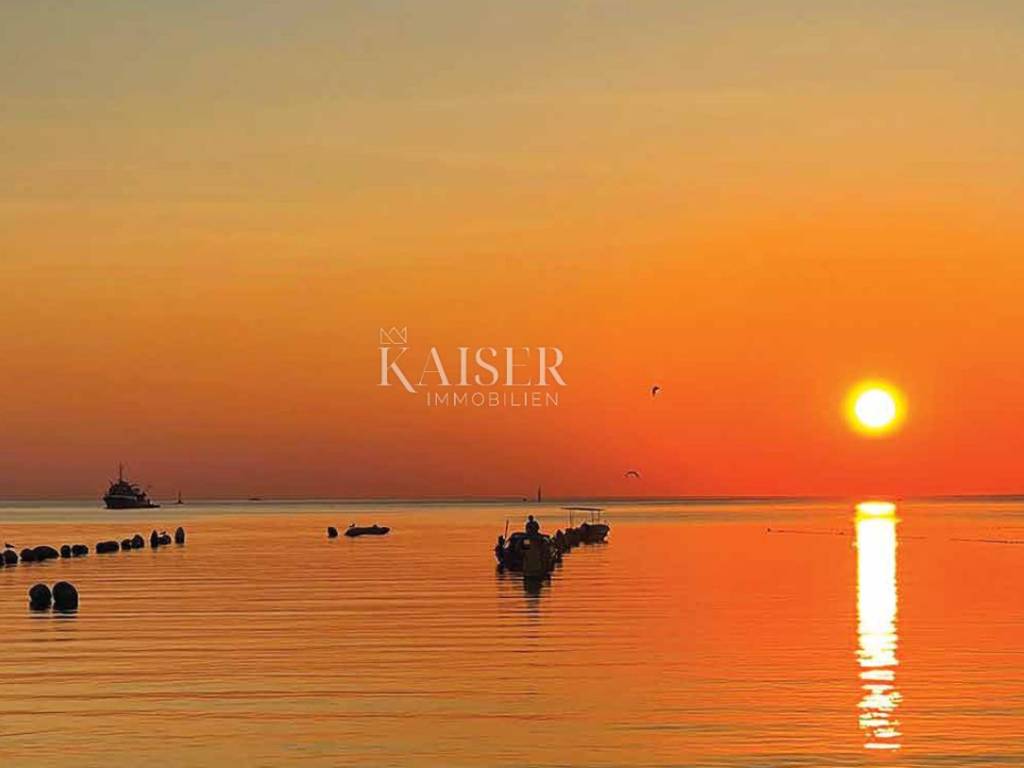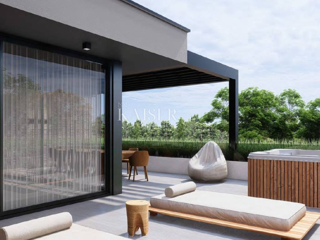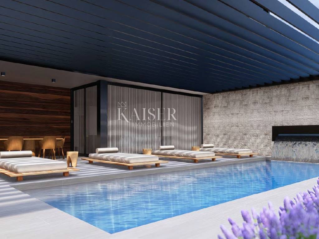 Kaiser Immobilien presents a wonderful luxury apartment on the ground floor with a swimming pool and a view of the sea. The apartment is located not far from the city of Poreč, only one kilometer from the sea and the first beaches. The position of the apartment guarantees a combination of luxury and tradition on the edge of a small settlement in untouched nature. This magnificent apartment provides everything you need for your new luxurious life in Istria. The apartment is located on the ground floor of a house that contains a total of four apartments. The apartment has a beautiful luxurious swimming pool 9x3 square meters with the option of heating via a heat pump and two covered parking spaces. The apartments are built to the highest quality level, and attention is paid to every detail and customer's needs, so that your new life in Istria will be as carefree and pleasant as possible. All construction is massive, the walls will be plastered fine and rough and the color of the walls will be white. Ceramics will be first class in larger formats. The carpentry is PVC, high-quality, three-layer with electric blinds with mosquito nets. Woodwork color anthracite matt. The apartment has two bedrooms, each with its own bathroom, and an additional guest toilet and anteroom. The kitchen, living room and dining room have an open space look, soft beige colors with a wonderful view of the pool. The outdoor terrace is covered, which will additionally protect you from the sun or rain. In the yard there is a storage room for alt and additional supplies and an engine room. The outer part of the garden will be sown with grass. Next to the pool there is the possibility of installing fitness equipment and a sauna. Distance of the property to the city: Poreč - Pula Airport, 45 km Poreč - Ljubljana, 162 km Poreč - Vienna, 544 km Poreč - Prague, 868 km Poreč - Munich, 565 km If you want this wonderful luxury apartment with an irresistible look to become your new dom., contact the agent at phone number 00385 923782803, or at the email address: ivana@kaiser-immobilien.hr. Agency commission is 3% + VAT.