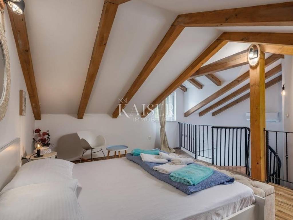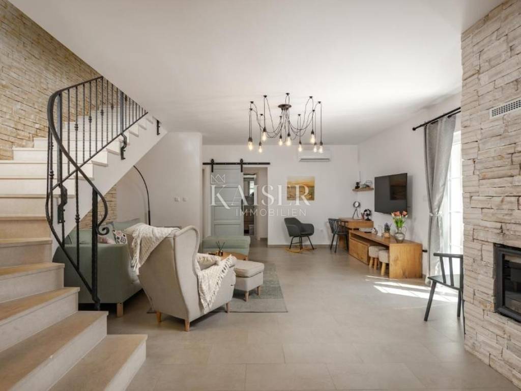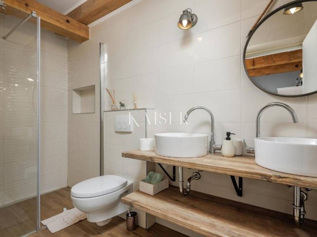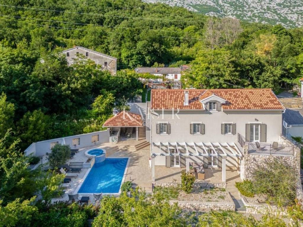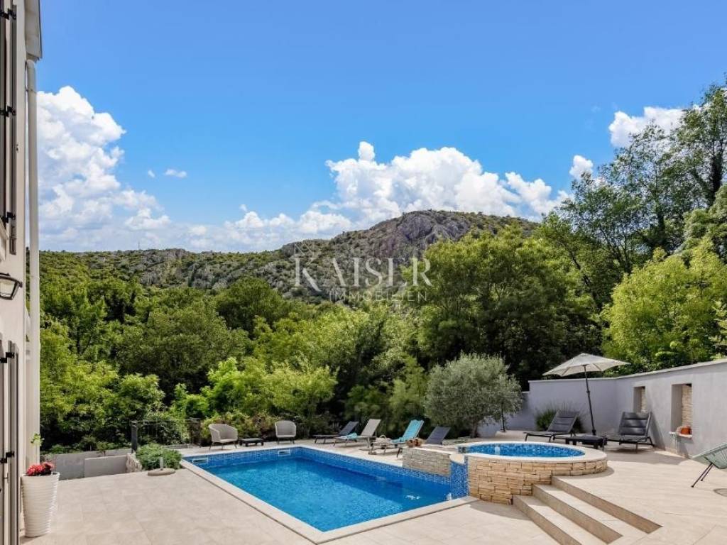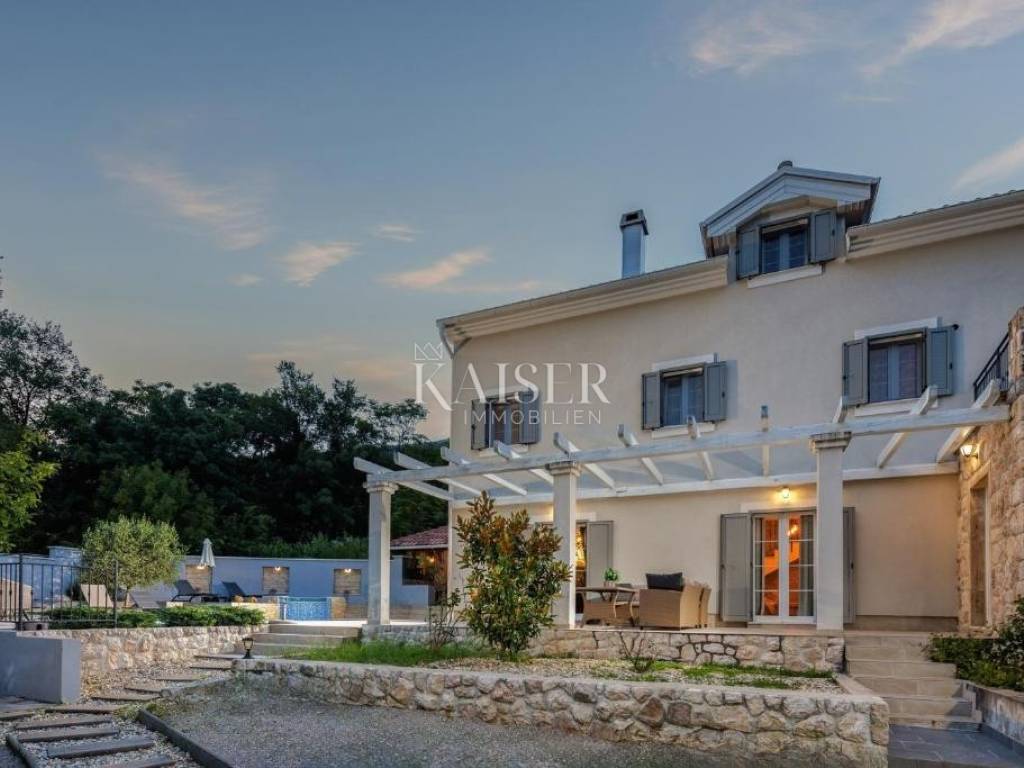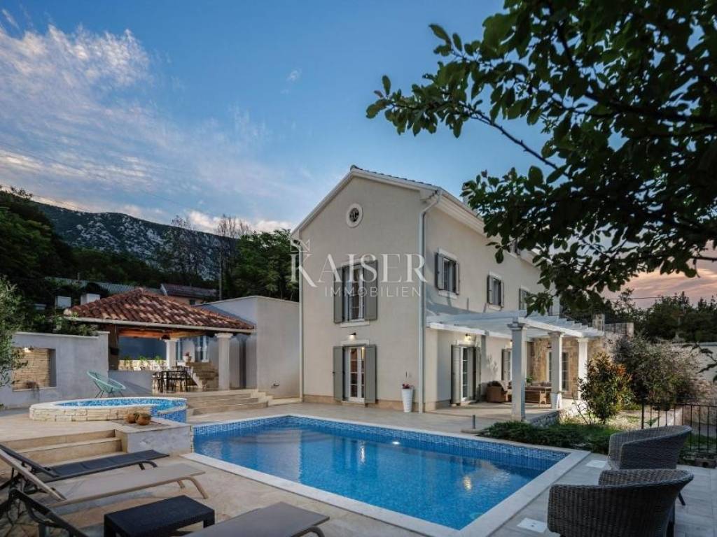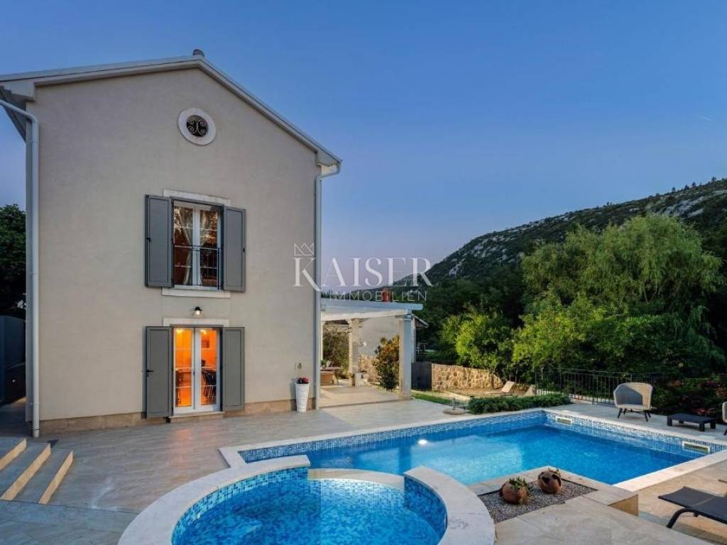 Kaiser Immobilien agency offers a modern house located in a quiet, idyllic location in the hinterland of Crikvenica, in the beautiful Vinodol Valley, in Drivenik. The approach to the house through nature itself is an indicator of the unique location of this property. Drivenik is known for its castle, whose name testifies that it was originally wooden, but with the arrival of the Frankopans it was built of stone, and Drivenik is one of the 9 towns mentioned in the Vinodol Code. Drivenik itself is located in an exceptional location, both for living and for vacation. All important facilities for family life are nearby, and Crikvenica with its beaches and the sea is less than 10 km away, and Gorski kotar is about 20 minutes drive away. The villa with a total of 180 m2 of total area is located on a fully fenced plot of 700 m2 and offers complete privacy. It was built in 2019, modern and luxuriously decorated so that it provides exceptional comfort, and at the same time the warmth and intimacy of a real home. Every detail has been taken care of so that the rustic charm of wooden beams and exposed stone is combined with modern comfort and coziness. On the ground floor there is a large open living area with a fireplace consisting of a cozy, spacious living room connected to the dining room and a modernly equipped functional kitchen with access to the Mediterranean garden and pool, a bedroom with access to the terrace and its own bathroom, a storage room and a toilet. On the first floor there are 3 bedrooms with bathrooms, one room has its own balcony, the other has a French balcony, the room in the middle has its own gallery with an additional double bed. The house has underfloor heating, air-conditioned rooms and a fireplace with a warm air outlet that can heat the upper floor. Next to the charming Mediterranean garden there is a stone terrace and a large swimming pool (with a salt electrolysis pool cleaning system), a barbecue, an outdoor gazebo with a kitchenette and parking for several cars. Crikvenica, beach: 9 km, Fužine: 23 km, Rijeka: 25 km, Rijeka airport: 15 km, Zagreb airport: 168 km, Trieste airport: 133 km, Munich, Vienna: 530 km, Ljubljana: 138 km. For all further information, please contact: Marijana Cuculić Phone: + 385 98 186 9950 E-mail: marijana.cuculic@kaiser-immobilien.hr
