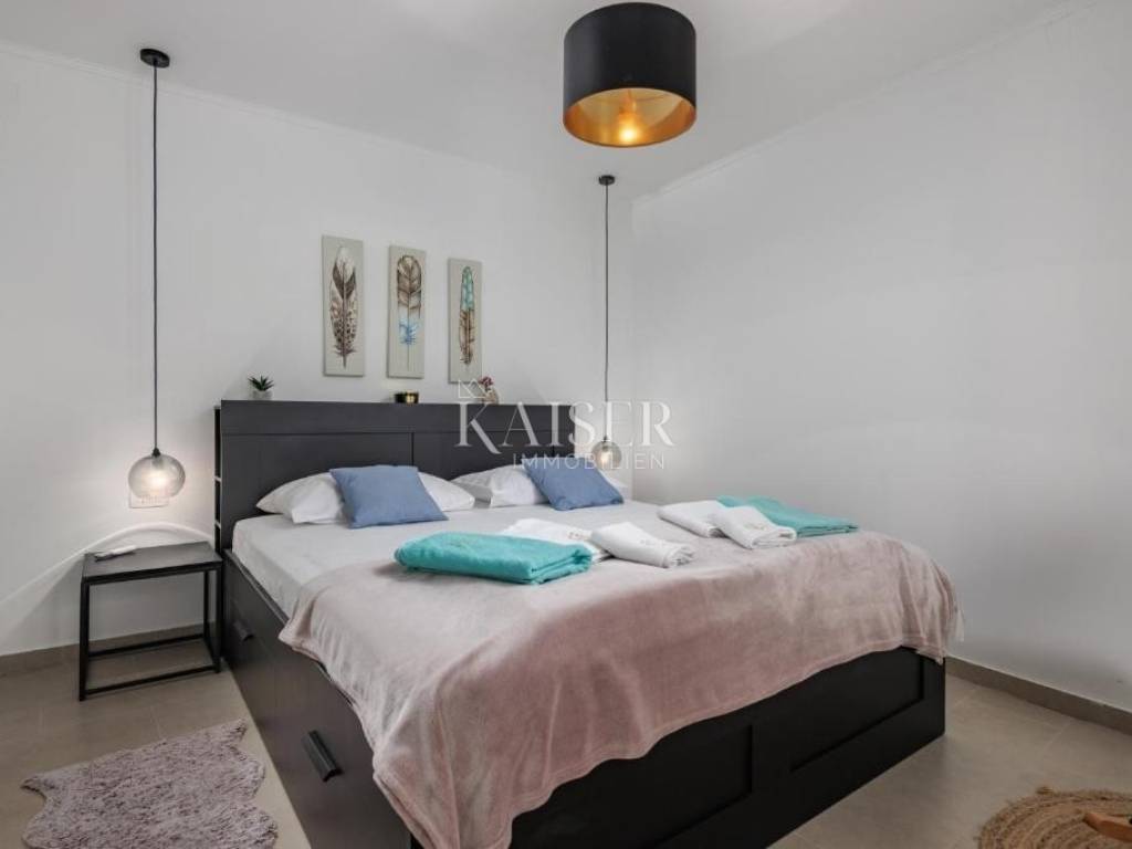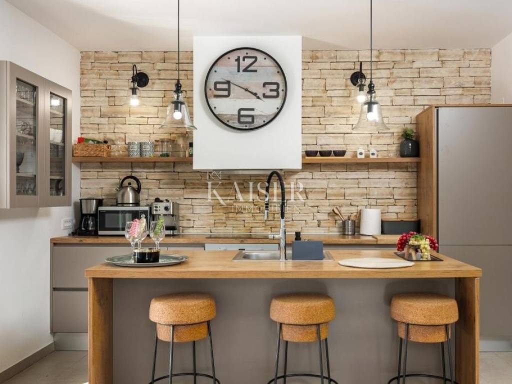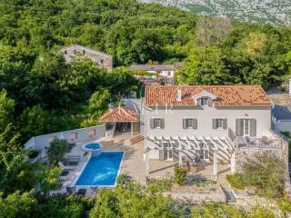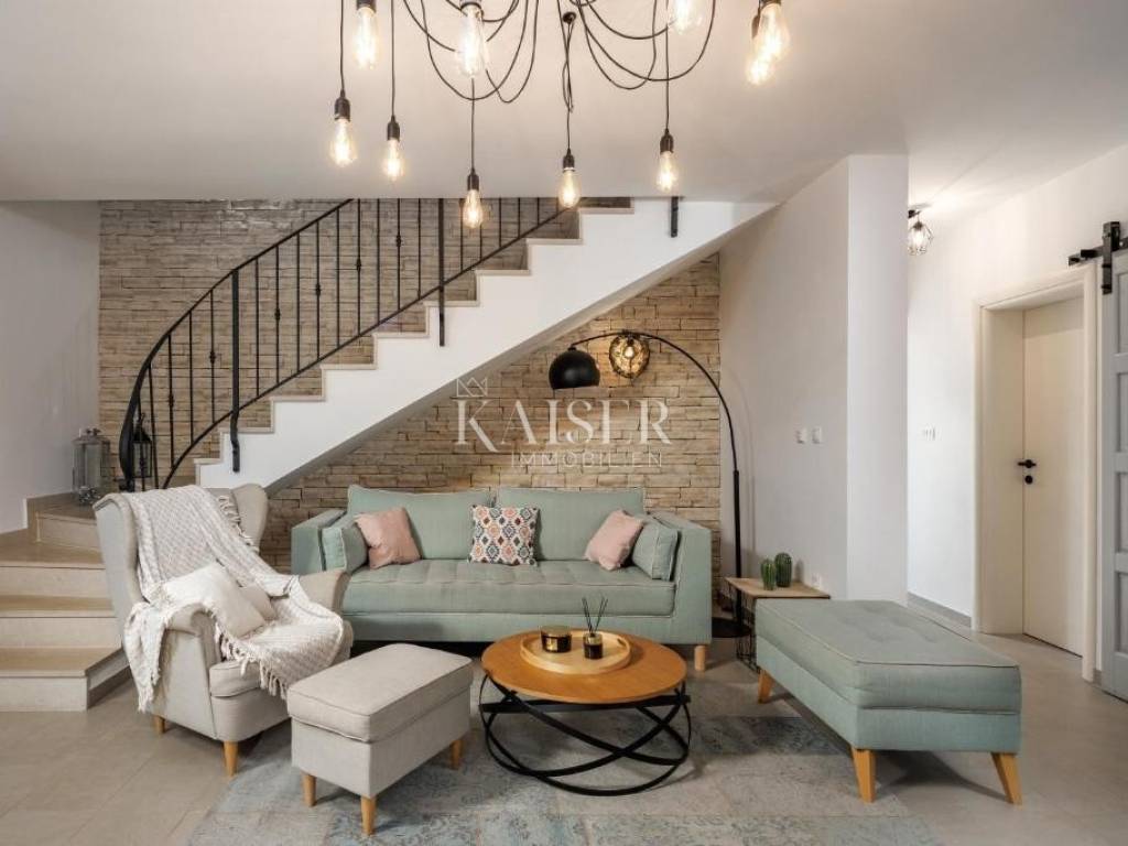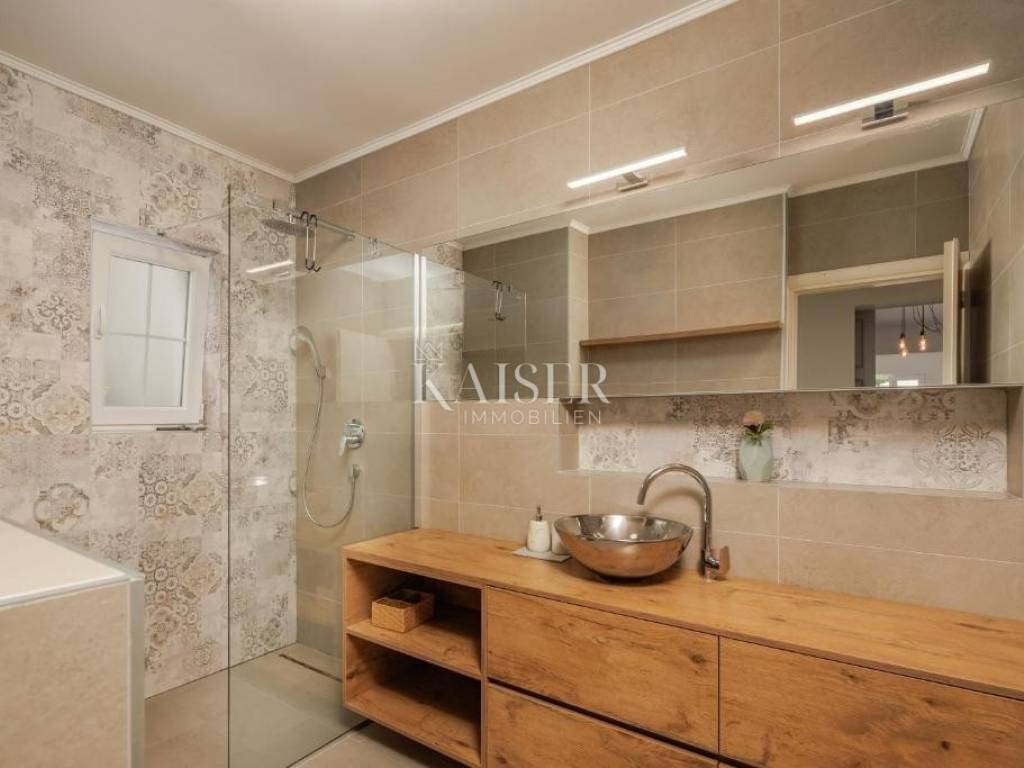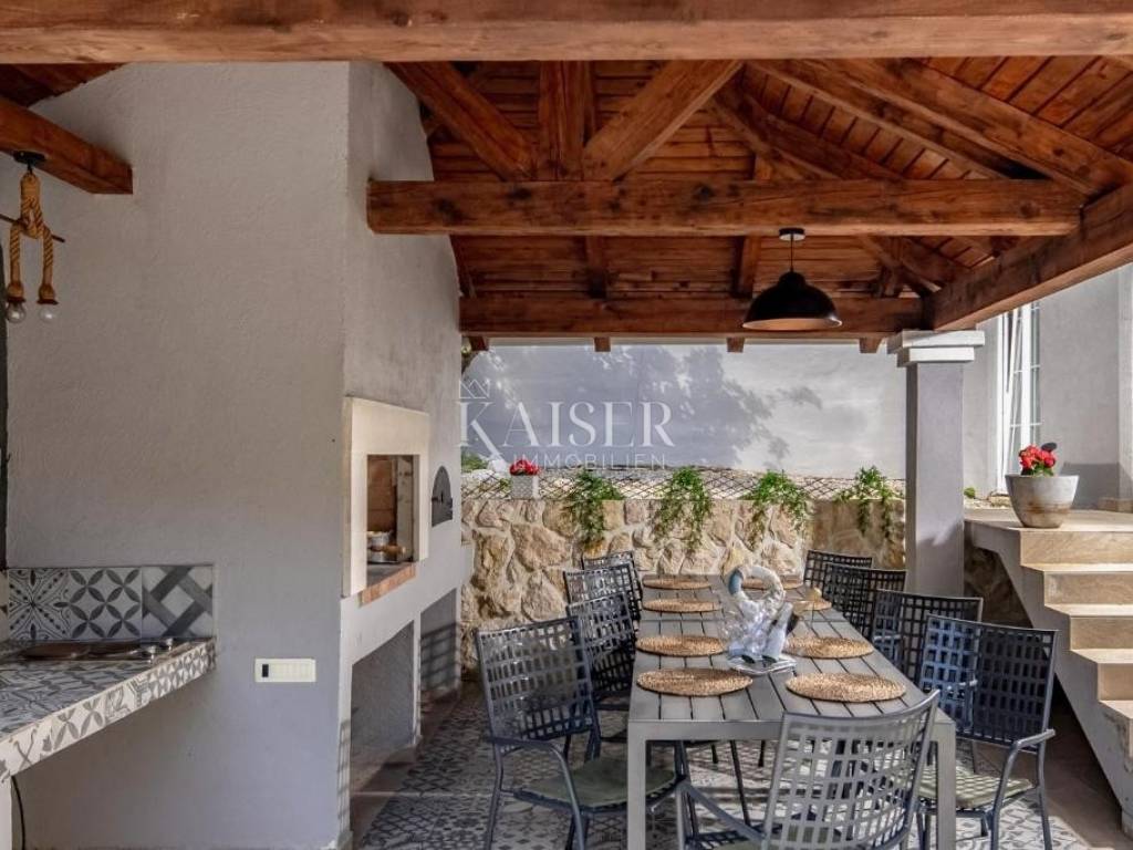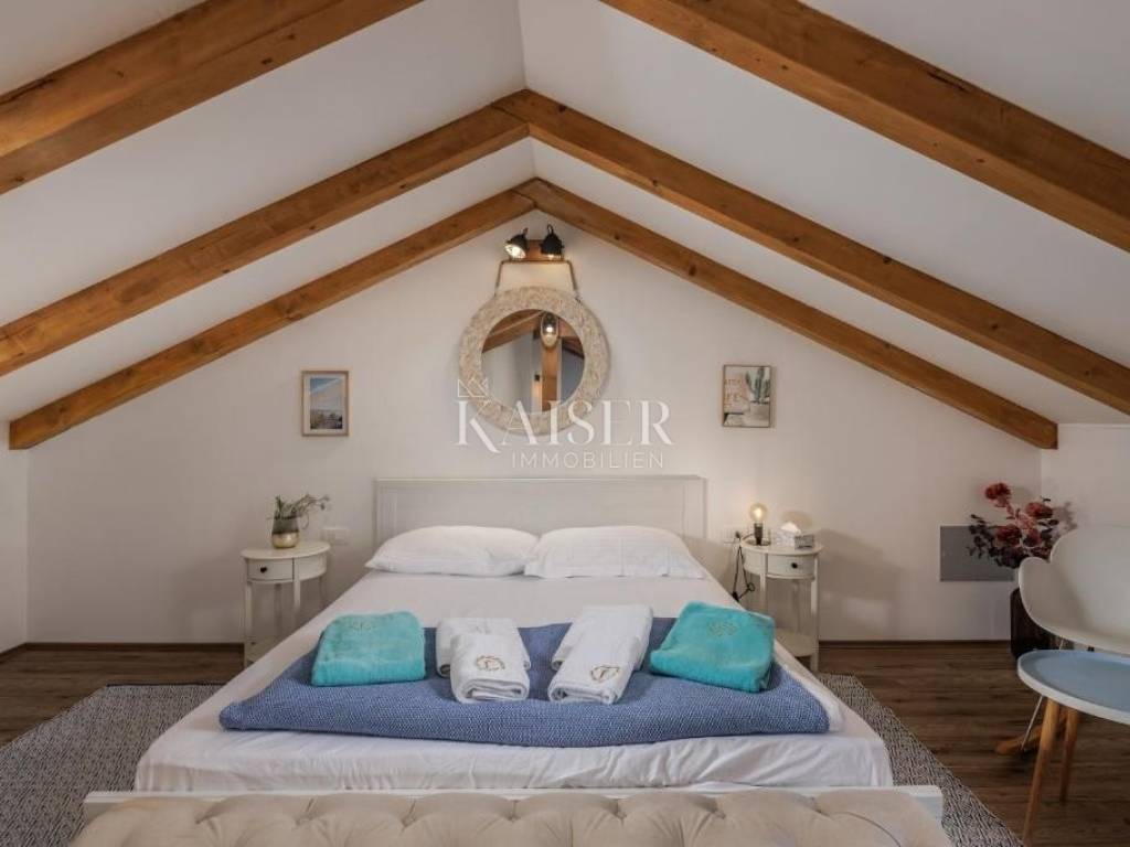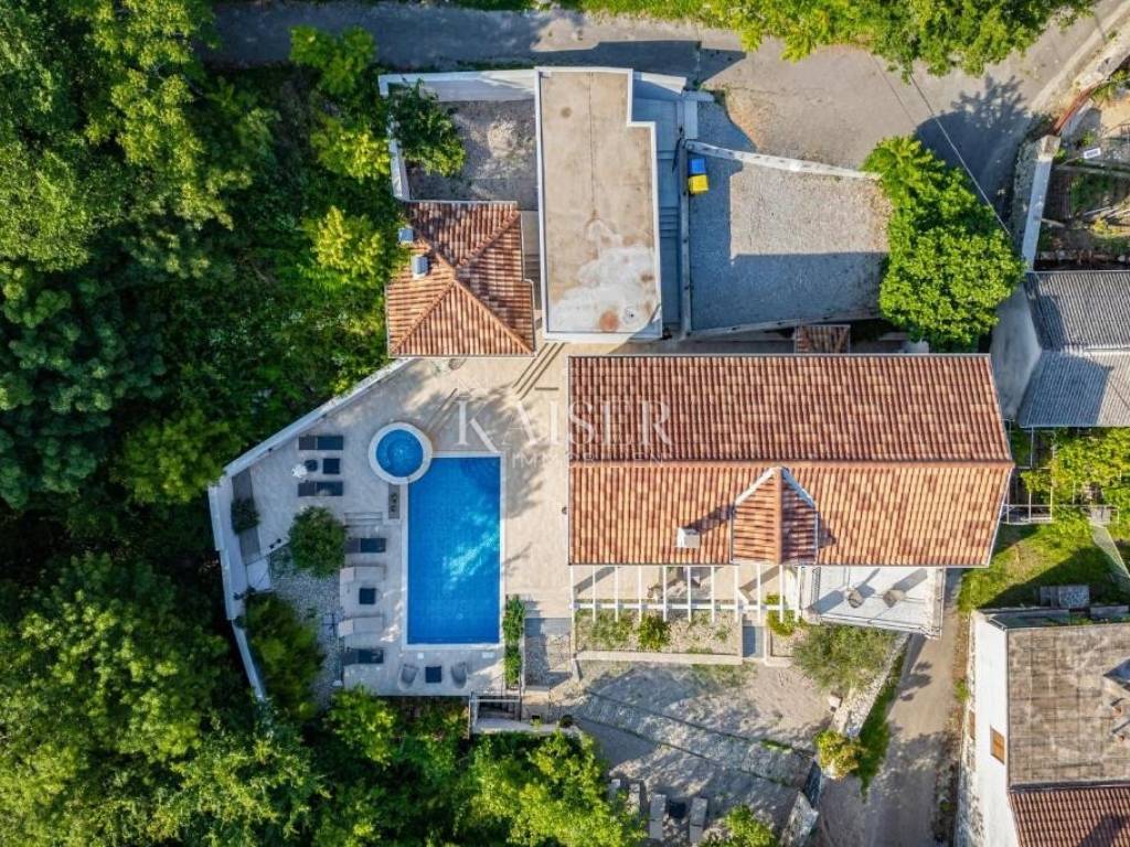 Kaiser Immobilien agency offers a modern house located in a quiet, idyllic location in the hinterland of Crikvenica, in the beautiful Vinodol Valley, in Drivenik. The approach to the house through nature itself is an indicator of the unique location of this property. Drivenik is known for its castle, whose name testifies that it was originally wooden, but with the arrival of the Frankopans it was built of stone, and Drivenik is one of the 9 towns mentioned in the Vinodol Code. Drivenik itself is located in an exceptional location, both for living and for vacation. All important facilities for family life are nearby, and Crikvenica with its beaches and the sea is less than 10 km away, and Gorski kotar is about 20 minutes drive away. The villa with a total of 180 m2 of total area is located on a fully fenced plot of 700 m2 and offers complete privacy. It was built in 2019, modern and luxuriously decorated so that it provides exceptional comfort, and at the same time the warmth and intimacy of a real home. Every detail has been taken care of so that the rustic charm of wooden beams and exposed stone is combined with modern comfort and coziness. On the ground floor there is a large open living area with a fireplace consisting of a cozy, spacious living room connected to the dining room and a modernly equipped functional kitchen with access to the Mediterranean garden and pool, a bedroom with access to the terrace and its own bathroom, a storage room and a toilet. On the first floor there are 3 bedrooms with bathrooms, one room has its own balcony, the other has a French balcony, the room in the middle has its own gallery with an additional double bed. The house has underfloor heating, air-conditioned rooms and a fireplace with a warm air outlet that can heat the upper floor. Next to the charming Mediterranean garden there is a stone terrace and a large swimming pool (with a salt electrolysis pool cleaning system), a barbecue, an outdoor gazebo with a kitchenette and parking for several cars. Crikvenica, beach: 9 km, Fužine: 23 km, Rijeka: 25 km, Rijeka airport: 15 km, Zagreb airport: 168 km, Trieste airport: 133 km, Munich, Vienna: 530 km, Ljubljana: 138 km. For all further information, please contact: Marijana Cuculić Phone: + 385 98 186 9950 E-mail: marijana.cuculic@kaiser-immobilien.hr