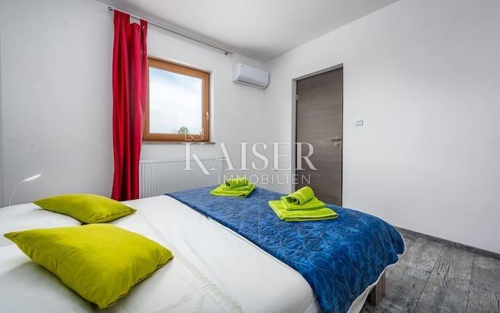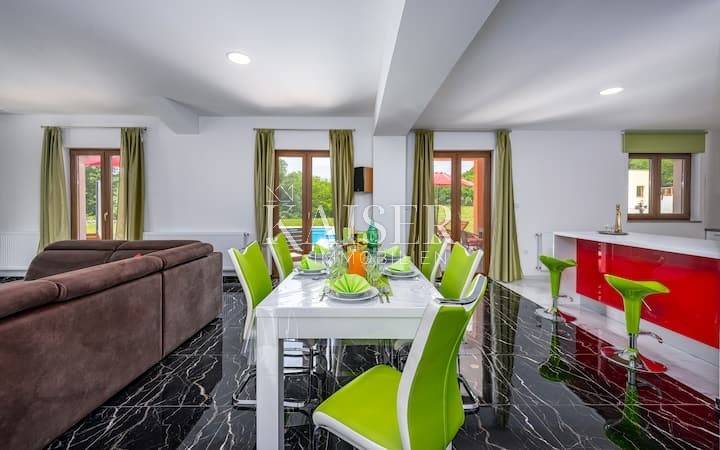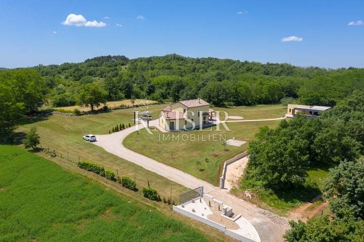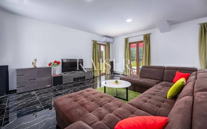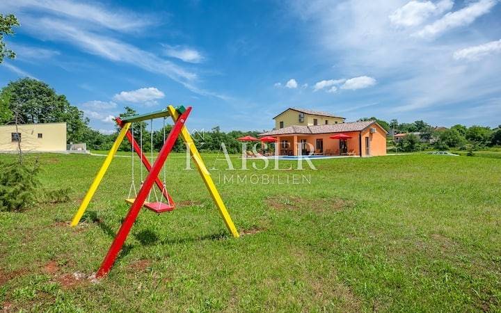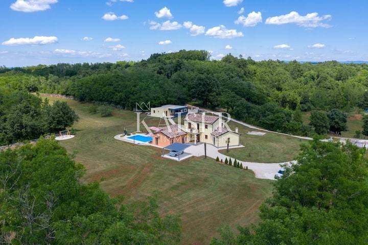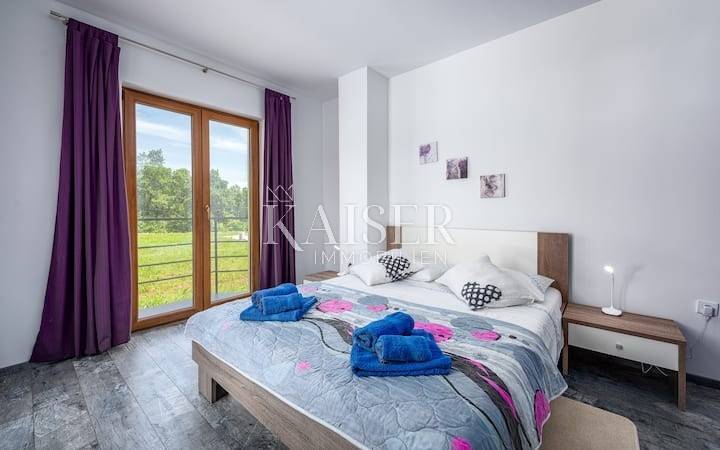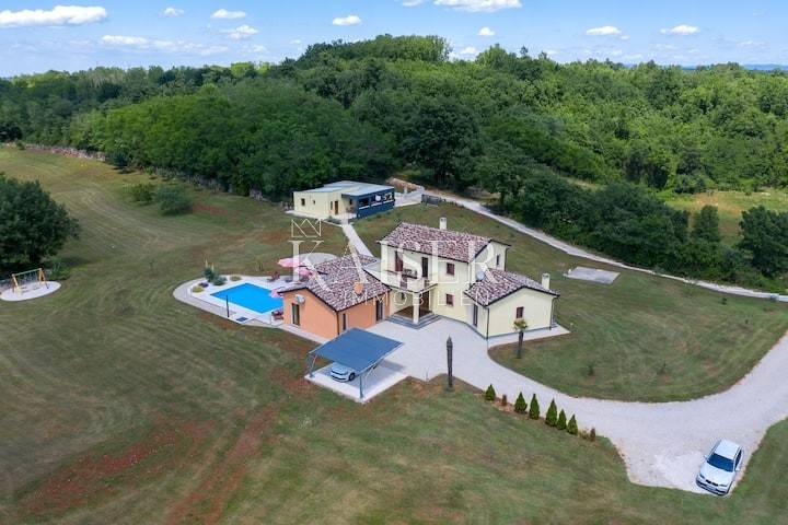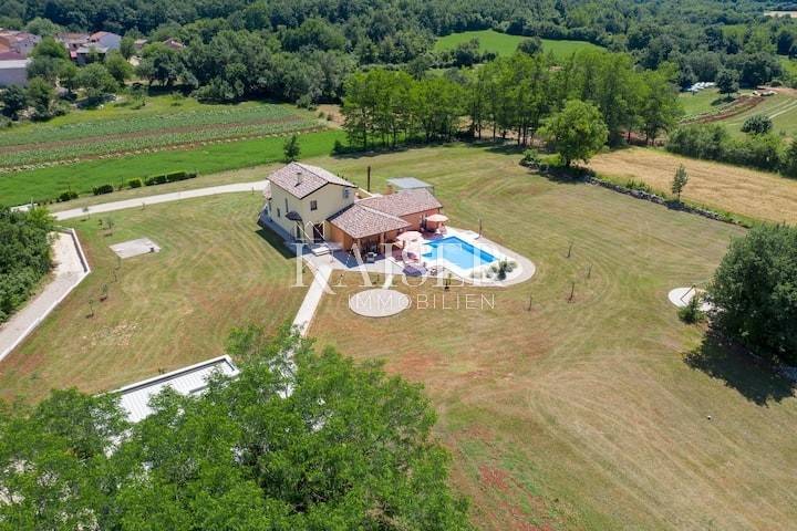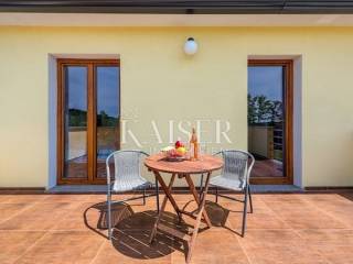 Kaiser Immobilien is selling a beautiful house with a swimming pool located in a small village in central Istria. The large garden of 12,000 m2 allows you to enjoy the beauty of nature in this villa, while at the same time offering you proximity to the most beautiful towns in Istria. All city amenities are located in Pazin, which is about 10 km away, and the accommodation in central Ista provides good traffic connections with the rest of the peninsula. It extends to 300 m2, and the garden is surrounded by dry wall. The ground floor consists of an entrance hall, an open living room with a kitchen and a dining room, on the first floor there are three bedrooms and two bathrooms. In the second part of the house, a separate entrance leads to a separate apartment of 40 square meters, which consists of a living room with a kitchen and dining room, a bedroom and a bathroom. From the living room there is access to a covered terrace and a pool of 50 m2. Not far from the house there is a summer kitchen of 50 square meters and a garage of 40 square meters, which, due to its separation from the house, could be converted into another residential unit. The house has an established tourist rental business that the new owner can take over.