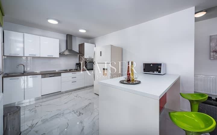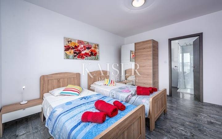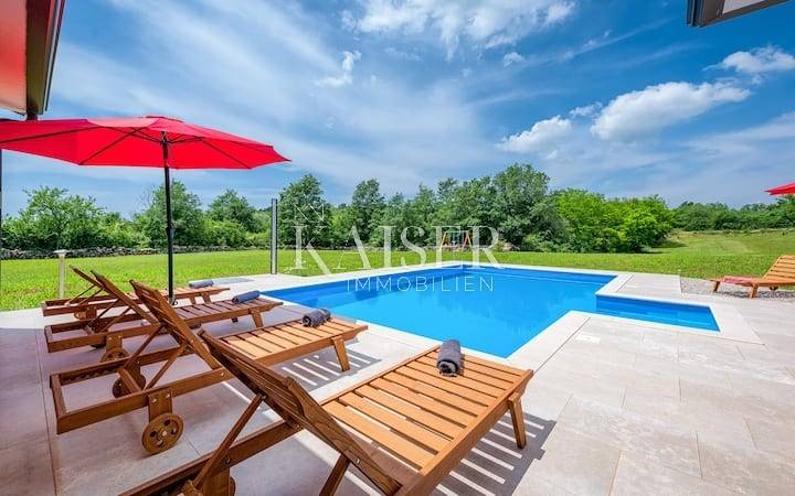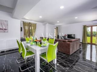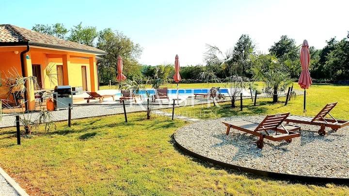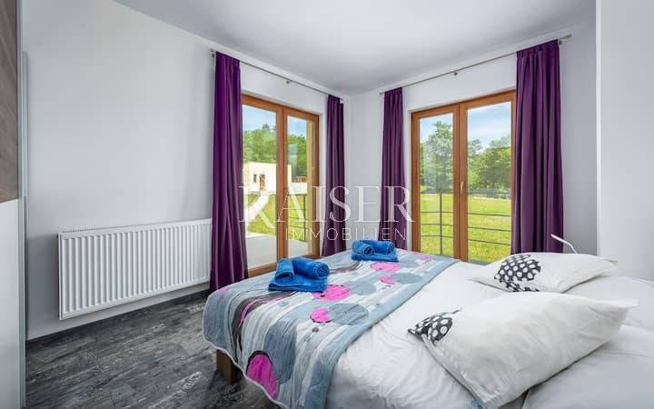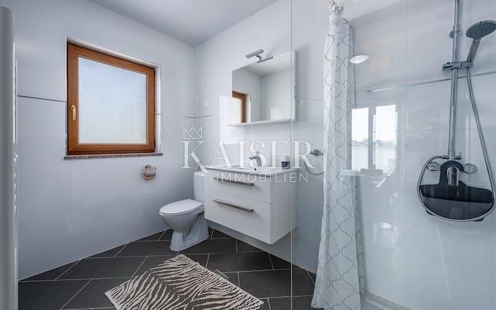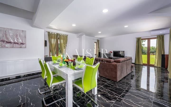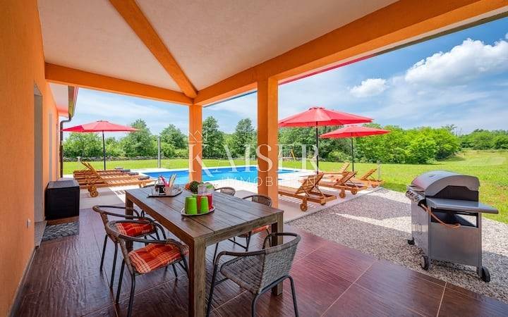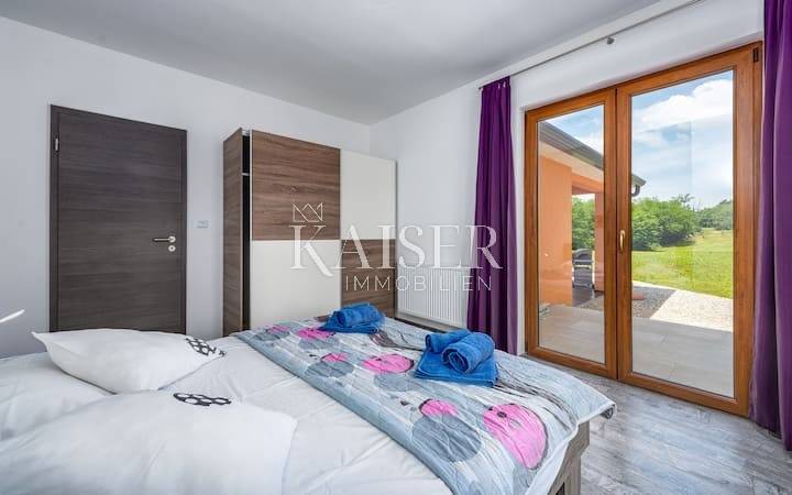Kaiser Immobilien is selling a beautiful house with a swimming pool located in a small village in central Istria. The large garden of 12,000 m2 allows you to enjoy the beauty of nature in this villa, while at the same time offering you proximity to the most beautiful towns in Istria. All city amenities are located in Pazin, which is about 10 km away, and the accommodation in central Ista provides good traffic connections with the rest of the peninsula. It extends to 300 m2, and the garden is surrounded by dry wall. The ground floor consists of an entrance hall, an open living room with a kitchen and a dining room, on the first floor there are three bedrooms and two bathrooms. In the second part of the house, a separate entrance leads to a separate apartment of 40 square meters, which consists of a living room with a kitchen and dining room, a bedroom and a bathroom. From the living room there is access to a covered terrace and a pool of 50 m2. Not far from the house there is a summer kitchen of 50 square meters and a garage of 40 square meters, which, due to its separation from the house, could be converted into another residential unit. The house has an established tourist rental business that the new owner can take over.