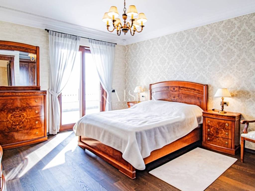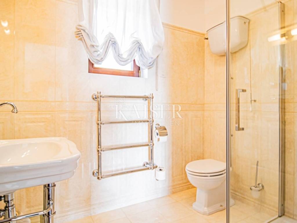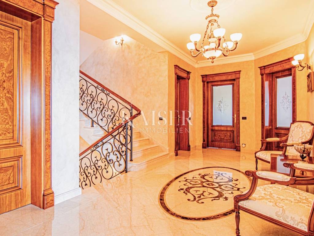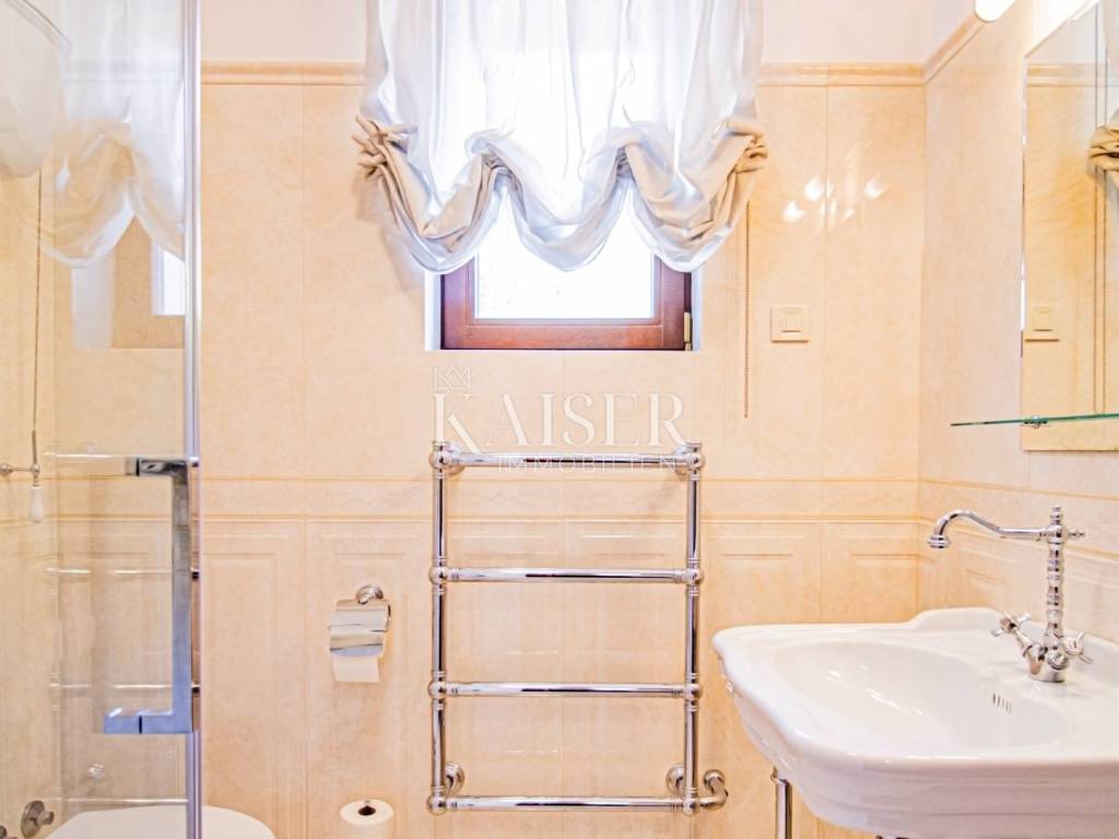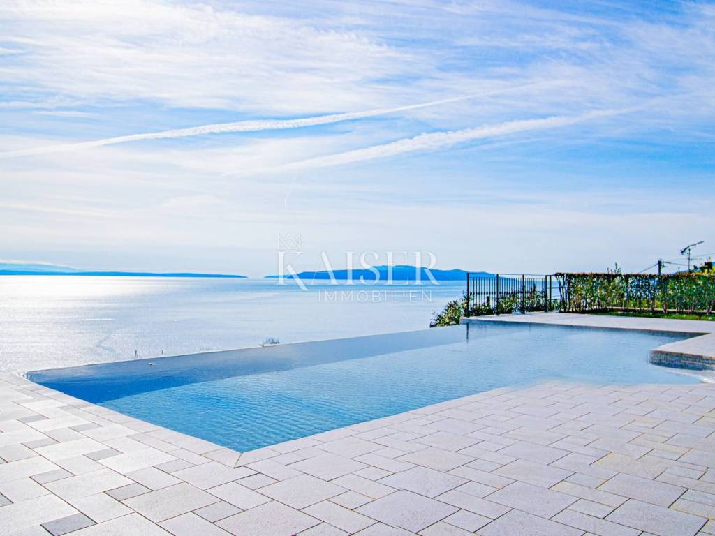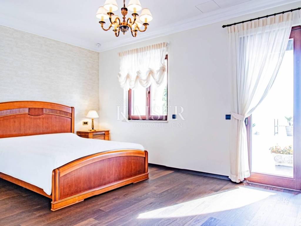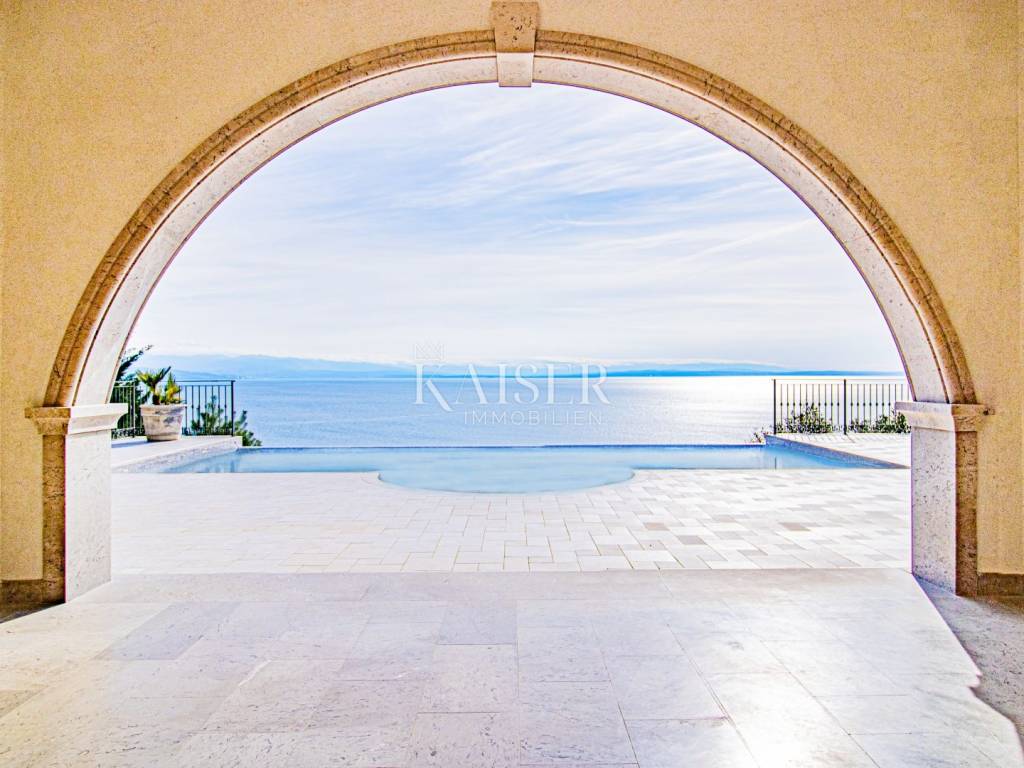Kaiser Immobilien presents a unique property located on the Opatija Riviera, next to Opatija itself, known as the Pearl of the Adriatic. Opatija is synonymous with Mediterranean charm and a top quality of life, and this villa offers the perfect blend of elegance, comfort and luxury. The villa is located on a plot of land measuring 1,435 square meters, while the building itself covers 470 square meters. Its architecture and interior exude a sophisticated style, and the spectacular panoramic view of the sea, the town of Ičići and the ACI marina further emphasizes its exclusivity. Layout of the villa: On the ground floor there is a wellness and fitness area, a storage room, a boiler room, a relaxation room and a luxurious bedroom with a private bathroom. On the first floor there is a living area with a spacious living room, a kitchen and dining room with access to the terrace, a study and an anteroom with a dressing room. The second floor consists of a private night area with three bedrooms, each with its own bathroom. Among them, the large master bedroom stands out, and all rooms have a sea view and access to a spacious shared terrace. Top-notch equipment and materials: The flooring throughout the villa is made of refined Italian Botticino Classico marble combined with Emperador Darko, creating an atmosphere of luxury and elegance. The living room is adorned with a handmade fireplace that further emphasizes the cozy atmosphere of the space. The villa is equipped with Daikin heat pump underfloor heating and fan coils for air conditioning and ventilation. In addition, it is a smart home that allows you to control lighting, heating and security systems via the internet and mobile applications, thus providing maximum comfort and safety. The bedrooms have African oak parquet from the renowned German manufacturer Haro. The bathrooms are equipped with high-quality sanitary ware from the Italian company Olympia Ceramica. The walls are finished with the Velatura technique from the manufacturer San Marco, while the wallpaper is from the Portofino factory. The ceramics are from the Piemme Valentino brand. The doors and furniture are custom-made from solid wood in the Spanish factory Muebles Cercos, while the kitchen is equipped with premium household appliances from the Smeg brand. Outdoor area: This villa offers a beautifully landscaped Mediterranean garden, an infinity pool with a spacious sundeck, covered and uncovered terraces, an outdoor kitchen, a barbecue and an outdoor dining area. The property also has a two-car garage and additional parking spaces for several vehicles. Total built area: 470 m² Indoor area 385 square meters Covered terraces 150 square meters Outdoor infinity pool 50 square meters This villa offers the ideal combination of luxury, comfort and privacy and is the perfect choice for those looking for an exclusive home in one of the most beautiful locations on the Adriatic. Distances to EU cities: Cities: Munich (533 km), Vienna (514 km), Prague (840 km), Budapest (595 km) Airports: Pula (90 km), Rijeka (39 km) Contact us for more information or to arrange an appointment. Phone: +385 91 540 4646 Kaiser Immobilioen – Your partner for premium real estate in Croatia.