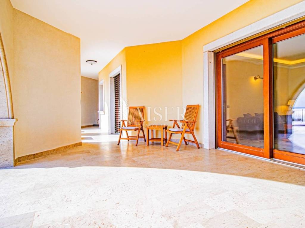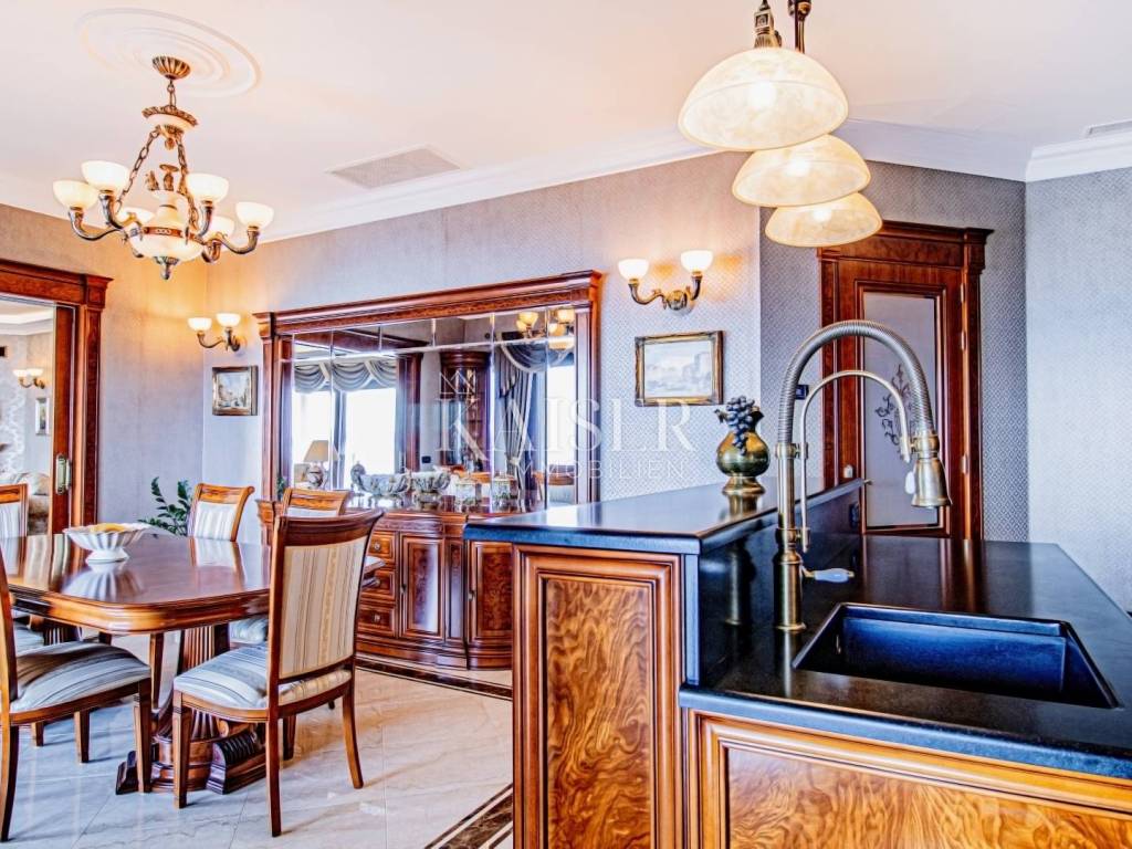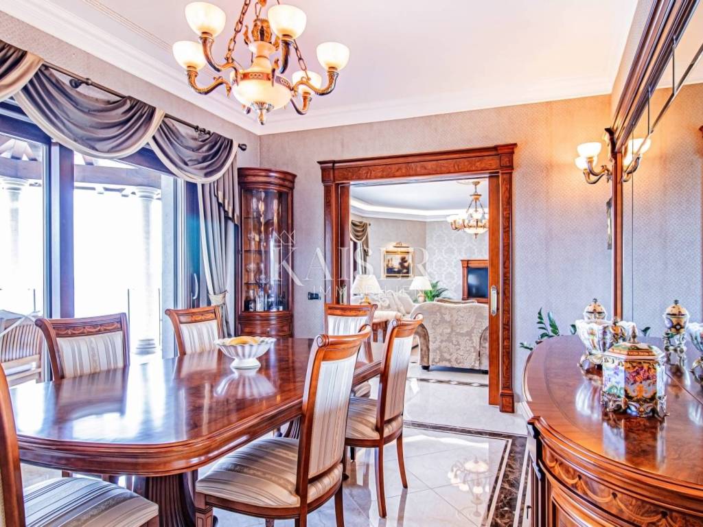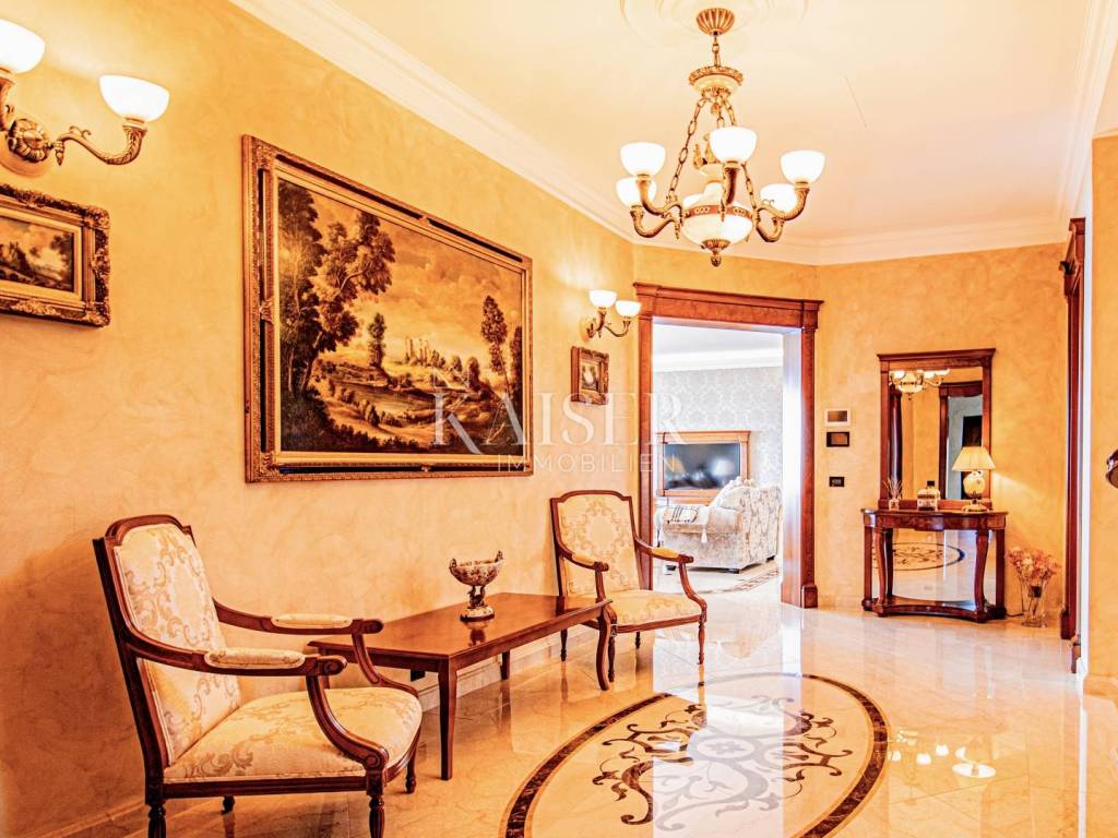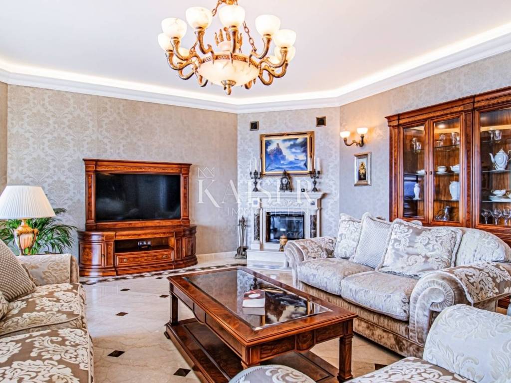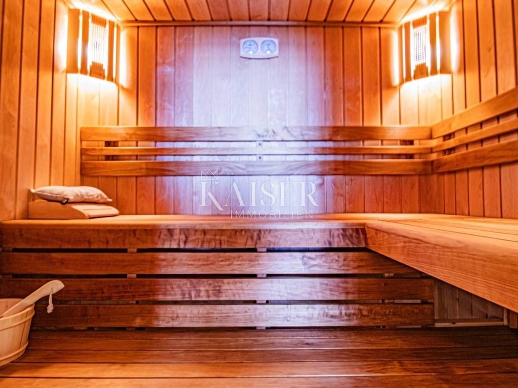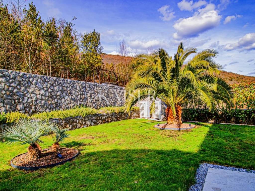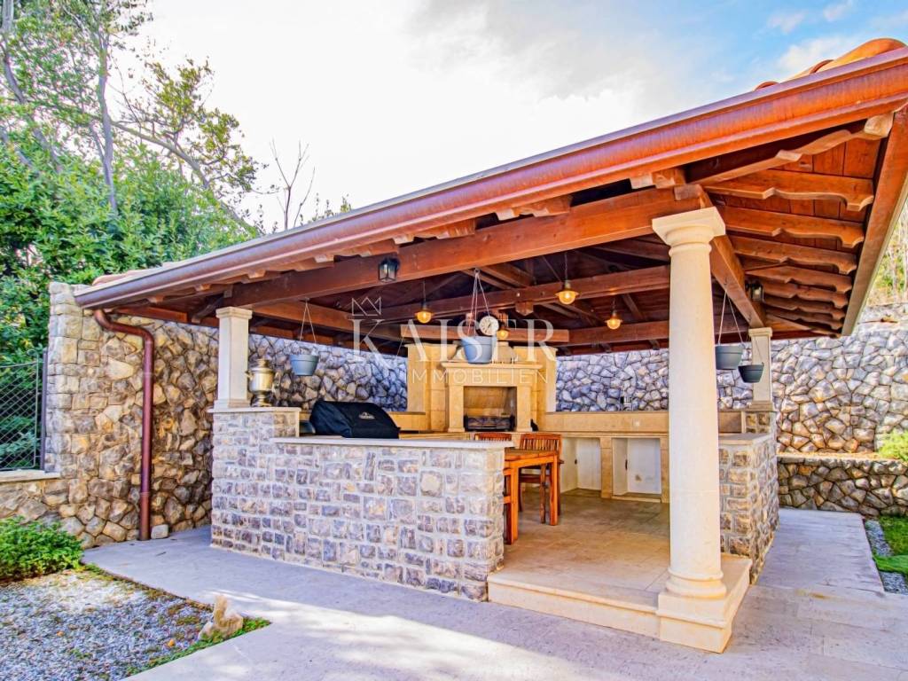 Kaiser Immobilien presents a unique property located on the Opatija Riviera, next to Opatija itself, known as the Pearl of the Adriatic. Opatija is synonymous with Mediterranean charm and a top quality of life, and this villa offers the perfect blend of elegance, comfort and luxury. The villa is located on a plot of land measuring 1,435 square meters, while the building itself covers 470 square meters. Its architecture and interior exude a sophisticated style, and the spectacular panoramic view of the sea, the town of Ičići and the ACI marina further emphasizes its exclusivity. Layout of the villa: On the ground floor there is a wellness and fitness area, a storage room, a boiler room, a relaxation room and a luxurious bedroom with a private bathroom. On the first floor there is a living area with a spacious living room, a kitchen and dining room with access to the terrace, a study and an anteroom with a dressing room. The second floor consists of a private night area with three bedrooms, each with its own bathroom. Among them, the large master bedroom stands out, and all rooms have a sea view and access to a spacious shared terrace. Top-notch equipment and materials: The flooring throughout the villa is made of refined Italian Botticino Classico marble combined with Emperador Darko, creating an atmosphere of luxury and elegance. The living room is adorned with a handmade fireplace that further emphasizes the cozy atmosphere of the space. The villa is equipped with Daikin heat pump underfloor heating and fan coils for air conditioning and ventilation. In addition, it is a smart home that allows you to control lighting, heating and security systems via the internet and mobile applications, thus providing maximum comfort and safety. The bedrooms have African oak parquet from the renowned German manufacturer Haro. The bathrooms are equipped with high-quality sanitary ware from the Italian company Olympia Ceramica. The walls are finished with the Velatura technique from the manufacturer San Marco, while the wallpaper is from the Portofino factory. The ceramics are from the Piemme Valentino brand. The doors and furniture are custom-made from solid wood in the Spanish factory Muebles Cercos, while the kitchen is equipped with premium household appliances from the Smeg brand. Outdoor area: This villa offers a beautifully landscaped Mediterranean garden, an infinity pool with a spacious sundeck, covered and uncovered terraces, an outdoor kitchen, a barbecue and an outdoor dining area. The property also has a two-car garage and additional parking spaces for several vehicles. Total built area: 470 m² Indoor area 385 square meters Covered terraces 150 square meters Outdoor infinity pool 50 square meters This villa offers the ideal combination of luxury, comfort and privacy and is the perfect choice for those looking for an exclusive home in one of the most beautiful locations on the Adriatic. Distances to EU cities: Cities: Munich (533 km), Vienna (514 km), Prague (840 km), Budapest (595 km) Airports: Pula (90 km), Rijeka (39 km) Contact us for more information or to arrange an appointment. Phone: +385 91 540 4646 Kaiser Immobilioen – Your partner for premium real estate in Croatia.