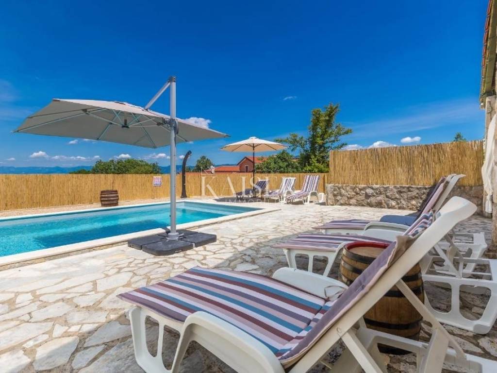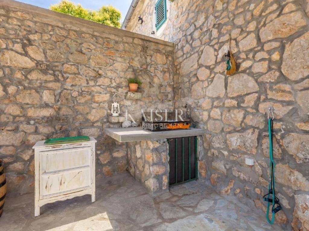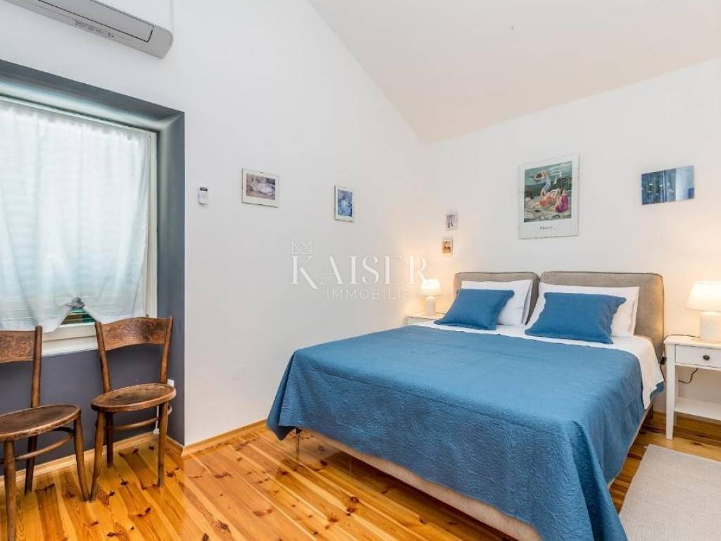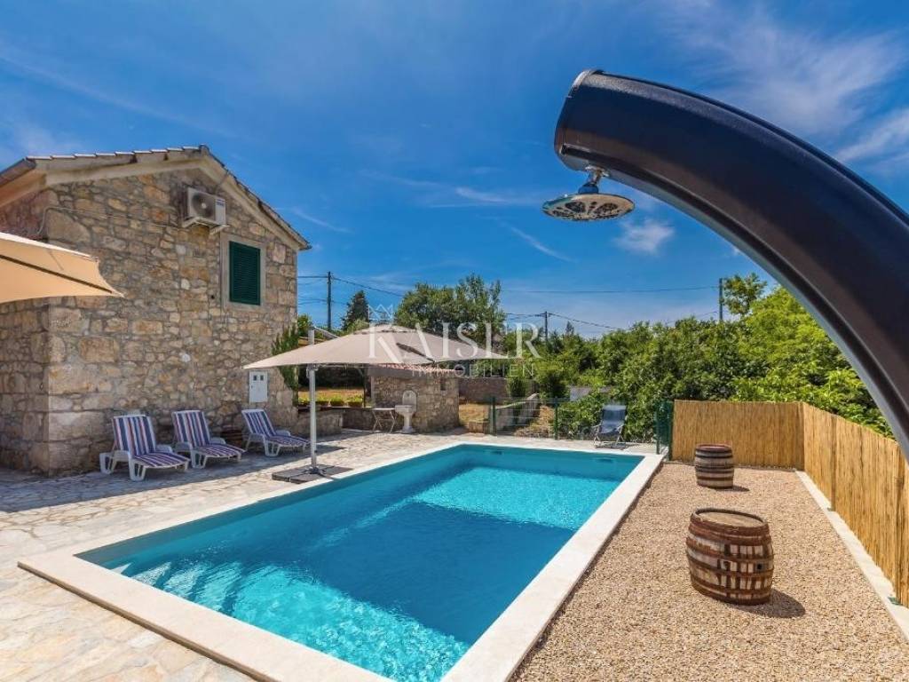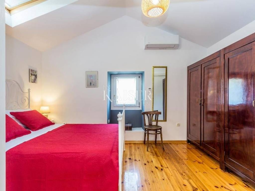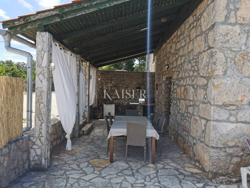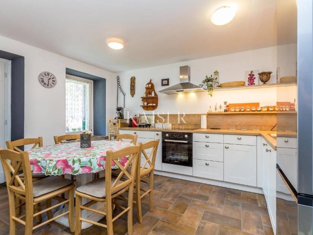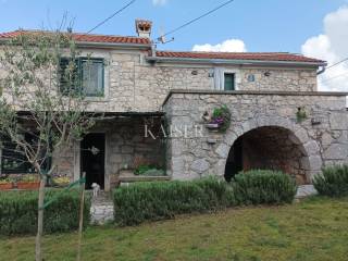 Kaiser Imobillien agency offers an authentic renovated house in the idyllic small town of Rasopasno on Krk. Rasopasno is located in the western part of the Dobrinj municipality, in the interior of the island, yet close enough to reach the sea and the summer breeze very quickly, and upon return, peace and quiet, a gentle breeze and birdsong are guaranteed. It was named after the rosopas plant, which in Dobrinj is also called Marijina rožica, and which, after being picked, releases red juice, and is very medicinal. Located in the hinterland of Malinska, this renovated old stone house offers a unique opportunity for both vacation and family life, because Malinska has everything you need for a comfortable family life. The living space of this wonderful, warm house extends through the ground floor and first floor. On the ground floor there is a living area consisting of a charming equipped kitchen with a dining room and a living room where the central part is occupied by a wood-burning stove, spreading a warm, old-fashioned touch. The living room opens onto a covered terrace, which, along with a large 35 m2 swimming pool, makes an ideal space for relaxation and enjoyment in the peace and greenery of untouched nature. The stone terrace, many Mediterranean plants and a light breeze guarantee idyllic evenings by the pool and barbecue, a glass of wine and a good snack. On the first floor there are two bedrooms and an elegant modern bathroom. The entrance hall of the first floor is decorated as a corner for enjoyment and has an exit to a balcony from which you can enjoy the beautiful nature and environment. The garden is large, 744 m2, decorated in an indigenous style, with an abundance of fragrant Mediterranean plants that are not demanding and can withstand the sun and heat. The old well and olive tree, stone vaults and stairs make this property an irresistible reminder of the good old days, and the interior offers all the comfort and convenience characteristic of today. There are also two storage rooms and parking spaces for several vehicles on the plot. Malinska: 3.8 km Punat: 20 km Krk: 15 km Rijeka: 38 km Rijeka airport: 16 km Zagreb airport: 180 km Munich, Vienna: 550 km Ljubljana: 150 km The agency commission for the buyer is 3% + VAT, and is paid only when the property is sold, when the first legal deed is signed. For all further information, please contact: Marijana Cuculić Phone: + 385 98 186 9950 WhatsApp, Viber E-mail: marijana.cuculic@kaiser-immobilien.hr