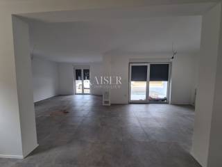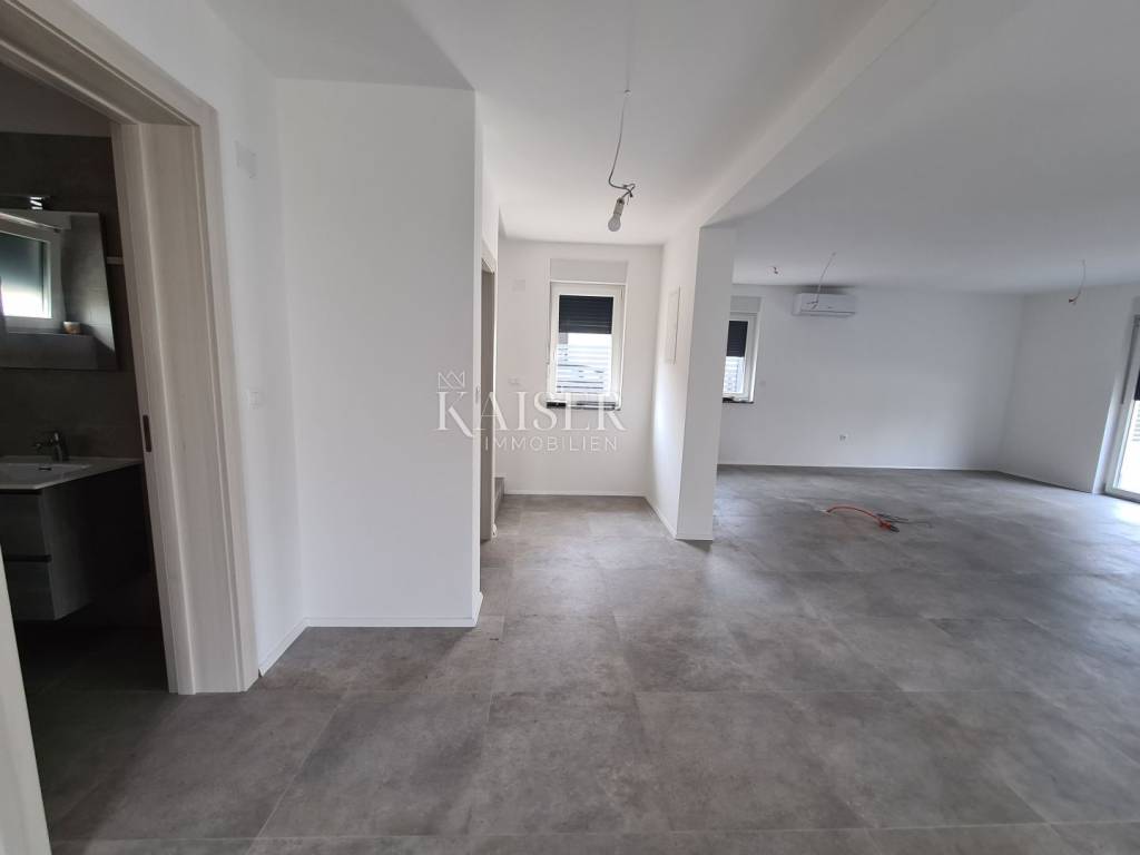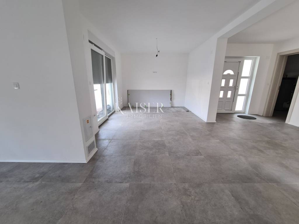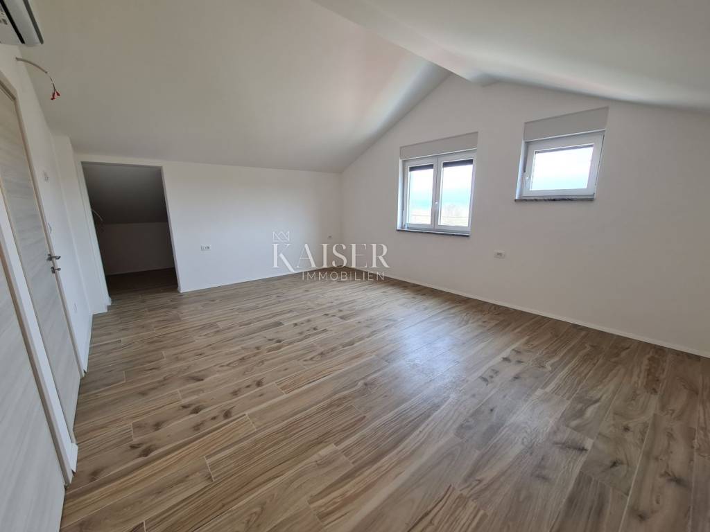 Kaiser immobilien offers a detached house with a sea view in the vicinity of Malinska, in an exceptionally well-connected location. This new building with a living area of 194m2 is divided into two floors. On the ground floor there is a living room and a kitchen, a bathroom, a toilet, a storage room, a boiler room and a covered terrace. Internal stairs lead to the first floor, which consists of three bedrooms and three bathrooms, and a covered terrace with a view of the sea. The house also has a spacious garden of 630m2, which will be landscaped with Mediterranean vegetation, and which has enough space for parking spaces, but also for the construction of a swimming pool and sunbathing area. During the construction, quality materials were used, PVC carpentry, high-quality sanitary ware and ceramic floors, underfloor heating was installed in the bathrooms, all rooms are air-conditioned, and the house also has a chimney and preparation for a fireplace.