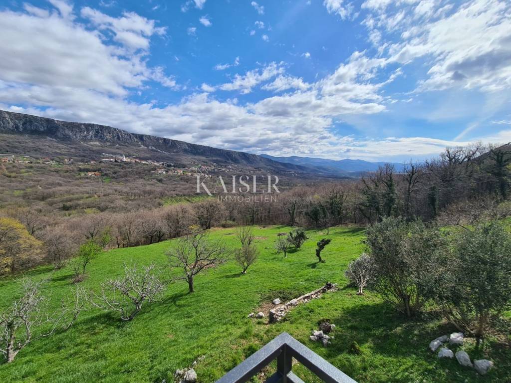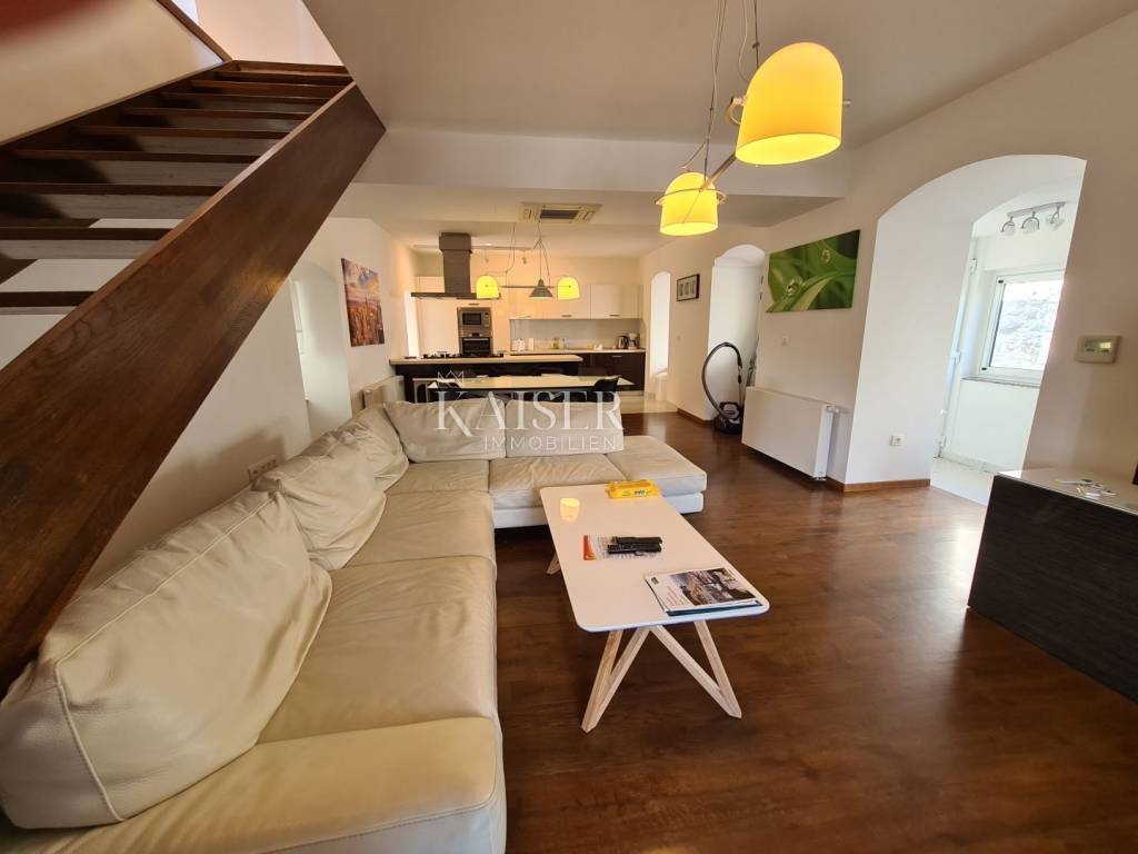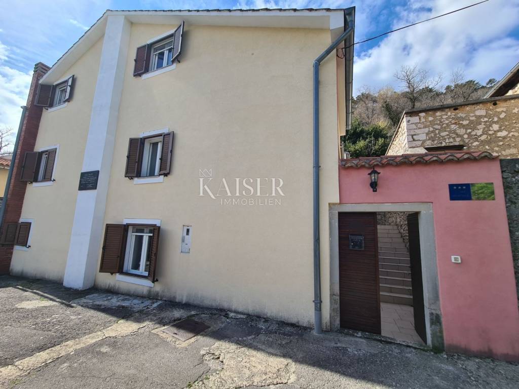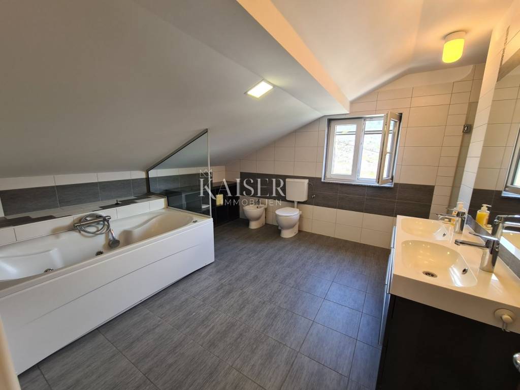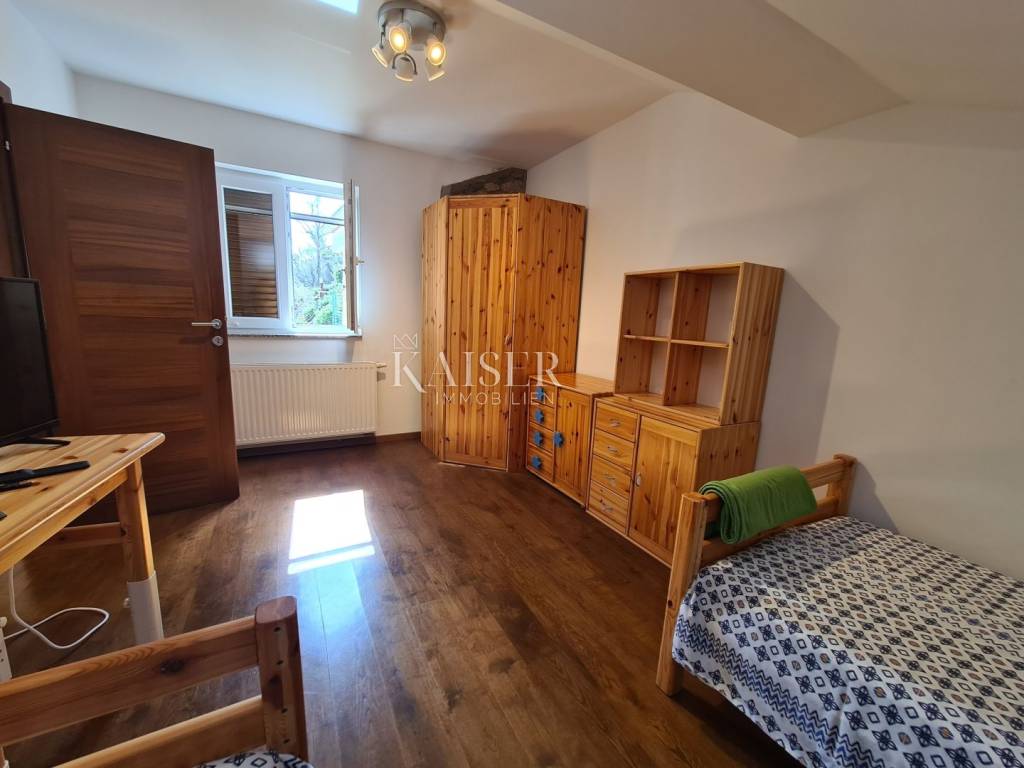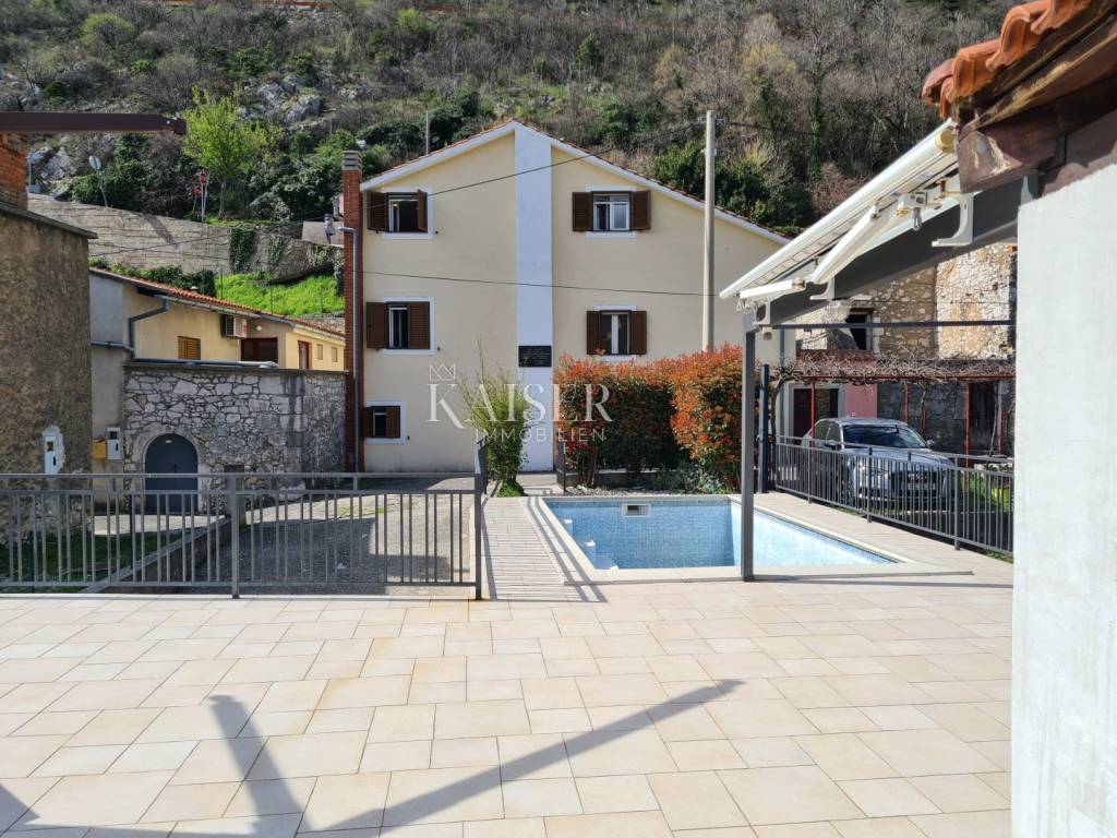 Kaiser immobilien mediates the sale of this beautiful house located in the fairytale landscape of Bribir, only 2 km from the sea. First of all, this property has a historical value, given that it was built in 1893, and as such was completely adapted and renovated in 2005. New ceiling constructions, stairs, slanted roofing panels were made, all made of reinforced concrete. The walls were newly plastered on the outside and inside, and a new facade was constructed, as well as thermal and hydro insulation of the terrace. All installations (electrical, plumbing and sewage) were completely changed. On the ground floor there is a separate apartment of 80m2 with two bedrooms, a living room, a kitchen, a bathroom, a storage room and a machine room. On the first floor, there is a beautiful two-story apartment of 120m2 with three bedrooms, a large living room that includes a living room and kitchen, and access to the balcony. There is also a bathroom, a toilet and a storage room. The house has a central heating system, using pellets or a heat pump, and all rooms are air-conditioned. There is a spacious terrace on the landscaped garden, which includes a swimming pool, sun deck and garden fireplace. The terrace offers a beautiful view of the surrounding hills and the sea. Below the terrace in the continuation of the field is an additional 150m2 of green space ideal for relaxing and enjoying the greenery. The property also has a spacious garage of 70m2, as well as an outdoor parking lot with 4 parking spaces. This property is an ideal choice for those who want to relax in a peaceful and idyllic environment, but also as an investment, since the house is in a tourist rental.