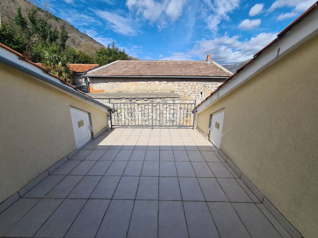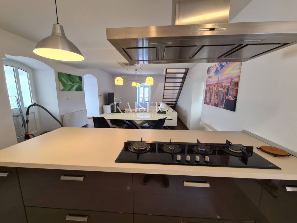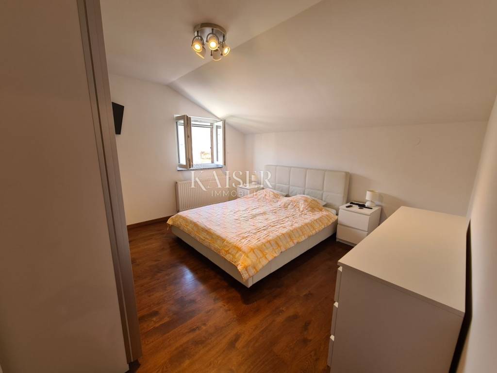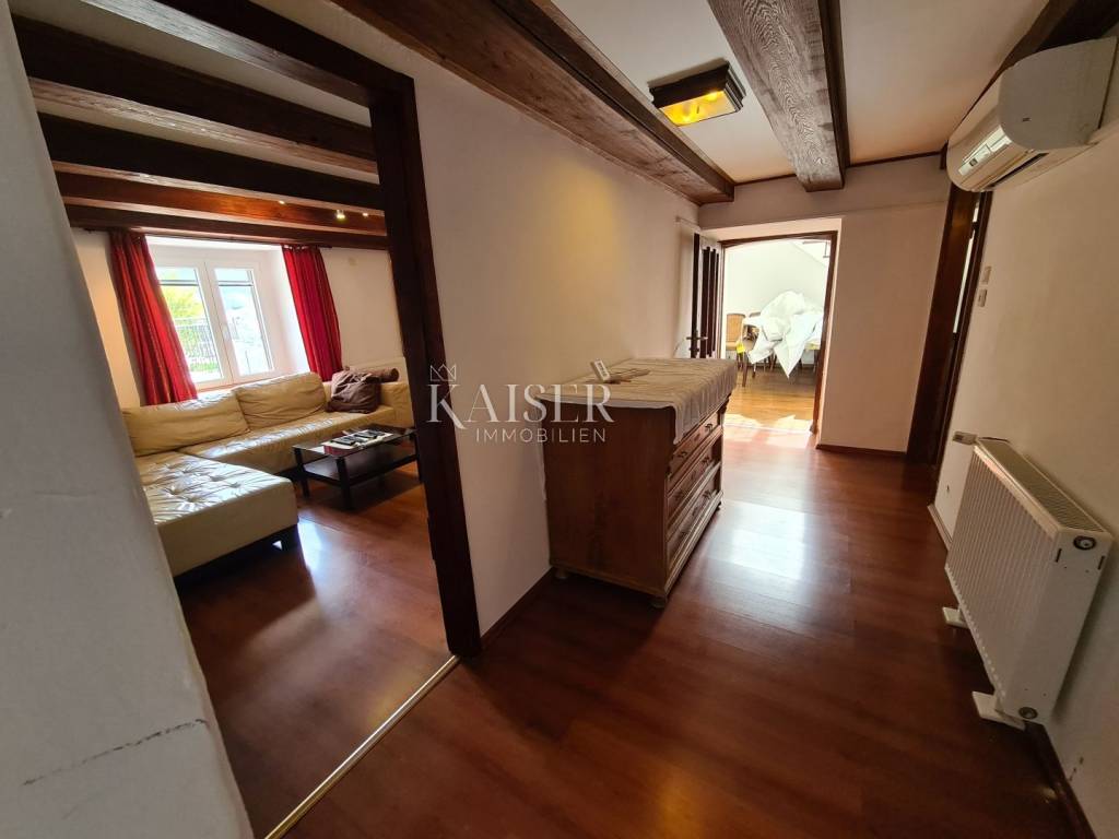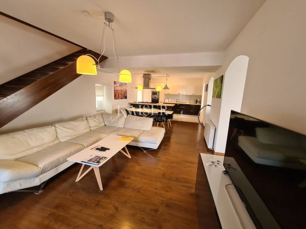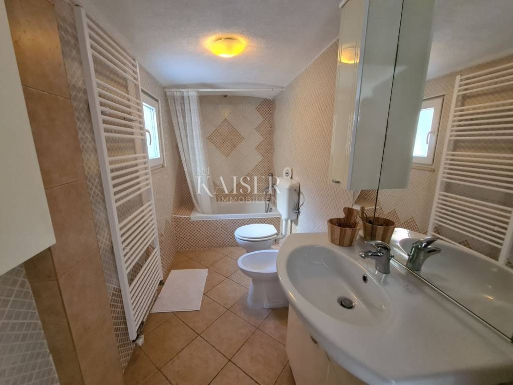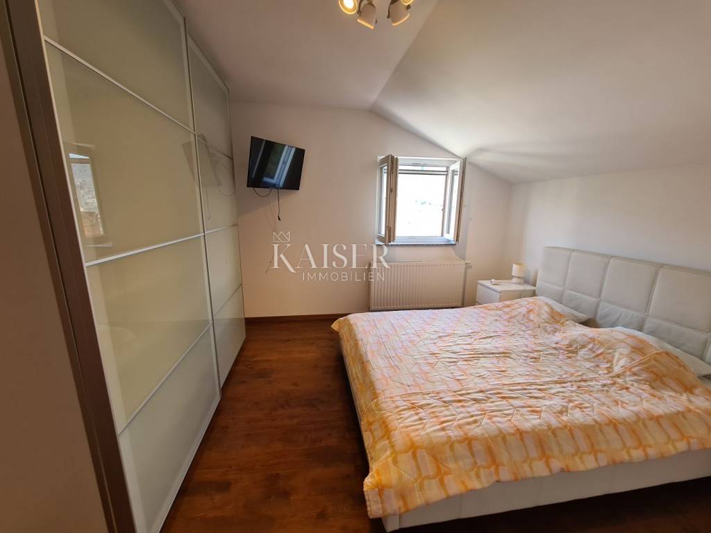 Kaiser immobilien mediates the sale of this beautiful house located in the fairytale landscape of Bribir, only 2 km from the sea. First of all, this property has a historical value, given that it was built in 1893, and as such was completely adapted and renovated in 2005. New ceiling constructions, stairs, slanted roofing panels were made, all made of reinforced concrete. The walls were newly plastered on the outside and inside, and a new facade was constructed, as well as thermal and hydro insulation of the terrace. All installations (electrical, plumbing and sewage) were completely changed. On the ground floor there is a separate apartment of 80m2 with two bedrooms, a living room, a kitchen, a bathroom, a storage room and a machine room. On the first floor, there is a beautiful two-story apartment of 120m2 with three bedrooms, a large living room that includes a living room and kitchen, and access to the balcony. There is also a bathroom, a toilet and a storage room. The house has a central heating system, using pellets or a heat pump, and all rooms are air-conditioned. There is a spacious terrace on the landscaped garden, which includes a swimming pool, sun deck and garden fireplace. The terrace offers a beautiful view of the surrounding hills and the sea. Below the terrace in the continuation of the field is an additional 150m2 of green space ideal for relaxing and enjoying the greenery. The property also has a spacious garage of 70m2, as well as an outdoor parking lot with 4 parking spaces. This property is an ideal choice for those who want to relax in a peaceful and idyllic environment, but also as an investment, since the house is in a tourist rental.