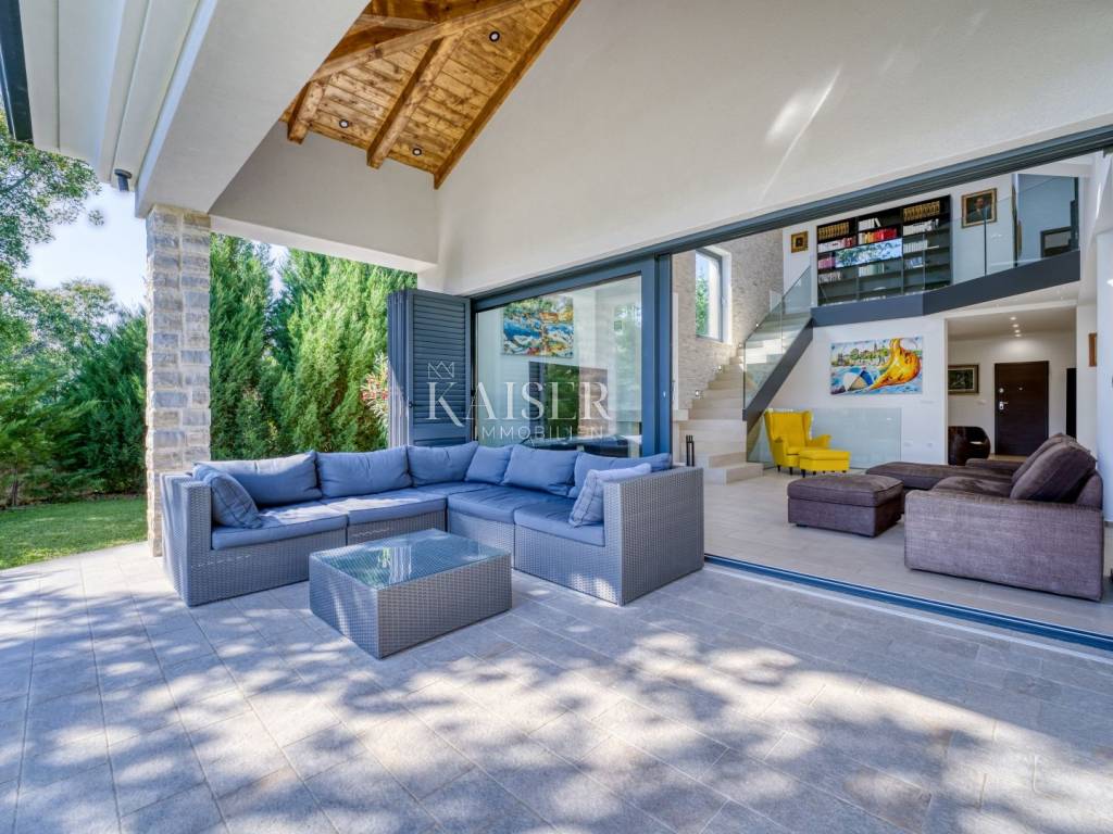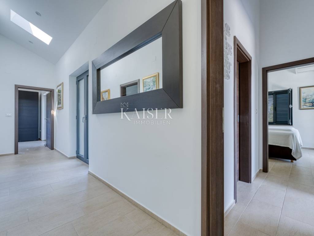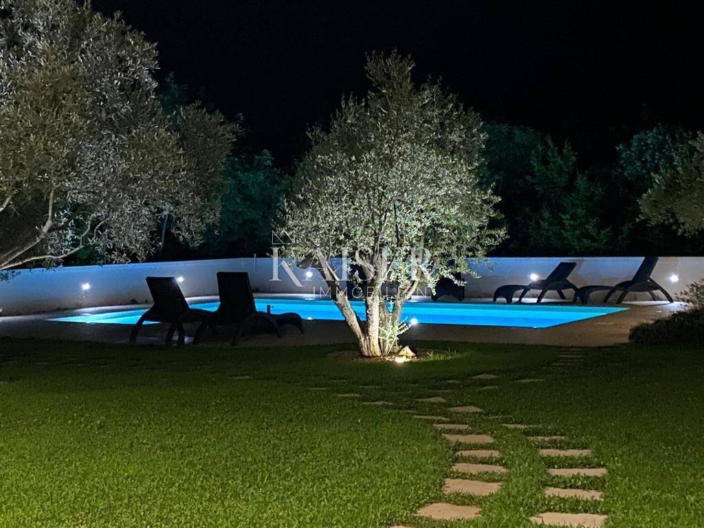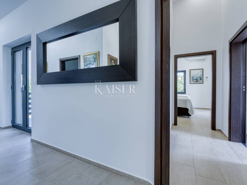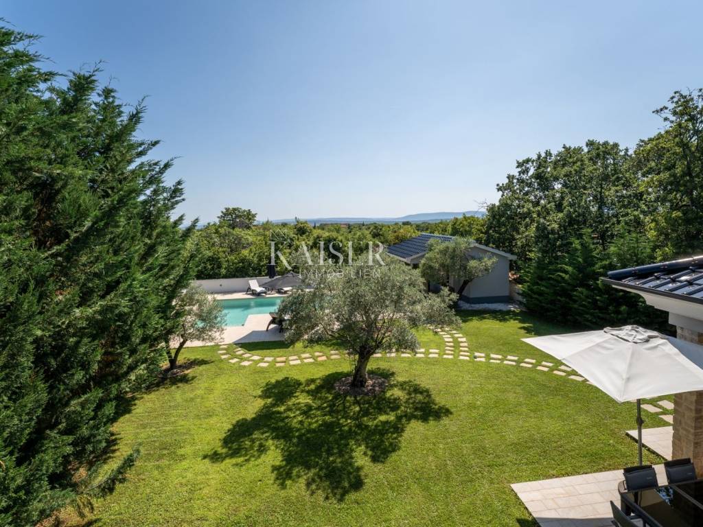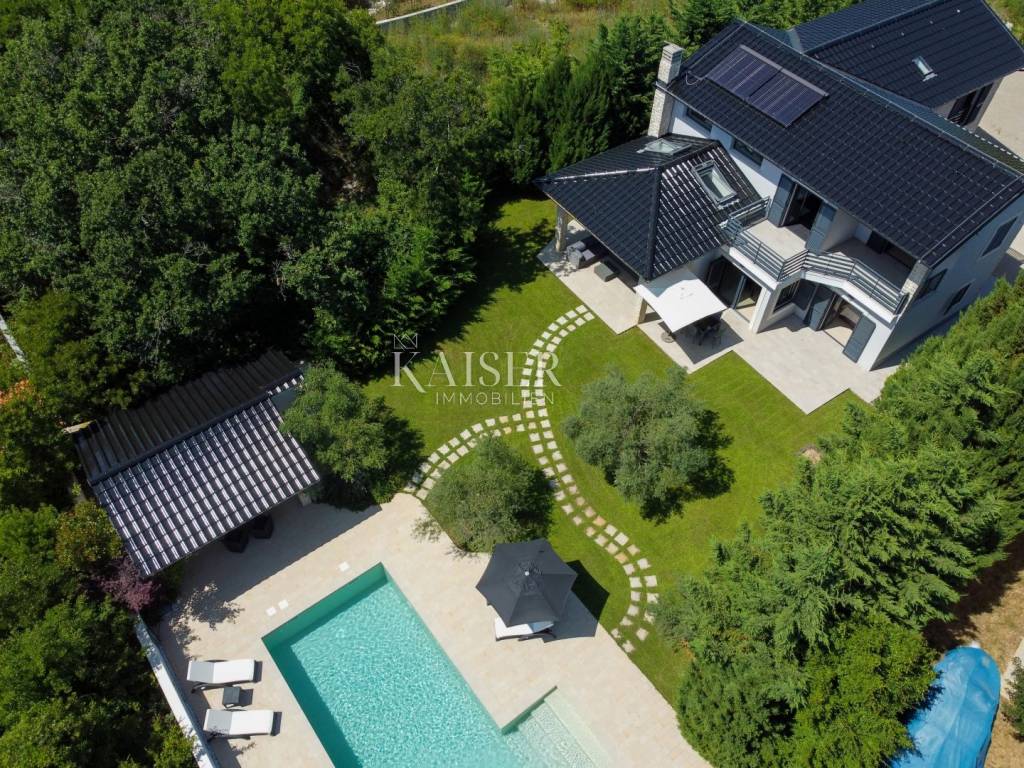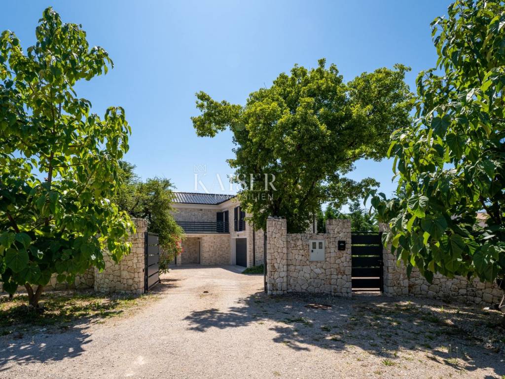 ONLY IN OUR OFFER! If you are looking for a peace that cannot be described in words, the chirping of birds in the morning, orange-colored summer evenings, the song of crickets and the intoxicating smell of greenery in the heart of a Mediterranean island, this property is the perfect choice for you. Kaiser immobilien exclusively mediates the sale of this extremely luxurious property located in the magical interior of the island of Krk in Kras, the highest settlement on the island. It is impossible to describe this villa in words, it is best to experience it up close. At first glance, the villa gives the impression of a safe, peaceful and modern family home that uses the best of modern technologies as well as traditional construction methods, which all together results in a perfect combination of harmonious design, low energy consumption and luxurious details. At the very approach to the building, in the shade of already formed trees, there is a spacious parking space. The fence that opens remotely hides a spacious fenced yard in the front part of the garden, where there is a Mediterranean garden, a row of trees and a wonderful stone well in operation. The villa is located on a fenced plot of 1,000m2 and consists of three floors, ground floor, first floor and basement, with a total living area of 290m2. It is located in a harmonious and peaceful environment, and at the same time close to all important facilities. Behind the massive entrance door we enter the entrance hall on the ground floor, which consists of an "open space" style living room that includes a living room, a kitchen and a dining room. The living room is decorated with a high ceiling that contributes to airiness and extremely good lighting with natural light, and a beautiful Palazzetti fireplace that contributes to the atmosphere and, if necessary, warms in the winter months. From the living room, through a massive aluminum glass wall, there is access to a spacious covered terrace with a view of the harmoniously arranged garden. On the ground floor there is also a guest bedroom with its own bathroom, storage room and toilet. There is also one of the special features of this property, which is a spacious 30m2 garage with a Hörmann garage door, connected to the entrance hall on the ground floor to enter the house directly from the vehicle. There are three bedrooms with their own bathrooms on the first floor, which can be reached by a staircase from the ground floor. The master bedroom and bathroom have access to the terrace with a wonderful view of the sea and the forested areas of the central part of the island. This room also has a spacious walk-in closet. The remaining two bedrooms have a common exit to the terrace and French balconies. The villa also has a basement where there is a social room with a partially glass ceiling, as well as a laundry room and a machine room. In the construction and furnishing, top quality materials were used, such as Porotherm block 35 cm in combination with 18 cm wall insulation and 24 cm roof insulation, Viesmann gas central floor heating system with wi-fi control, solar panels and fireplace connected to the central heating system, aluminum joinery and shutters, Velux windows and blinds with automatic closing in case of rain and solar power, solid stone window frames, Villeroy&Boch bathrooms. All rooms are air-conditioned. The security system consists of 6 cameras, video surveillance and an alarm connected directly to the security service provider. The Internet connection takes place via an optical cable. On the spacious and impeccably landscaped garden there is a grassy area that leads to a heated swimming pool measuring 9.5x5m covered with premium ceramics. There is also a sunbathing area, a shower, and an above-ground engine room with a robotic pool cleaner. The horticulture is carefully selected and carefully maintained, we highlight the immaculate lawn on which there are four hundred-year-old olive trees, which offer the owners the opportunity to make their own extra virgin olive oil with the amount of their fruit year after year. Another special feature of this property that makes it desirable is certainly the drinking water tank, with a capacity of 150m3, which, in combination with the copper roof gutters, provides an additional source of year-round supply of drinking water for all household members and guests. The tank for drinking water in combination with the technology and materials used in construction contribute to extremely low overheads and maintenance costs. The property is sold equipped and furnished. The commission of the agency for the buyer is 3% + VAT and is paid in case of real estate purchase, when the first legal deed is concluded. Shop: 100m Restaurants: 2000m Beach: 4000m Children's playground: 100m Airport: 15km Kars is located in the interior of the island, almost at its geographical center, at the crossroads of the roads leading from Dobrinje to Krk or Malinska. Kars is the highest settlement on the island of Krk, located 266 meters above sea level. In the immediate vicinity is the highest peak of this part of the island, Sv. Juraj, 311 m. It was first mentioned in 1230 in an old Glagolitic document. Toponomist and novelist Petar Skok derives the name Kras from the pre-Latin, possibly Illyrian word "carsus", from which the Croatian word kras, krs, developed.