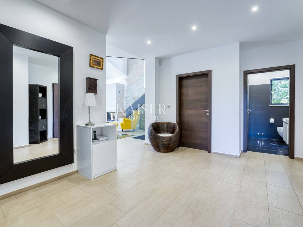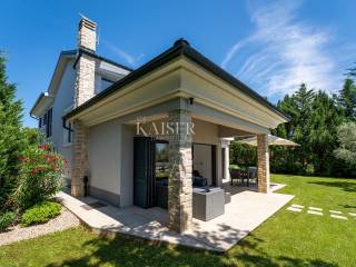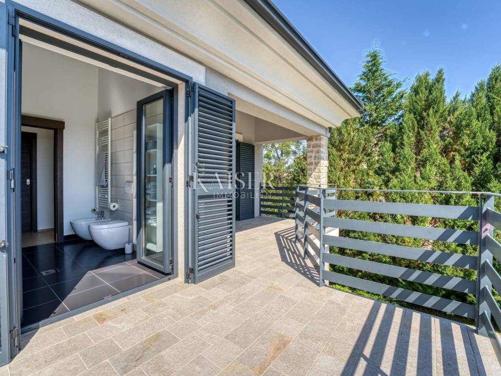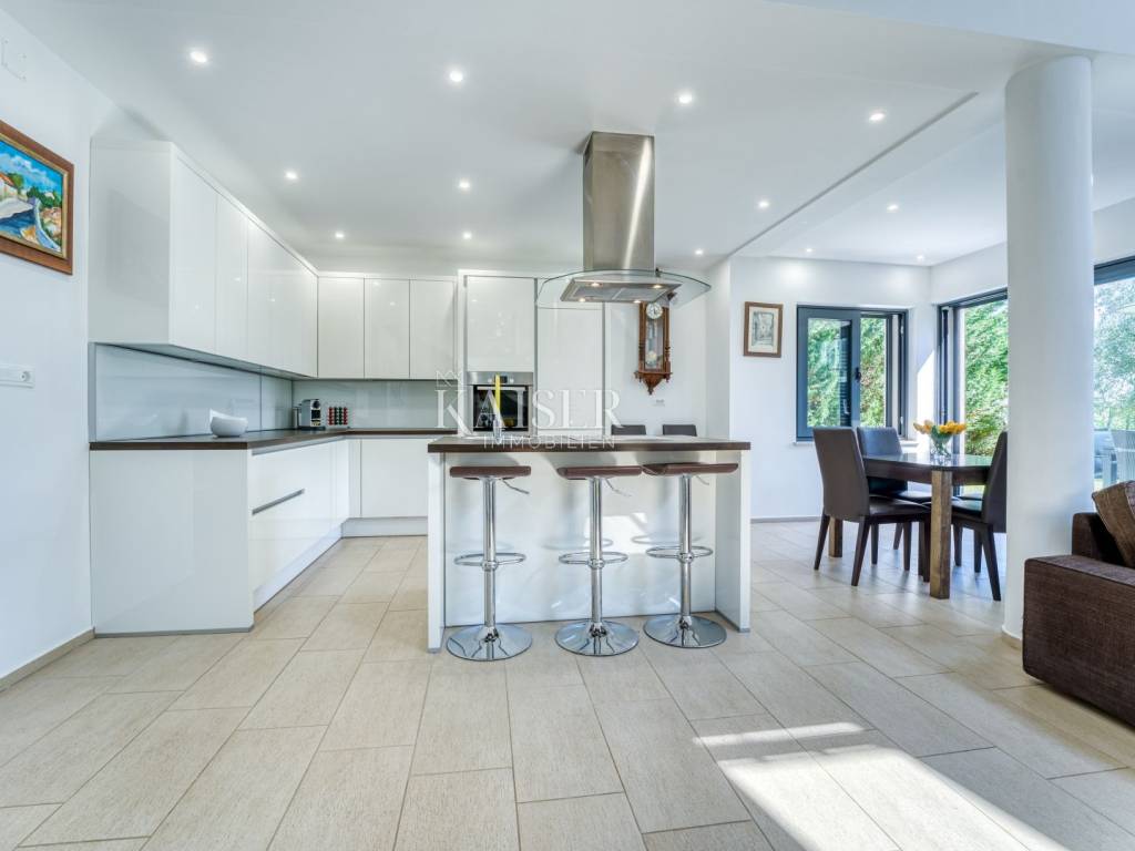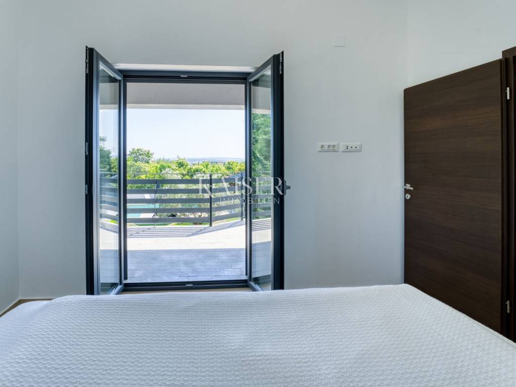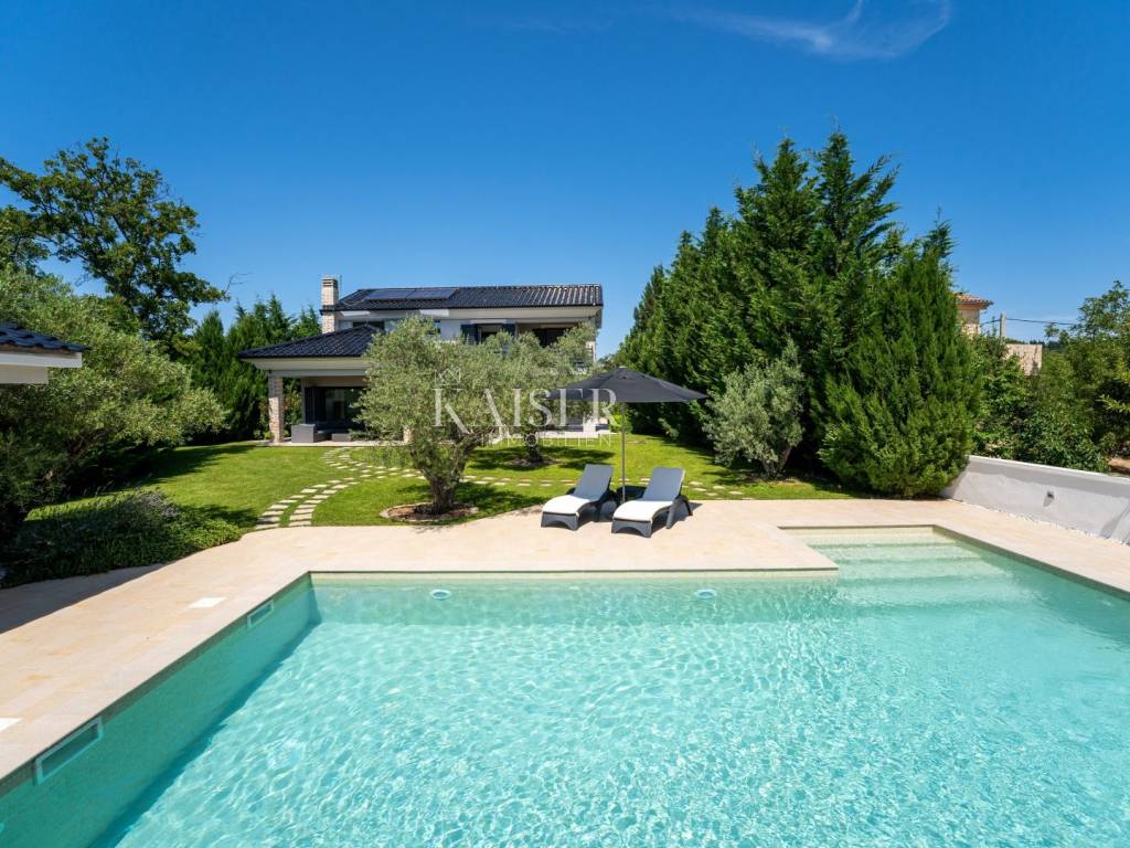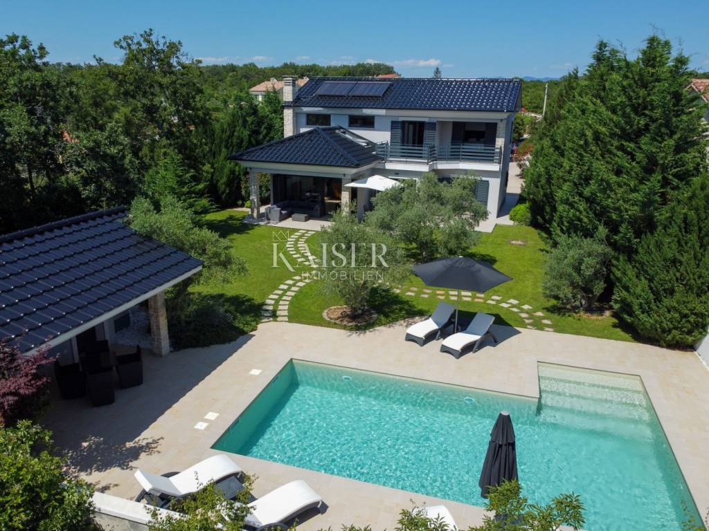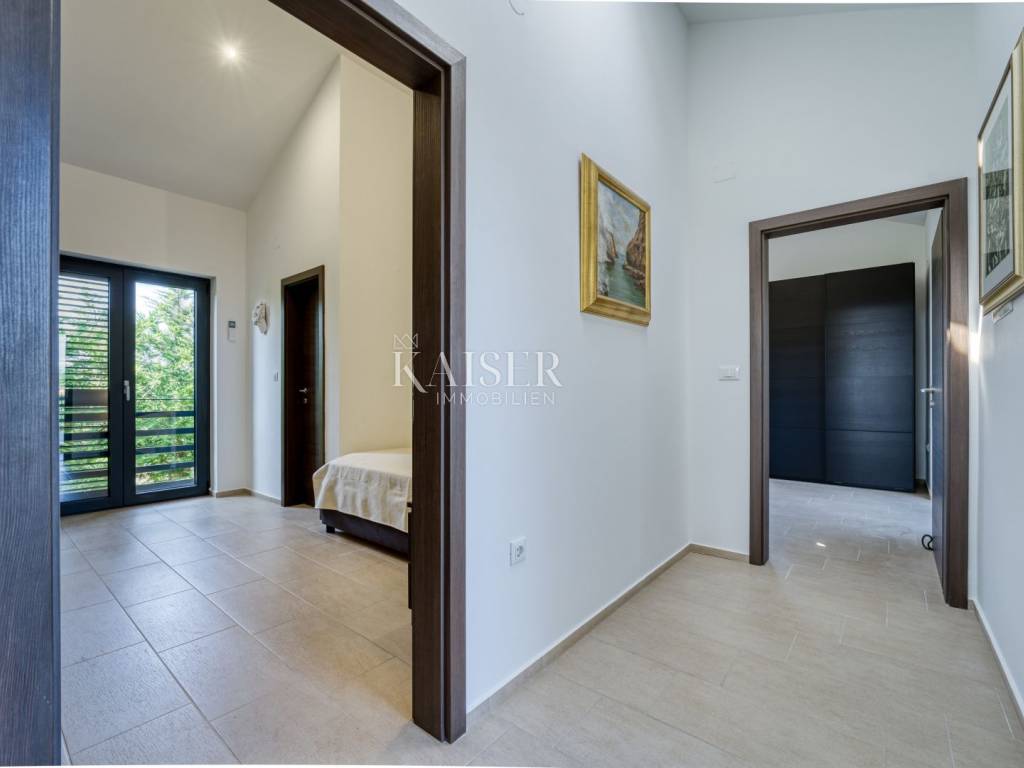 ONLY IN OUR OFFER! If you are looking for a peace that cannot be described in words, the chirping of birds in the morning, orange-colored summer evenings, the song of crickets and the intoxicating smell of greenery in the heart of a Mediterranean island, this property is the perfect choice for you. Kaiser immobilien exclusively mediates the sale of this extremely luxurious property located in the magical interior of the island of Krk in Kras, the highest settlement on the island. It is impossible to describe this villa in words, it is best to experience it up close. At first glance, the villa gives the impression of a safe, peaceful and modern family home that uses the best of modern technologies as well as traditional construction methods, which all together results in a perfect combination of harmonious design, low energy consumption and luxurious details. At the very approach to the building, in the shade of already formed trees, there is a spacious parking space. The fence that opens remotely hides a spacious fenced yard in the front part of the garden, where there is a Mediterranean garden, a row of trees and a wonderful stone well in operation. The villa is located on a fenced plot of 1,000m2 and consists of three floors, ground floor, first floor and basement, with a total living area of 290m2. It is located in a harmonious and peaceful environment, and at the same time close to all important facilities. Behind the massive entrance door we enter the entrance hall on the ground floor, which consists of an "open space" style living room that includes a living room, a kitchen and a dining room. The living room is decorated with a high ceiling that contributes to airiness and extremely good lighting with natural light, and a beautiful Palazzetti fireplace that contributes to the atmosphere and, if necessary, warms in the winter months. From the living room, through a massive aluminum glass wall, there is access to a spacious covered terrace with a view of the harmoniously arranged garden. On the ground floor there is also a guest bedroom with its own bathroom, storage room and toilet. There is also one of the special features of this property, which is a spacious 30m2 garage with a Hörmann garage door, connected to the entrance hall on the ground floor to enter the house directly from the vehicle. There are three bedrooms with their own bathrooms on the first floor, which can be reached by a staircase from the ground floor. The master bedroom and bathroom have access to the terrace with a wonderful view of the sea and the forested areas of the central part of the island. This room also has a spacious walk-in closet. The remaining two bedrooms have a common exit to the terrace and French balconies. The villa also has a basement where there is a social room with a partially glass ceiling, as well as a laundry room and a machine room. In the construction and furnishing, top quality materials were used, such as Porotherm block 35 cm in combination with 18 cm wall insulation and 24 cm roof insulation, Viesmann gas central floor heating system with wi-fi control, solar panels and fireplace connected to the central heating system, aluminum joinery and shutters, Velux windows and blinds with automatic closing in case of rain and solar power, solid stone window frames, Villeroy&Boch bathrooms. All rooms are air-conditioned. The security system consists of 6 cameras, video surveillance and an alarm connected directly to the security service provider. The Internet connection takes place via an optical cable. On the spacious and impeccably landscaped garden there is a grassy area that leads to a heated swimming pool measuring 9.5x5m covered with premium ceramics. There is also a sunbathing area, a shower, and an above-ground engine room with a robotic pool cleaner. The horticulture is carefully selected and carefully maintained, we highlight the immaculate lawn on which there are four hundred-year-old olive trees, which offer the owners the opportunity to make their own extra virgin olive oil with the amount of their fruit year after year. Another special feature of this property that makes it desirable is certainly the drinking water tank, with a capacity of 150m3, which, in combination with the copper roof gutters, provides an additional source of year-round supply of drinking water for all household members and guests. The tank for drinking water in combination with the technology and materials used in construction contribute to extremely low overheads and maintenance costs. The property is sold equipped and furnished. The commission of the agency for the buyer is 3% + VAT and is paid in case of real estate purchase, when the first legal deed is concluded. Shop: 100m Restaurants: 2000m Beach: 4000m Children's playground: 100m Airport: 15km Kars is located in the interior of the island, almost at its geographical center, at the crossroads of the roads leading from Dobrinje to Krk or Malinska. Kars is the highest settlement on the island of Krk, located 266 meters above sea level. In the immediate vicinity is the highest peak of this part of the island, Sv. Juraj, 311 m. It was first mentioned in 1230 in an old Glagolitic document. Toponomist and novelist Petar Skok derives the name Kras from the pre-Latin, possibly Illyrian word "carsus", from which the Croatian word kras, krs, developed.