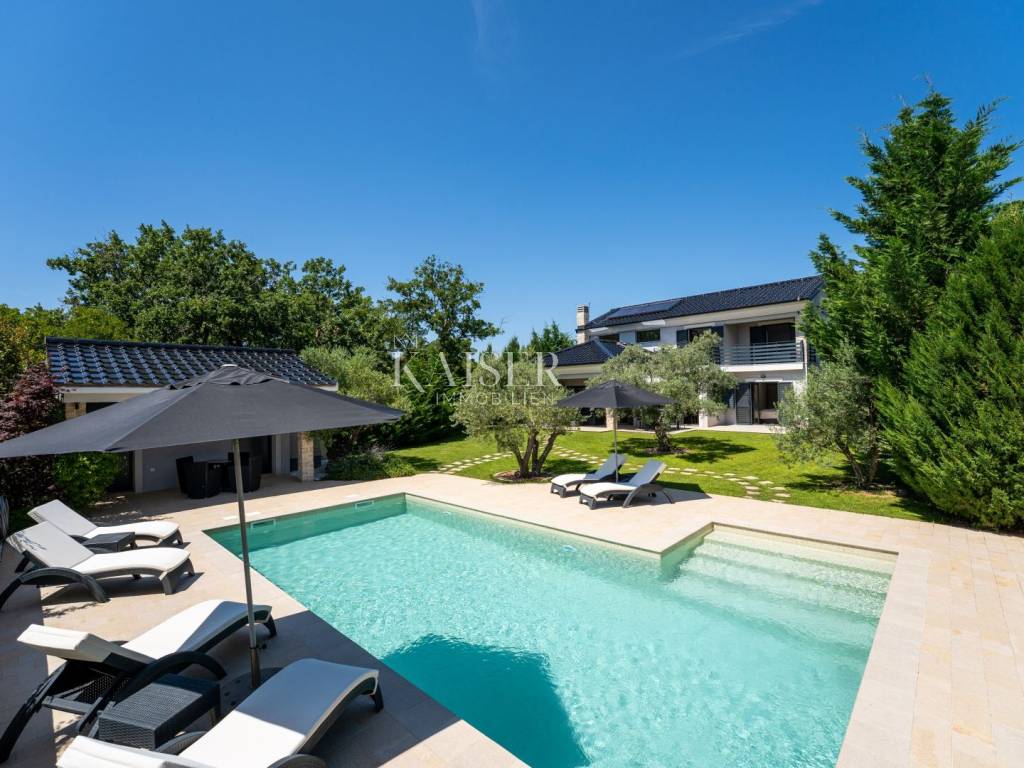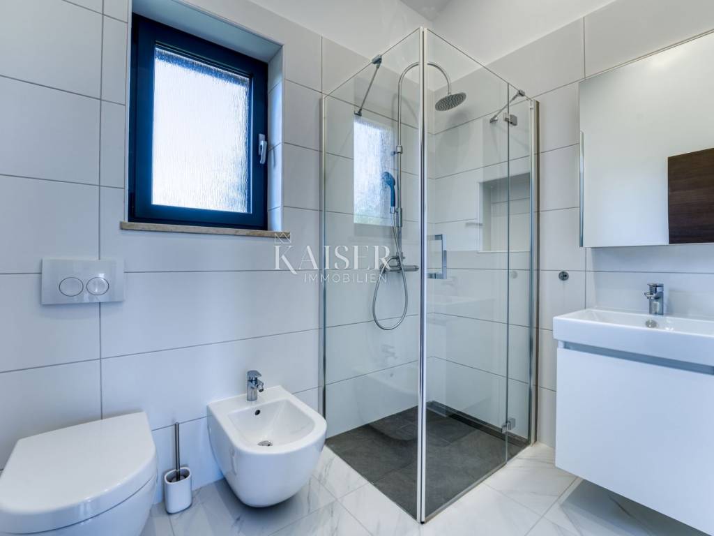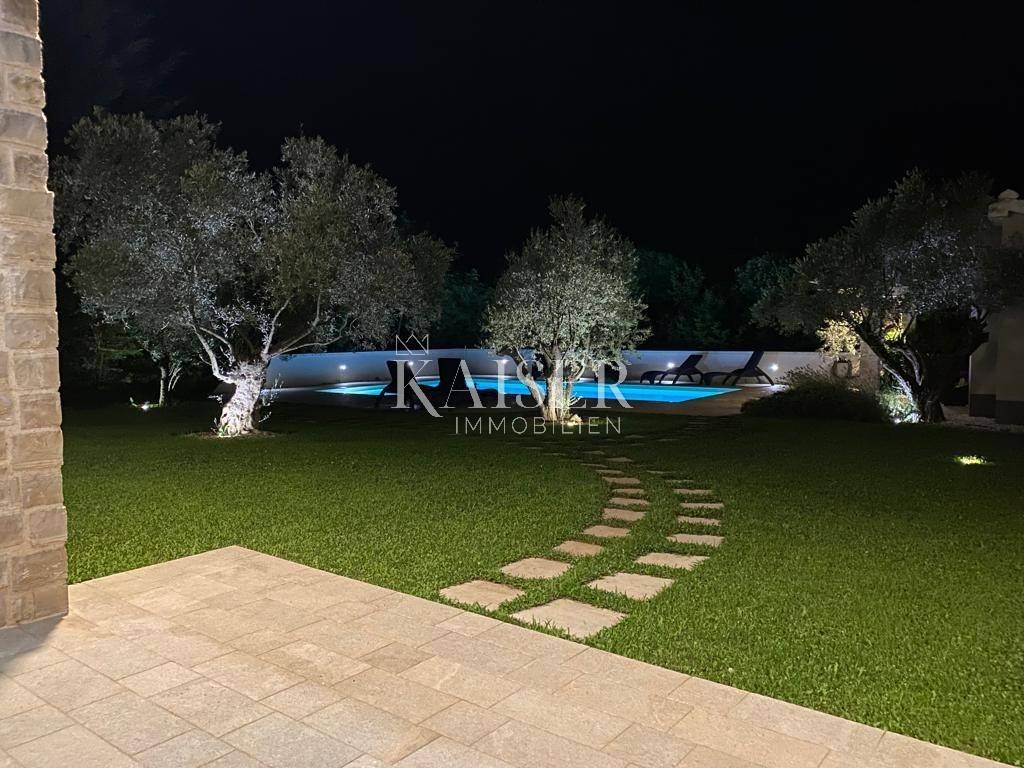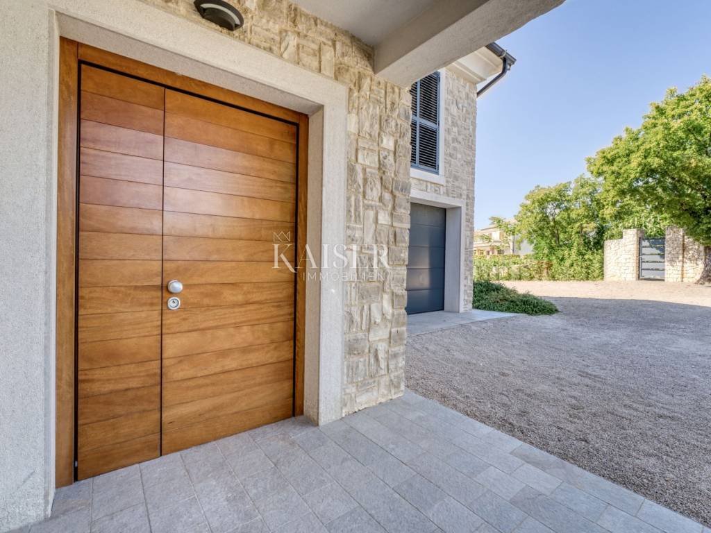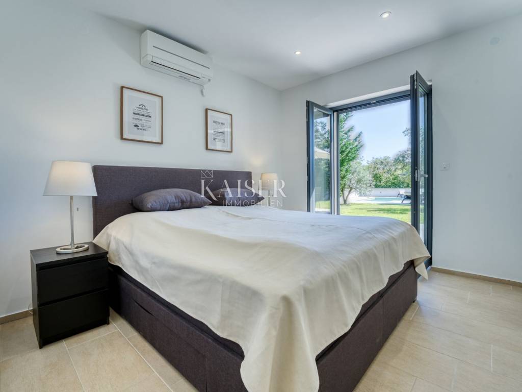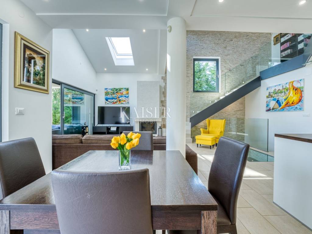 ONLY IN OUR OFFER! If you are looking for a peace that cannot be described in words, the chirping of birds in the morning, orange-colored summer evenings, the song of crickets and the intoxicating smell of greenery in the heart of a Mediterranean island, this property is the perfect choice for you. Kaiser immobilien exclusively mediates the sale of this extremely luxurious property located in the magical interior of the island of Krk in Kras, the highest settlement on the island. It is impossible to describe this villa in words, it is best to experience it up close. At first glance, the villa gives the impression of a safe, peaceful and modern family home that uses the best of modern technologies as well as traditional construction methods, which all together results in a perfect combination of harmonious design, low energy consumption and luxurious details. At the very approach to the building, in the shade of already formed trees, there is a spacious parking space. The fence that opens remotely hides a spacious fenced yard in the front part of the garden, where there is a Mediterranean garden, a row of trees and a wonderful stone well in operation. The villa is located on a fenced plot of 1,000m2 and consists of three floors, ground floor, first floor and basement, with a total living area of 290m2. It is located in a harmonious and peaceful environment, and at the same time close to all important facilities. Behind the massive entrance door we enter the entrance hall on the ground floor, which consists of an "open space" style living room that includes a living room, a kitchen and a dining room. The living room is decorated with a high ceiling that contributes to airiness and extremely good lighting with natural light, and a beautiful Palazzetti fireplace that contributes to the atmosphere and, if necessary, warms in the winter months. From the living room, through a massive aluminum glass wall, there is access to a spacious covered terrace with a view of the harmoniously arranged garden. On the ground floor there is also a guest bedroom with its own bathroom, storage room and toilet. There is also one of the special features of this property, which is a spacious 30m2 garage with a Hörmann garage door, connected to the entrance hall on the ground floor to enter the house directly from the vehicle. There are three bedrooms with their own bathrooms on the first floor, which can be reached by a staircase from the ground floor. The master bedroom and bathroom have access to the terrace with a wonderful view of the sea and the forested areas of the central part of the island. This room also has a spacious walk-in closet. The remaining two bedrooms have a common exit to the terrace and French balconies. The villa also has a basement where there is a social room with a partially glass ceiling, as well as a laundry room and a machine room. In the construction and furnishing, top quality materials were used, such as Porotherm block 35 cm in combination with 18 cm wall insulation and 24 cm roof insulation, Viesmann gas central floor heating system with wi-fi control, solar panels and fireplace connected to the central heating system, aluminum joinery and shutters, Velux windows and blinds with automatic closing in case of rain and solar power, solid stone window frames, Villeroy&Boch bathrooms. All rooms are air-conditioned. The security system consists of 6 cameras, video surveillance and an alarm connected directly to the security service provider. The Internet connection takes place via an optical cable. On the spacious and impeccably landscaped garden there is a grassy area that leads to a heated swimming pool measuring 9.5x5m covered with premium ceramics. There is also a sunbathing area, a shower, and an above-ground engine room with a robotic pool cleaner. The horticulture is carefully selected and carefully maintained, we highlight the immaculate lawn on which there are four hundred-year-old olive trees, which offer the owners the opportunity to make their own extra virgin olive oil with the amount of their fruit year after year. Another special feature of this property that makes it desirable is certainly the drinking water tank, with a capacity of 150m3, which, in combination with the copper roof gutters, provides an additional source of year-round supply of drinking water for all household members and guests. The tank for drinking water in combination with the technology and materials used in construction contribute to extremely low overheads and maintenance costs. The property is sold equipped and furnished. The commission of the agency for the buyer is 3% + VAT and is paid in case of real estate purchase, when the first legal deed is concluded. Shop: 100m Restaurants: 2000m Beach: 4000m Children's playground: 100m Airport: 15km Kars is located in the interior of the island, almost at its geographical center, at the crossroads of the roads leading from Dobrinje to Krk or Malinska. Kars is the highest settlement on the island of Krk, located 266 meters above sea level. In the immediate vicinity is the highest peak of this part of the island, Sv. Juraj, 311 m. It was first mentioned in 1230 in an old Glagolitic document. Toponomist and novelist Petar Skok derives the name Kras from the pre-Latin, possibly Illyrian word "carsus", from which the Croatian word kras, krs, developed.