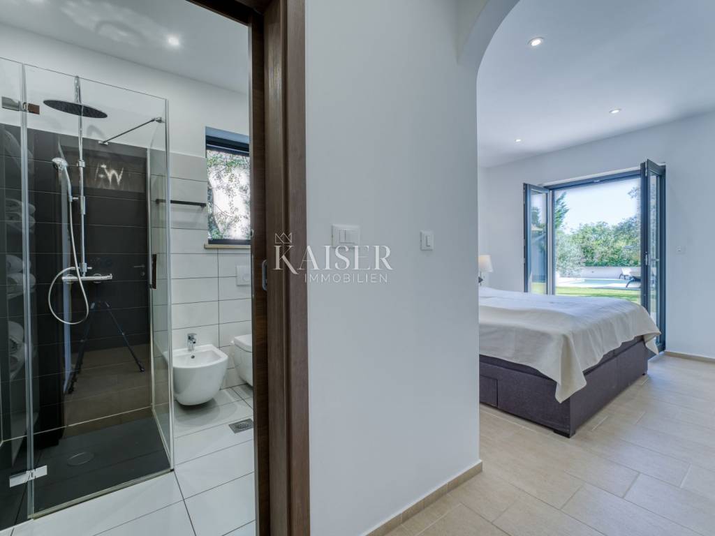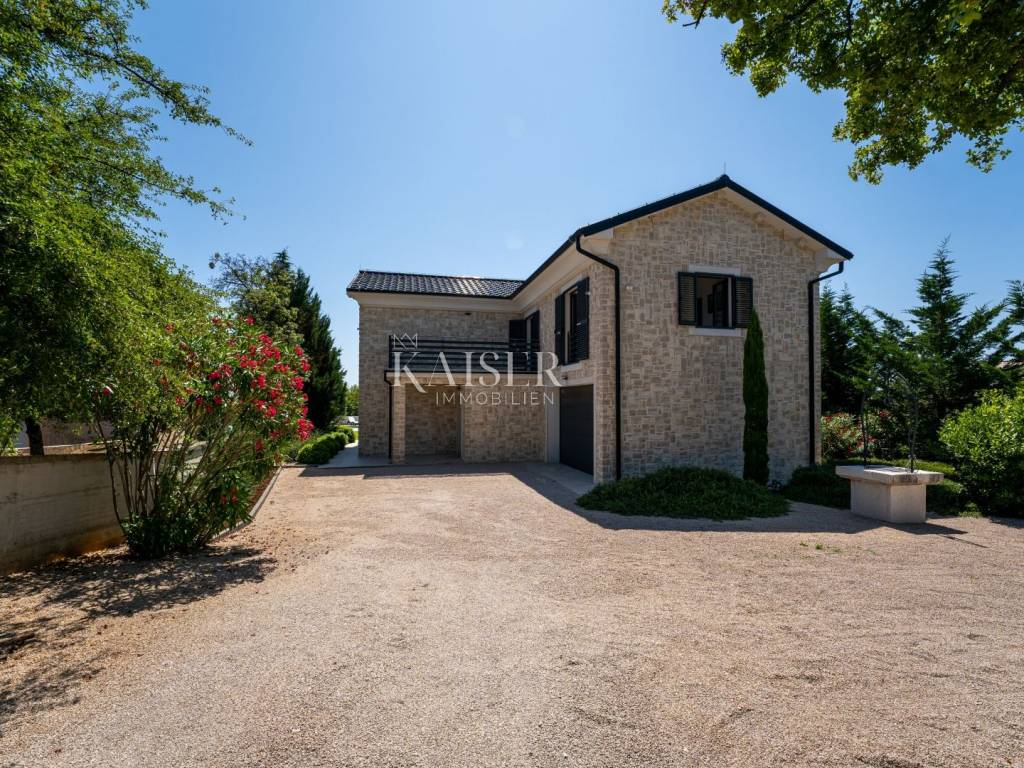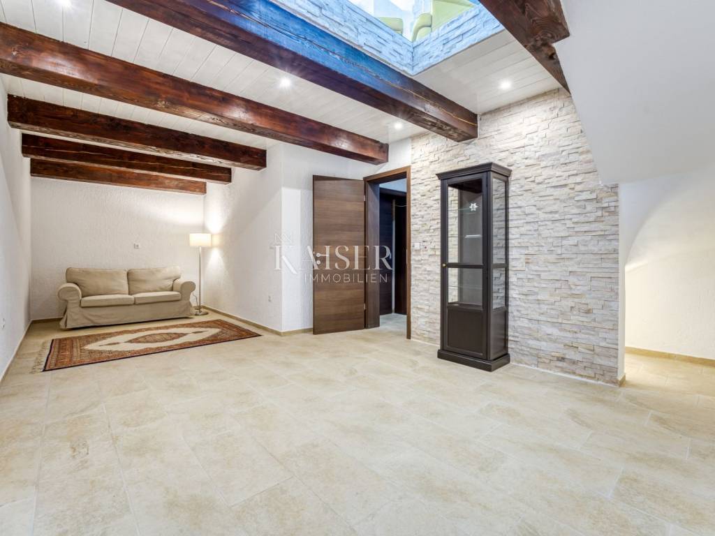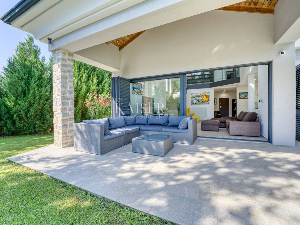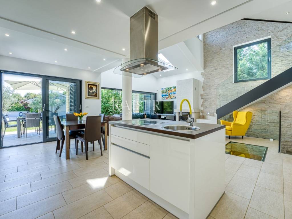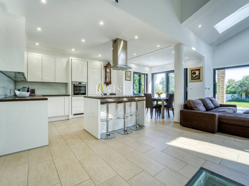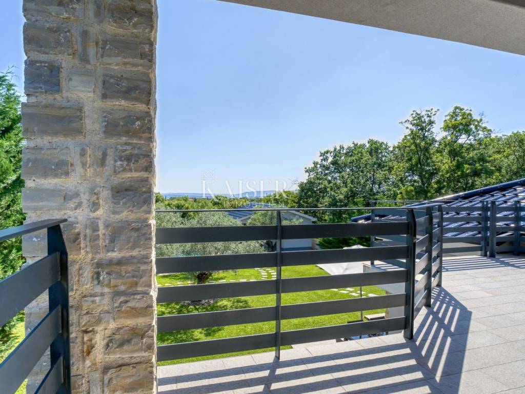 ONLY IN OUR OFFER! If you are looking for a peace that cannot be described in words, the chirping of birds in the morning, orange-colored summer evenings, the song of crickets and the intoxicating smell of greenery in the heart of a Mediterranean island, this property is the perfect choice for you. Kaiser immobilien exclusively mediates the sale of this extremely luxurious property located in the magical interior of the island of Krk in Kras, the highest settlement on the island. It is impossible to describe this villa in words, it is best to experience it up close. At first glance, the villa gives the impression of a safe, peaceful and modern family home that uses the best of modern technologies as well as traditional construction methods, which all together results in a perfect combination of harmonious design, low energy consumption and luxurious details. At the very approach to the building, in the shade of already formed trees, there is a spacious parking space. The fence that opens remotely hides a spacious fenced yard in the front part of the garden, where there is a Mediterranean garden, a row of trees and a wonderful stone well in operation. The villa is located on a fenced plot of 1,000m2 and consists of three floors, ground floor, first floor and basement, with a total living area of 290m2. It is located in a harmonious and peaceful environment, and at the same time close to all important facilities. Behind the massive entrance door we enter the entrance hall on the ground floor, which consists of an "open space" style living room that includes a living room, a kitchen and a dining room. The living room is decorated with a high ceiling that contributes to airiness and extremely good lighting with natural light, and a beautiful Palazzetti fireplace that contributes to the atmosphere and, if necessary, warms in the winter months. From the living room, through a massive aluminum glass wall, there is access to a spacious covered terrace with a view of the harmoniously arranged garden. On the ground floor there is also a guest bedroom with its own bathroom, storage room and toilet. There is also one of the special features of this property, which is a spacious 30m2 garage with a Hörmann garage door, connected to the entrance hall on the ground floor to enter the house directly from the vehicle. There are three bedrooms with their own bathrooms on the first floor, which can be reached by a staircase from the ground floor. The master bedroom and bathroom have access to the terrace with a wonderful view of the sea and the forested areas of the central part of the island. This room also has a spacious walk-in closet. The remaining two bedrooms have a common exit to the terrace and French balconies. The villa also has a basement where there is a social room with a partially glass ceiling, as well as a laundry room and a machine room. In the construction and furnishing, top quality materials were used, such as Porotherm block 35 cm in combination with 18 cm wall insulation and 24 cm roof insulation, Viesmann gas central floor heating system with wi-fi control, solar panels and fireplace connected to the central heating system, aluminum joinery and shutters, Velux windows and blinds with automatic closing in case of rain and solar power, solid stone window frames, Villeroy&Boch bathrooms. All rooms are air-conditioned. The security system consists of 6 cameras, video surveillance and an alarm connected directly to the security service provider. The Internet connection takes place via an optical cable. On the spacious and impeccably landscaped garden there is a grassy area that leads to a heated swimming pool measuring 9.5x5m covered with premium ceramics. There is also a sunbathing area, a shower, and an above-ground engine room with a robotic pool cleaner. The horticulture is carefully selected and carefully maintained, we highlight the immaculate lawn on which there are four hundred-year-old olive trees, which offer the owners the opportunity to make their own extra virgin olive oil with the amount of their fruit year after year. Another special feature of this property that makes it desirable is certainly the drinking water tank, with a capacity of 150m3, which, in combination with the copper roof gutters, provides an additional source of year-round supply of drinking water for all household members and guests. The tank for drinking water in combination with the technology and materials used in construction contribute to extremely low overheads and maintenance costs. The property is sold equipped and furnished. The commission of the agency for the buyer is 3% + VAT and is paid in case of real estate purchase, when the first legal deed is concluded. Shop: 100m Restaurants: 2000m Beach: 4000m Children's playground: 100m Airport: 15km Kars is located in the interior of the island, almost at its geographical center, at the crossroads of the roads leading from Dobrinje to Krk or Malinska. Kars is the highest settlement on the island of Krk, located 266 meters above sea level. In the immediate vicinity is the highest peak of this part of the island, Sv. Juraj, 311 m. It was first mentioned in 1230 in an old Glagolitic document. Toponomist and novelist Petar Skok derives the name Kras from the pre-Latin, possibly Illyrian word "carsus", from which the Croatian word kras, krs, developed.