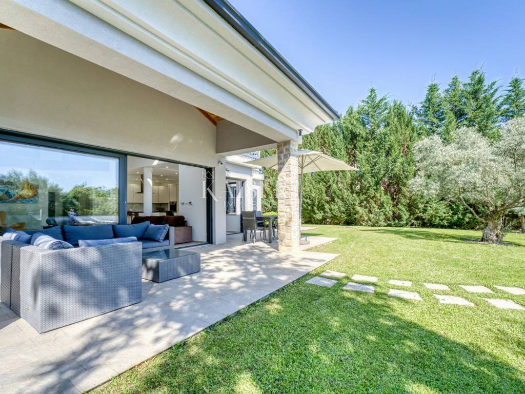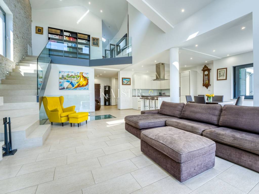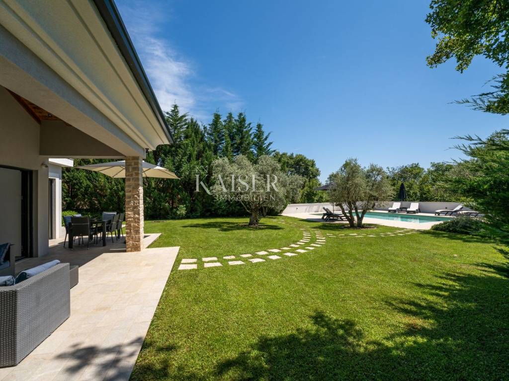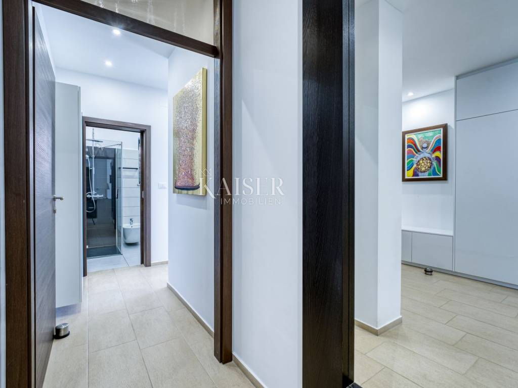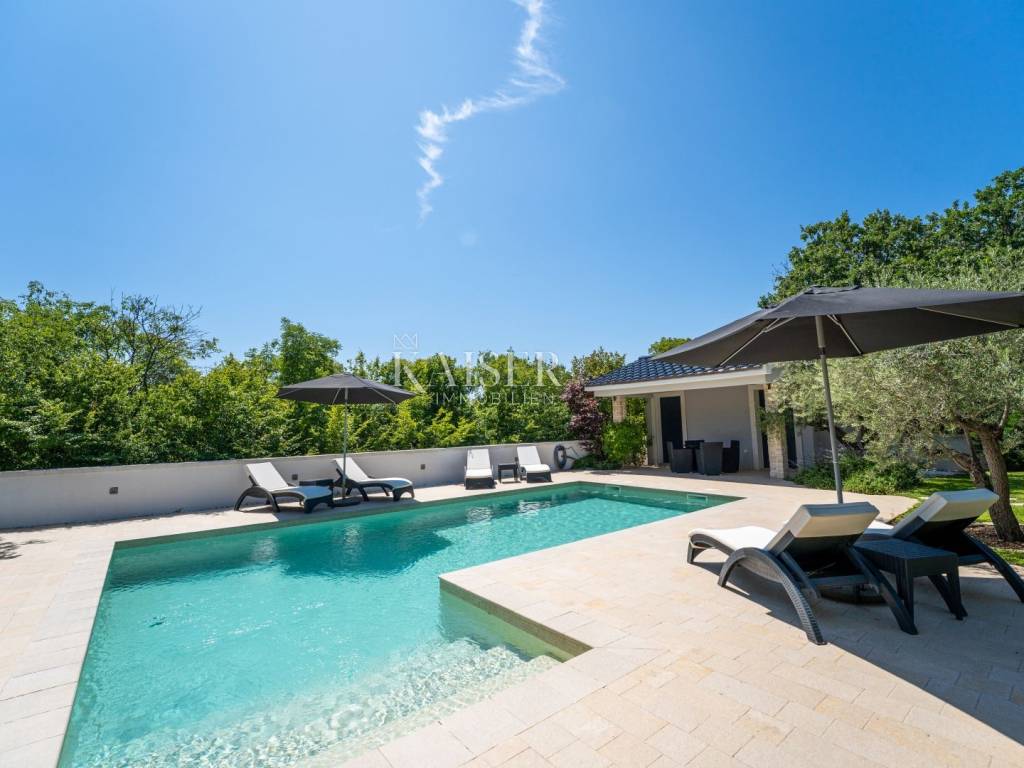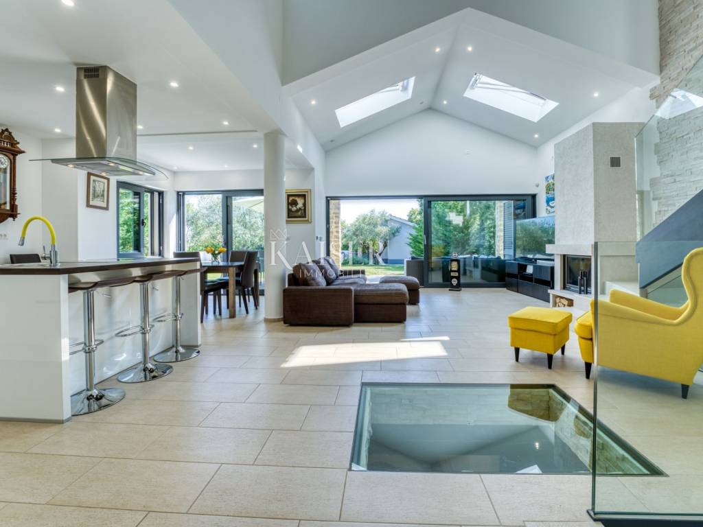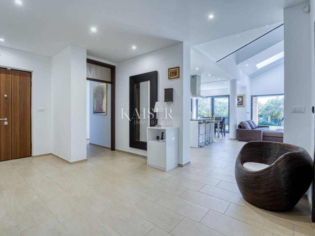 ONLY IN OUR OFFER! If you are looking for a peace that cannot be described in words, the chirping of birds in the morning, orange-colored summer evenings, the song of crickets and the intoxicating smell of greenery in the heart of a Mediterranean island, this property is the perfect choice for you. Kaiser immobilien exclusively mediates the sale of this extremely luxurious property located in the magical interior of the island of Krk in Kras, the highest settlement on the island. It is impossible to describe this villa in words, it is best to experience it up close. At first glance, the villa gives the impression of a safe, peaceful and modern family home that uses the best of modern technologies as well as traditional construction methods, which all together results in a perfect combination of harmonious design, low energy consumption and luxurious details. At the very approach to the building, in the shade of already formed trees, there is a spacious parking space. The fence that opens remotely hides a spacious fenced yard in the front part of the garden, where there is a Mediterranean garden, a row of trees and a wonderful stone well in operation. The villa is located on a fenced plot of 1,000m2 and consists of three floors, ground floor, first floor and basement, with a total living area of 290m2. It is located in a harmonious and peaceful environment, and at the same time close to all important facilities. Behind the massive entrance door we enter the entrance hall on the ground floor, which consists of an "open space" style living room that includes a living room, a kitchen and a dining room. The living room is decorated with a high ceiling that contributes to airiness and extremely good lighting with natural light, and a beautiful Palazzetti fireplace that contributes to the atmosphere and, if necessary, warms in the winter months. From the living room, through a massive aluminum glass wall, there is access to a spacious covered terrace with a view of the harmoniously arranged garden. On the ground floor there is also a guest bedroom with its own bathroom, storage room and toilet. There is also one of the special features of this property, which is a spacious 30m2 garage with a Hörmann garage door, connected to the entrance hall on the ground floor to enter the house directly from the vehicle. There are three bedrooms with their own bathrooms on the first floor, which can be reached by a staircase from the ground floor. The master bedroom and bathroom have access to the terrace with a wonderful view of the sea and the forested areas of the central part of the island. This room also has a spacious walk-in closet. The remaining two bedrooms have a common exit to the terrace and French balconies. The villa also has a basement where there is a social room with a partially glass ceiling, as well as a laundry room and a machine room. In the construction and furnishing, top quality materials were used, such as Porotherm block 35 cm in combination with 18 cm wall insulation and 24 cm roof insulation, Viesmann gas central floor heating system with wi-fi control, solar panels and fireplace connected to the central heating system, aluminum joinery and shutters, Velux windows and blinds with automatic closing in case of rain and solar power, solid stone window frames, Villeroy&Boch bathrooms. All rooms are air-conditioned. The security system consists of 6 cameras, video surveillance and an alarm connected directly to the security service provider. The Internet connection takes place via an optical cable. On the spacious and impeccably landscaped garden there is a grassy area that leads to a heated swimming pool measuring 9.5x5m covered with premium ceramics. There is also a sunbathing area, a shower, and an above-ground engine room with a robotic pool cleaner. The horticulture is carefully selected and carefully maintained, we highlight the immaculate lawn on which there are four hundred-year-old olive trees, which offer the owners the opportunity to make their own extra virgin olive oil with the amount of their fruit year after year. Another special feature of this property that makes it desirable is certainly the drinking water tank, with a capacity of 150m3, which, in combination with the copper roof gutters, provides an additional source of year-round supply of drinking water for all household members and guests. The tank for drinking water in combination with the technology and materials used in construction contribute to extremely low overheads and maintenance costs. The property is sold equipped and furnished. The commission of the agency for the buyer is 3% + VAT and is paid in case of real estate purchase, when the first legal deed is concluded. Shop: 100m Restaurants: 2000m Beach: 4000m Children's playground: 100m Airport: 15km Kars is located in the interior of the island, almost at its geographical center, at the crossroads of the roads leading from Dobrinje to Krk or Malinska. Kars is the highest settlement on the island of Krk, located 266 meters above sea level. In the immediate vicinity is the highest peak of this part of the island, Sv. Juraj, 311 m. It was first mentioned in 1230 in an old Glagolitic document. Toponomist and novelist Petar Skok derives the name Kras from the pre-Latin, possibly Illyrian word "carsus", from which the Croatian word kras, krs, developed.